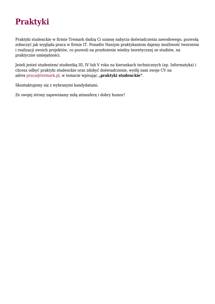 Praktyki Praktyki studenckie w firmie Tremark dadzą Ci szansę nabycia doświadczenia zawodowego, pozwolą zobaczyć jak wygląda praca w firmie IT. Ponadto Naszym praktykantom dajemy możliwość tworzenia i realizacji swoich projektów, co pozwoli na przełożenie wiedzy teoretycznej ze studiów, na praktyczne umiejętności. Jeżeli jesteś studentem/ studentką III, IV lub V roku na kierunkach technicznych (np. Informatyka) i chcesz odbyć praktyki studenckie oraz zdobyć doświadczenie, wyślij nam swoje CV na adres [email protected], w temacie wpisując „praktyki studenckie”. Skontaktujemy się z wybranymi kandydatami. Ze swojej strony zapewniamy miłą atmosferę i dobry humor!