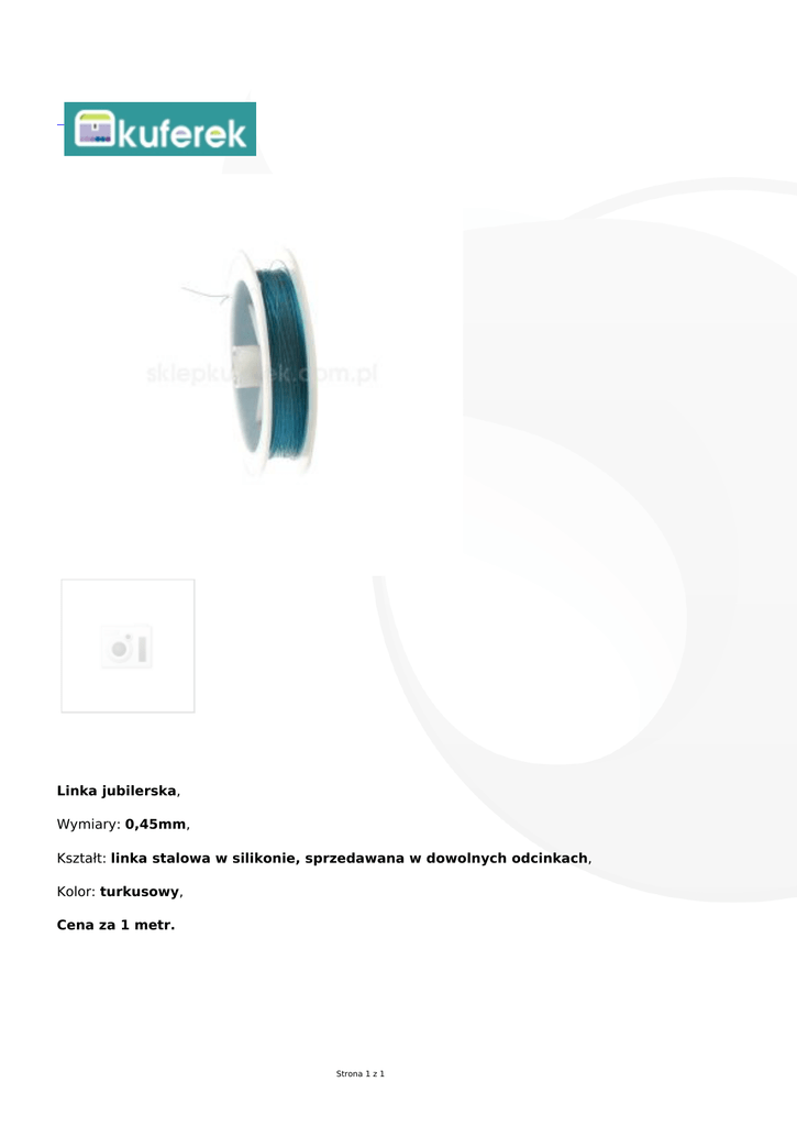 Linka jubilerska, Wymiary: 0,45mm, Kształt: linka stalowa w silikonie, sprzedawana w dowolnych odcinkach, Kolor: turkusowy, Cena za 1 metr. Strona 1 z 1