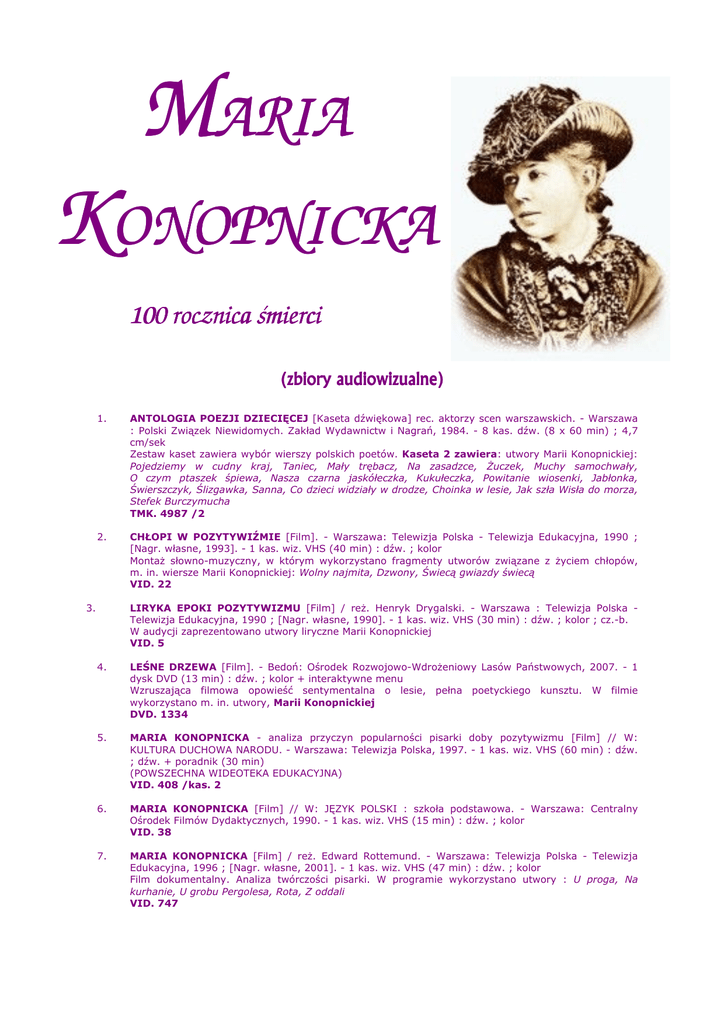 MARIA KONOPNICKA 100 rocznica śmierci (zbiory audiowizualne) 1. ANTOLOGIA POEZJI DZIECIĘCEJ [Kaseta dźwiękowa] rec. aktorzy scen warszawskich. - Warszawa : Polski Związek Niewidomych. Zakład Wydawnictw i Nagrań, 1984. - 8 kas. dźw. (8 x 60 min) ; 4,7 cm/sek Zestaw kaset zawiera wybór wierszy polskich poetów. Kaseta 2 zawiera: utwory Marii Konopnickiej: Pojedziemy w cudny kraj, Taniec, Mały trębacz, Na zasadzce, śuczek, Muchy samochwały, O czym ptaszek śpiewa, Nasza czarna jaskółeczka, Kukułeczka, Powitanie wiosenki, Jabłonka, Świerszczyk, Ślizgawka, Sanna, Co dzieci widziały w drodze, Choinka w lesie, Jak szła Wisła do morza, Stefek Burczymucha TMK. 4987 /2 2. CHŁOPI W POZYTYWIŹMIE [Film]. - Warszawa: Telewizja Polska - Telewizja Edukacyjna, 1990 ; [Nagr. własne, 1993]. - 1 kas. wiz. VHS (40 min) : dźw. ; kolor MontaŜ słowno-muzyczny, w którym wykorzystano fragmenty utworów związane z Ŝyciem chłopów, m. in. wiersze Marii Konopnickiej: Wolny najmita, Dzwony, Świecą gwiazdy świecą VID. 22 3. LIRYKA EPOKI POZYTYWIZMU [Film] / reŜ. Henryk Drygalski. - Warszawa : Telewizja Polska Telewizja Edukacyjna, 1990 ; [Nagr. własne, 1990]. - 1 kas. wiz. VHS (30 min) : dźw. ; kolor ; cz.-b. W audycji zaprezentowano utwory liryczne Marii Konopnickiej VID. 5 4. LEŚNE DRZEWA [Film]. - Bedoń: Ośrodek Rozwojowo-WdroŜeniowy Lasów Państwowych, 2007. - 1 dysk DVD (13 min) : dźw. ; kolor + interaktywne menu Wzruszająca filmowa opowieść sentymentalna o lesie, pełna poetyckiego kunsztu. W filmie wykorzystano m. in. utwory, Marii Konopnickiej DVD. 1334 5. MARIA KONOPNICKA - analiza przyczyn popularności pisarki doby pozytywizmu [Film] // W: KULTURA DUCHOWA NARODU. - Warszawa: Telewizja Polska, 1997. - 1 kas. wiz. VHS (60 min) : dźw. ; dźw. + poradnik (30 min) (POWSZECHNA WIDEOTEKA EDUKACYJNA) VID. 408 /kas. 2 6. MARIA KONOPNICKA [Film] // W: JĘZYK POLSKI : szkoła podstawowa. - Warszawa: Centralny Ośrodek Filmów Dydaktycznych, 1990. - 1 kas. wiz. VHS (15 min) : dźw. ; kolor VID. 38 7. MARIA KONOPNICKA [Film] / reŜ. Edward Rottemund. - Warszawa: Telewizja Polska - Telewizja Edukacyjna, 1996 ; [Nagr. własne, 2001]. - 1 kas. wiz. VHS (47 min) : dźw. ; kolor Film dokumentalny. Analiza twórczości pisarki. W programie wykorzystano utwory : U proga, Na kurhanie, U grobu Pergolesa, Rota, Z oddali VID. 747 8. 9. MARIA KONOPNICKA [Slajdy]. - Warszawa: Zakład Wytwórczy "Foto-Pam", 1971. - 1 komplet slajdów : 33 kl. ; cz.-b. ; 24x36 mm PF. 701 MARIA KONOPNICKA [Portret] // W: KRÓLOWIE, KSIĄśĘTA I WIELCY LUDZIE. - Wrocław: Zakład Wydawniczy "SOG", 1960. - 1 wizerunek ; cz.-b. ; 13x18 cm FOT. 41 /30 10. MARIA KONOPNICKA (1842-1910) [Fotosy]. - Warszawa: Zakład Wydawniczy "Wspólna Sprawa", 1979. - 1 komplet fotografii : 18 k. ; cz.-b. ; 30x40 cm Zestaw zawiera fotografie miejsc i osób związanych z Ŝyciem poetki oraz fotografie kart tytułowych utworów Marii Konopnickiej FOT. 12713 /1-18 11. MARIA KONOPNICKA [Fotosy]. - Warszawa: Krajowa Agencja Wydawnicza, 1986. - 1 komplet fotografii : 20 k. ; cz.-b. ; 30x20 cm FOT. 15555 ; FOT. 15556 12. MARIA KONOPNICKA (1842-1910) [Fotosy]. - Warszawa: Zakład Wydawniczy "Wspólna Sprawa", 1978. - 1 komplet fotografii : 18 k. ; cz.-b. ; 40x30 cm Biografia Marii Konopnickiej FOT. 333 /1-18 ; FOT. 2240 /1-18 ; FOT. 8584 /1-18 ; FOT. 9781 /1-18 ; FOT. 9799 /1-18 13. MARIA KONOPNICKA (1842-1910) [Fotosy]. - Warszawa : Zakład Wydawniczy "Wspólna Sprawa", 1979. - 1 komplet fotografii : 6 k. ; cz.-b. ; 30x40 cm Zestaw zawiera portrety Marii Konopnickiej FOT. 2258 /1-6 ; FOT. 12707 /1-6 14. MARIA KONOPNICKA [Portret] // W: POLSCY PISARZE I UCZENI [Fotosy]. - Warszawa: Zakład Wydawniczy "Wspólna Sprawa", 1978. - 1 k. ; cz.-b. ; 30x40 cm FOT. 6992 ; FOT. 8320 FOT. 8464 ; FOT. 8504 15. MARIA KONOPNICKA [Portret] // W: PORTRETY WIELKICH LUDZI [Fotosy]. - Warszawa: Zakład Wytwórczy "Foto-Pam", 1977. - 1 k. ; cz.-b. ; 30x40 cm FOT. 2105 ; FOT. 6181 ; FOT. 6206 ; FOT. 6967 ; FOT. 7533 16. MARYSIA I KRASNOLUDKI [Film] / scen. Zdzisław Skowroński, Jerzy Szeski ; reŜ. Jerzy Szeski, Konrad Paradowski ; obsada: Małgorzata Piekarska, Wojciech Siemion, Izabela Olszewska [i in.]. Toruń: ABOX , 2002. - 1 kas. wiz. VHS (77 min) : dźw. ; kolor (FILM DLA DZIECI I MŁODZIEśY) Filmowa adaptacja popularnej bajki Marii Konopnickiej "O krasnoludkach i sierotce Marysi" VID. 1234 17. MARYSIA I KRASNOLUDKI [Film] / reŜ. Jerzy Szeski ; scen. Jerzy Szeski, Zdzisław Skowroński ; muz. GraŜyna Bacewicz ; obsada: Małgorzata Piekarska, Wojciech Siemion, Izabela Olszewska [i in.]. Warszawa: GM Distribution , 2004, prod. 1960. - 1 dysk DVD (71 min) : dźw. stereo ; obraz 4:3 ; kolor (PLATYNOWA KOLEKCJA POLSKIEGO KINA) Adaptacja filmowa według baśni Marii Konopnickiej "O krasnoludkach i sierotce Marysi" DVD. 227 18. NA JAGODY ; SKĄD SIĘ WZIĘŁY KRASNOLUDKI [Kaseta dźwiękowa] / Maria Konopnicka ; adapt. E. Gadzińska ; reŜ. W. Opałek ; muz. Wł. Korcz, W. Mazurkiewicz ; wyk. K. Borowicz, M. Friedel, B. Kłodkowski [i in.]. - Warszawa: "Wifon", 1979. - 1 kas. dźw. (2 x 30 min) ; 4,7 cm/sek Kaseta zawiera adaptację opowiadania Marii Konopnickiej "Na jagody", oraz adaptację opowiadania "Skąd się wzięły krasnoludki" wg "O krasnoludkach i sierotce Marysi" TMK. 3903 ; TMK. 3904 19. NIEZNANA KONOPNICKA [Kaseta dźwiękowa] / oprac. Andrzej Zajączkowski. - Warszawa: Polskie Radio, 1979 ; [Nagr. własne 1993]. - 1 kas. dźw. (20 min) ; 4,7 cm/sek Ocena twórczości pisarki oraz spojrzenie na mniej znane w literaturze utwory M. Konopnickiej TMK. 5951 20. NOWELE Marii Konopnickiej // W: LEKTURY SZKOLNE . [Cz. 3] [Dokument elektroniczny]. Warszawa: Emapa, 2006. - 1 dysk optyczny (CD-ROM) : dźw. ; kolor ; 12 cm Dysk zawiera nowele Marii Konopnickiej wraz z ich omówieniem i biografią autorki CD-ROM. 66/3 21. O KRASNOLUDKACH I O SIEROTCE MARYSI [Płyta] /sł. Maria Konopnicka ; muz. Ryszard Sielicki. Warszawa: Polskie Nagrania "Muza", 