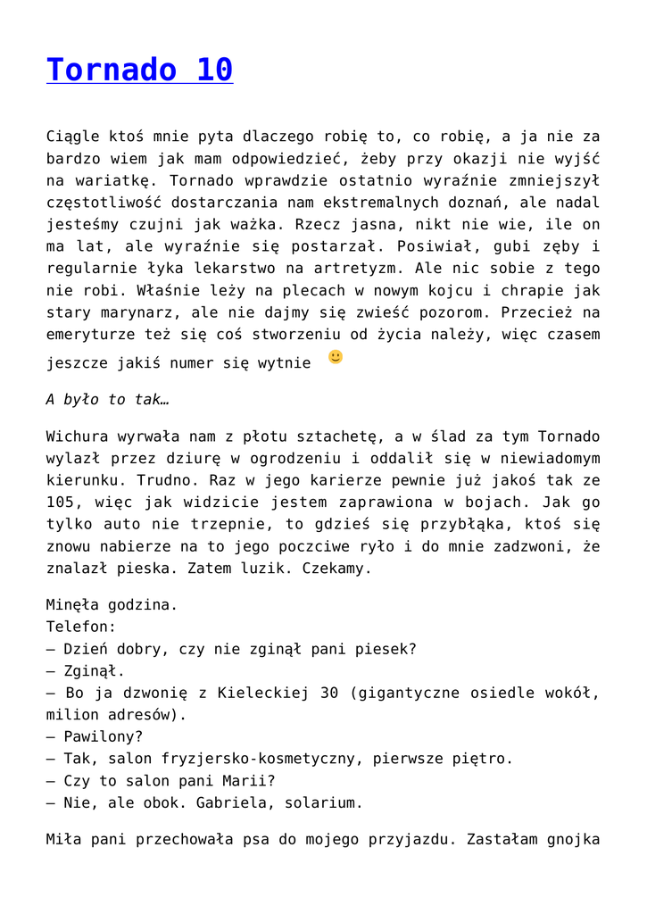Tornado 10 Ciągle ktoś mnie pyta dlaczego robię to, co robię, a ja nie za bardzo wiem jak mam odpowiedzieć, żeby przy okazji nie wyjść na wariatkę. Tornado wprawdzie ostatnio wyraźnie zmniejszył częstotliwość dostarczania nam ekstremalnych doznań, ale nadal jesteśmy czujni jak ważka. Rzecz jasna, nikt nie wie, ile on ma lat, ale wyraźnie się postarzał. Posiwiał, gubi zęby i regularnie łyka lekarstwo na artretyzm. Ale nic sobie z tego nie robi. Właśnie leży na plecach w nowym kojcu i chrapie jak stary marynarz, ale nie dajmy się zwieść pozorom. Przecież na emeryturze też się coś stworzeniu od życia należy, więc czasem jeszcze jakiś numer się wytnie A było to tak… Wichura wyrwała nam z płotu sztachetę, a w ślad za tym Tornado wylazł przez dziurę w ogrodzeniu i oddalił się w niewiadomym kierunku. Trudno. Raz w jego karierze pewnie już jakoś tak ze 105, więc jak widzicie jestem zaprawiona w bojach. Jak go tylko auto nie trzepnie, to gdzieś się przybłąka, ktoś się znowu nabierze na to jego poczciwe ryło i do mnie zadzwoni, że znalazł pieska. Zatem luzik. Czekamy. Minęła godzina. Telefon: – Dzień dobry, czy nie zginął pani piesek? – Zginął. – Bo ja dzwonię z Kieleckiej 30 (gigantyczne osiedle wokół, milion adresów). – Pawilony? – Tak, salon fryzjersko-kosmetyczny, pierwsze piętro. – Czy to salon pani Marii? – Nie, ale obok. Gabriela, solarium. Miła pani przechowała psa do mojego przyjazdu. Zastałam gnojka na kocyku, z pełną michą, w dodatku mizianego przez dwójkę dzieciaków, co to w domu pieska nie mają. Nie wiem, kto był bardziej rozanielony tym mizianiem. Dzieci czy pies. Przejęłam zbiega i chciałam jakoś się zrewanżować, ale pani odmówiła stanowczo. Trzy tygodnie później… 8.00 rano. Właśnie, połamana na maksa po wcześniejszym pilatesie, startuję ja sobie na jakiś normalny trening, żeby rozruszać bolące zwłoki… Telefon: – Dzień dobry, czy przypadkiem nie zginął pani kotek? Czarna kicia z obrożą. – Nie zginął, po okolicy łazi, więc proszę ją wypuścić. Bardzo dziękuję za zainteresowanie. Trafi do domu- strzeliłam standardową formułkę. – Bo ja dzwonię z Kieleckiej 30. Właśnie do mnie przyszła i nie chce wyjść. – Pawilony? – Tak, salon fryzjersko-kosmetyczny, pierwsze piętro. – Czy to salon pani Marii? – Nie, ale obok. Gabriela, solarium. Tutaj wypadałoby napisać „kurtyna”, ale to jeszcze nie koniec historii W przeciwieństwie do mnie, pani z salonu była w ciężkim szoku, jak mnie znowu zobaczyła. Zafasowała książkę z dedykacją i się trochę wzruszyła jak jej powiedziałam, że przecież warto być dobrym człowiekiem, a skoro moje zwierzęta tak chętnie ją odwiedzają, to na pewno coś w tym jest Całkiem niedawno znów do mnie zadzwoniła, ale już na wstępie powiedziała: – Dzień dobry, to ja. Gabriela z salonu przy Kieleckiej. Tornado znowu jest u mnie. Kurczę, dobrze, że mam jeszcze trochę tych książek No i sami powiedzcie, jak tu normalnie żyć? Pomijam już fakt, że w międzyczasie Tornado jeszcze raz się oddalił z ogrodu, mimo zasieków godnych zakładu karnego o zaostrzonym rygorze, ale odnalazł się niedaleko w spożywczaku, Behemot nam przepadł bez wieści, a Szajba złamała sobie ogon. I jeszcze otrzymałam z pięćdziesiąt telefonów, że ktoś ją „znalazł” oraz przenocowała raz u pewnej miłej pani, która zgarnęła ją do domu, bo się pętała po ulicy (tzn. kicia się pętała, a nie ta pani). Pani rozwiesiła także ogłoszenia, że szuka właściciela kici z obrożą i co chwila ktoś znajomy mi mówi, że chyba Szajbę znaleźli, bo ogłoszenia wiszą na osiedlu. Ech!, no mówię Wam…, ja czasami zwyczajnie nie wyrabiam. Rano normalnie wołam sobie kota. Naprawdę normalnie, po ludzku, wyszłam przed dom i się normalnie wydzieram: „Szajbaaaaa!!! Kici kiciiiii!!!”, a tu podchodzi do mnie jakiś facet z psem i pyta: – Przepraszam, a czy przypadkiem nie zginął pani kotek? – A wie pan co, jeszcze nie wiem. Tak sobie wołam… – Bo wie pani, widziałem właśnie ogłoszenie na słupie, że ktoś znalazł czarną kicię z obrożą i szuka właściciela. – Aaa, no tak. Zgadza się, to mój kot, ale wie pan, to już nieaktualne. To jest ogłoszenie z zeszłego tygodnia. Kurtyna…