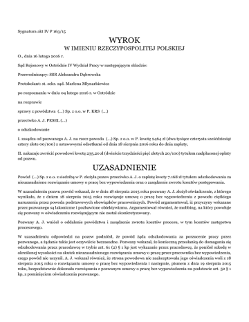 Sygnatura akt IV P 163/15 WYROK W IMIENIU RZECZYPOSPOLITEJ POLSKIEJ O., dnia 16 lutego 2016 r. Sąd Rejonowy w Ostródzie IV Wydział Pracy w następującym składzie: Przewodniczący: SSR Aleksandra Dąbrowska Protokolant: st. sekr. sąd. Marlena Młynarkiewicz po rozpoznaniu w dniu 04 lutego 2016 r. w Ostródzie na rozprawie sprawy z powództwa (...) Sp. z o.o. w P. KRS (...) przeciwko A. J. PESEL (...) o odszkodowanie I. zasądza od pozwanego A. J. na rzecz powoda (...) Sp. z o.o. w P. kwotę 2464 zł (dwa tysiące czterysta sześćdziesiąt cztery złote 00/100) z ustawowymi odsetkami od dnia 18 sierpnia 2016 roku do dnia zapłaty, II. nakazuje zwrócić powodowi kwotę 235,20 zł (dwieście trzydzieści pięć złotych 20/100) tytułem nadpłaconej opłaty od pozwu. UZASADNIENIE Powód (...) Sp. z o.o. z siedzibą w P. złożyła pozew przeciwko A. J. o zapłatę kwoty 7.168 zł tytułem odszkodowania za nieuzasadnione rozwiązanie umowy o pracę bez wypowiedzenia oraz o zasądzenie zwrotu kosztów postępowania. W uzasadnieniu pozwu powód wskazał, że w dniu 18 sierpnia 2015 roku pozwany A. J. złożył oświadczenie, z którego wynikało, że z dniem 18 sierpnia 2015 roku rozwiązuje umowę o pracę bez wypowiedzenia z powodu ciężkiego naruszenia przez powoda podstawowych obowiązków pracowniczych. Powód argumentował, iż przyczyny wskazane przez pozwanego są lakoniczne i pozbawione obiektywizmu. Argumentował również, że mobbing, na który powołuje się pozwany w oświadczeniu rozwiązującym nie został skonkretyzowany. Pozwany A. J. wniósł o oddalenie powództwa i zasądzenie zwrotu kosztów procesu, w tym kosztów zastępstwa procesowego. W uzasadnieniu odpowiedzi na pozew podniósł, że powód żąda odszkodowania za porzucenie pracy przez pozwanego, a żądanie takie jest oczywiście bezzasadne. Pozwany wskazał, że konieczną przesłanką do domagania się odszkodowania przez pracodawcę w trybie art. 61 (2) § 1 kp jest wykazanie przez pracodawcę, że poniósł szkodę w określonej wysokości na skutek nieuzasadnionego rozwiązania umowy o pracę przez pracownika bez wypowiedzenia, czego powód nie uczynił. A. J. wskazał również, że strona powodowa nie zaakceptowała jego oświadczenia woli z 18 sierpnia 2015 roku o rozwiązaniu umowy o pracę bez wypowiedzenia i następnie, pismem z dnia 19 sierpnia 2015 roku, bezpodstawnie dokonała rozwiązania z pozwanym umowy o pracę bez wypowiedzenia na podstawie art. 52 § 1 kp, z pominięciem oświadczenia pozwanego. Pismem z dnia 22 września 2015 roku powód sprostował wartość przedmiotu sporu, wskazując, że jako wartość przedmiotu sporu błędnie przyjął trzymiesięczny okres wypowiedzenia i określił wartość przedmiotu sporu na kwotę 2464 zł (jednomiesięczny okres wypowiedzenia). Pismem z dnia 01 października 2015 roku pozwany wniósł o zasądzenie kosztów procesu, również w zakresie cofniętego żądania. Sąd ustalił następujący stan faktyczny: Pozwany A. J. zatrudniony był w powodowej spółce – (...) Spółka z ograniczoną odpowiedzialnością z siedzibą w P. w okresie od 01 lipca 2014 roku do 18 sierpnia 2015 roku, na podstawie umowy o pracę na czas nieokreślony, na stanowisku mechanika, w pełnym wymiarze czasu pracy, za wynagrodzeniem 14 zł brutto za godzinę. (umowa o pracę, świadectwo pracy – część B akt osobowych – bez oznaczenia numerowego ) W dniu 18 maja 2015 roku powód wymierzył pozwanemu karę nagany z powodu przyjścia do pracy pod wpływem alkoholu w dniu 16 maja 2015 roku. (kara nagany – część B akt osobowych – bez oznaczenia numerowego ) Pismem z dnia 18 sierpnia 2015 roku pozwany rozwiązał z powodem umowę o pracę bez wypowiedzenia, jako przyczynę wskazując „złe traktowanie przez pracodawcę (co podchodzi o znęcanie się psychiczne czyli tzw. mobbing) oraz negowanie umiejętności zawodowych” (oświadczenie o rozwiązaniu umowy o pracę bez wypowiedzenia – część B akt osobowych – bez oznaczenia numerowego ) W odpowiedzi, pracodawca pismem z dnia 18 sierpnia 2015 roku uznał oświadczenie woli pozwanego z dnia 18 sierpnia 2015 roku „za bezskuteczne”. (pismo – część B akt osobowych – bez oznaczenia numerowego ) Pismem z dnia 19 sierpnia 2015 roku powód rozwiązał z pozwanym umowę o pracę bez wypowiedzenia z powodu nieuzasadnionego porzucenia pracy z dnia na dzień. (rozwiązanie umowy o pracę bez wypowiedzenia – część B akt osobowych – bez oznaczenia numerowego ) W dniu 19 sierpnia 2015 roku powód wystawił pozwanemu świadectwo o pracy, gdzie w pkt 3 wskazał, że stosunek pracy ustał na podstawie art. 52 § 1 pkt 1 kp – nieuzasadnione porzucenie pracy z dnia na dzień. (świadectwo pracy – część B akt osobowych – bez oznaczenia numerowego ) (...) Spółka z ograniczoną odpowiedzialnością z siedzibą w P. nie stosował wobec powoda mobbingu. (zeznania świadków M. B. – e – protokół z dnia 18 grudnia 2015 roku zapis 00:04:17-00:11:48, K. N. e – protokół z dnia 18 grudnia 2015 roku zapis 00:11:59-00:18:32, K. P. e – protokół z dnia 18 grudnia 2015 roku zapis 00:18:45-00:24:00) Sąd zważył co następuje: Powództwo zasługiwało na uwzględnienie. Powyższy stan faktyczny Sąd ustalił w oparciu o zgromadzone w sprawie dokumenty (w tym akta osobowe pozwanego) oraz zeznania świadków M. B., K. N. i K. P., które nie wzbudziły wątpliwości Sądu w zakresie swej wiarygodności, w pełni korespondują ze sobą i składają się na ustalony w sprawie stan faktyczny. Nie były one kwestionowane przez strony postępowania, a nadto nie zachodziły również żadne wątpliwości, co do ich formy bądź treści. Zgodnie z art. 61 1 kp w razie nieuzasadnionego rozwiązania przez pracownika umowy o pracę bez wypowiedzenia na podstawie art. 55 § 1 1 kp, pracodawcy przysługuje roszczenie o odszkodowanie. O odszkodowaniu orzeka sąd pracy. Stosownie do art. 61 2 § 1 kp odszkodo