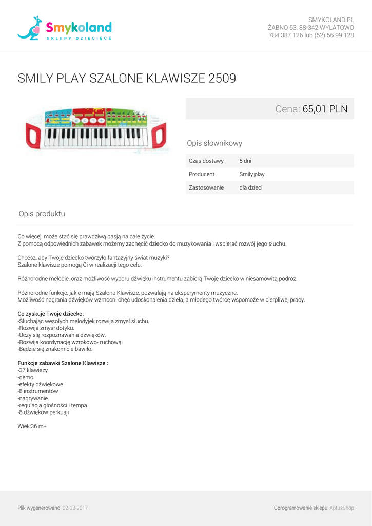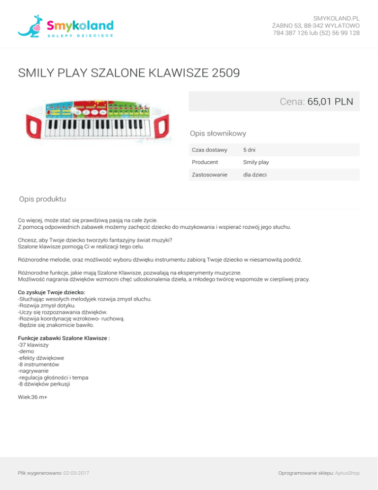 SMYKOLAND.PL ŻABNO 53, 88-342 WYLATOWO 784 387 126 lub (52) 56 99 128 SMILY PLAY SZALONE KLAWISZE 2509 Cena: 65,01 PLN Opis słownikowy Czas dostawy 5 dni Producent Smily play Zastosowanie dla dzieci Opis produktu Co więcej, może stać się prawdziwą pasją na całe życie. Z pomocą odpowiednich zabawek możemy zachęcić dziecko do muzykowania i wspierać rozwój jego słuchu. Chcesz, aby Twoje dziecko tworzyło fantazyjny świat muzyki? Szalone klawisze pomogą Ci w realizacji tego celu. Różnorodne melodie, oraz możliwość wyboru dźwięku instrumentu zabiorą Twoje dziecko w niesamowitą podróż. Różnorodne funkcje, jakie mają Szalone Klawisze, pozwalają na eksperymenty muzyczne. Możliwość nagrania dźwięków wzmocni chęć udoskonalenia dzieła, a młodego twórcę wspomoże w cierpliwej pracy. Co zyskuje Twoje dziecko: -Słuchając wesołych melodyjek rozwija zmysł słuchu. -Rozwija zmysł dotyku. -Uczy się rozpoznawania dźwięków. -Rozwija koordynację wzrokowo- ruchową. -Będzie się znakomicie bawiło. Funkcje zabawki Szalone Klawisze : -37 klawiszy -demo -efekty dźwiękowe -8 instrumentów -nagrywanie -regulacja głośności i tempa -8 dźwięków perkusji Wiek:36 m+ Plik wygenerowano: 02-03-2017 Powered by TCPDF (www.tcpdf.org) Oprogramowanie sklepu: AptusShop