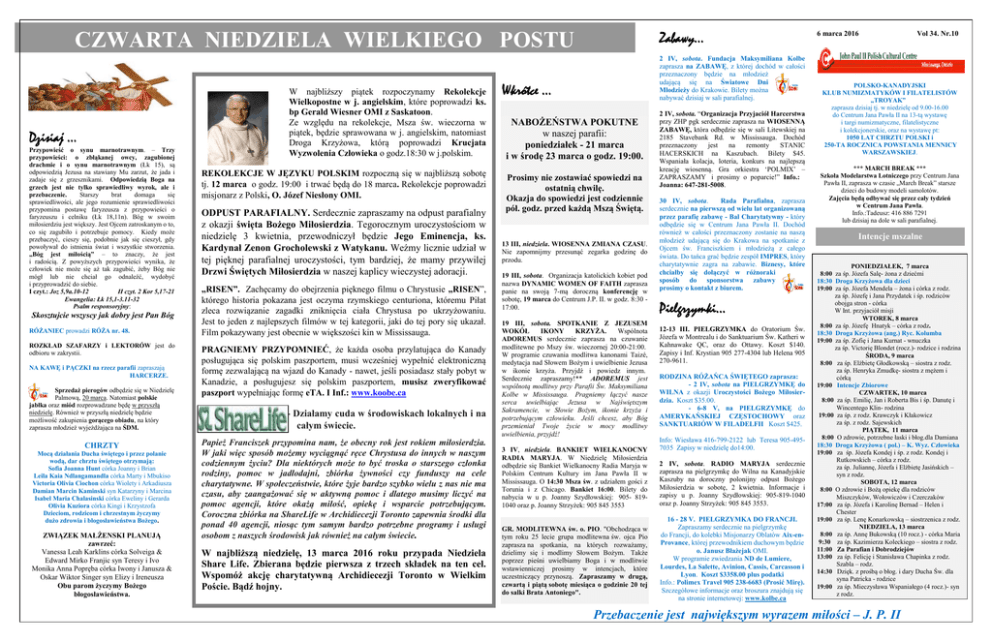 Zabawy… CZWARTA NIEDZIELA WIELKIEGO POSTU W najbliższy piątek rozpoczynamy Rekolekcje Wielkopostne w j. angielskim, które poprowadzi ks. bp Gerald Wiesner OMI z Saskatoon. Ze względu na rekolekcje, Msza św. wieczorna w piątek, będzie sprawowana w j. angielskim, natomiast Droga Krzyżowa, którą poprowadzi Krucjata Wyzwolenia Człowieka o godz.18:30 w j.polskim. Dzisiaj … Przypowieść o synu marnotrawnym. – Trzy przypowieści: o zbłąkanej owcy, zagubionej drachmie i o synu marnotrawnym (Łk 15), są odpowiedzią Jezusa na stawiany Mu zarzut, że jada i zadaje się z grzesznikami. Odpowiedzią Boga na grzech jest nie tylko sprawiedliwy wyrok, ale i przebaczenie. Starszy brat domaga się sprawiedliwości, ale jego rozumienie sprawiedliwości przypomina postawę faryzeusza z przypowieści o faryzeuszu i celniku (Łk 18,11n). Bóg w swoim miłosierdziu jest większy. Jest Ojcem zatroskanym o to, co się zagubiło i potrzebuje pomocy. Kiedy może przebaczyć, cieszy się, podobnie jak się cieszył, gdy powoływał do istnienia świat i wszystkie stworzenia. „Bóg jest miłością” – to znaczy, że jest i radością. Z powyższych przypowieści wynika, że człowiek nie może się aż tak zagubić, żeby Bóg nie mógł lub nie chciał go odnaleźć, wydobyć i przyprowadzić do siebie. I czyt.: Joz 5,9a.10-12 II czyt. 2 Kor 5,17-21 Ewangelia: Łk 15,1-3.11-32 Psalm responsoryjny: Skosztujcie wszyscy jak dobry jest Pan Bóg RÓŻANIEC prowadzi RÓŻA nr. 48. ROZKŁAD SZAFARZY i LEKTORÓW jest do odbioru w zakrystii. NA KAWĘ i PĄCZKI na rzecz parafii zapraszają HARCERZE. Sprzedaż pierogów odbędzie się w Niedzielę Palmową, 20 marca. Natomiast polskie jabłka oraz miód rozprowadzane będę w przyszłą niedzielę. Również w przyszłą niedzielę będzie możliwość zakupienia gorącego obiadu, na który zaprasza młodzież wyjeżdżająca na ŚDM. CHRZTY Mocą działania Ducha świętego i przez polanie wodą, dar chrztu świętego otrzymają: Sofia Joanna Hunt córka Joanny i Brian Leila Kaia Ndlangamandla córka Marty i Mbukiso Victoria Olivia Ciochon córka Wiolety i Arkadiusza Damian Marcin Kaminski syn Katarzyny i Marcina Isabel Maria Chalasinski córka Eweliny i Gerarda Olivia Kuziora córka Kingi i Krzystzofa Dzieciom, rodzicom i chrzestnym życzymy dużo zdrowia i błogosławieństwa Bożego. ZWIĄZEK MAŁŻENSKI PLANUJĄ zawrzeć: Vanessa Leah Karklins córka Solveiga & Edward Mirko Franjic syn Teresy i Ivo Monika Anna Popręba córka Iwony i Janusza & Oskar Wiktor Singer syn Elizy i Ireneusza Obu parom życzymy Bożego błogosławieństwa. REKOLEKCJE W JĘZYKU POLSKIM rozpoczną się w najbliższą sobotę tj. 12 marca o godz. 19:00 i trwać będą do 18 marca. Rekolekcje poprowadzi misjonarz z Polski, O. Józef Niesłony OMI. ODPUST PARAFIALNY. Serdecznie zapraszamy na odpust parafialny z okazji święta Bożego Miłosierdzia. Tegorocznym uroczystościom w niedzielę 3 kwietnia, przewodniczył będzie Jego Eminencja, ks. Kardynał Zenon Grocholewski z Watykanu. Weźmy licznie udział w tej pięknej parafialnej uroczystości, tym bardziej, że mamy przywilej Drzwi Świętych Miłosierdzia w naszej kaplicy wieczystej adoracji. „RISEN”. Zachęcamy do obejrzenia pięknego filmu o Chrystusie „RISEN”, którego historia pokazana jest oczyma rzymskiego centuriona, któremu Piłat zleca rozwiązanie zagadki zniknięcia ciała Chrystusa po ukrzyżowaniu. Jest to jeden z najlepszych filmów w tej kategorii, jaki do tej pory się ukazał. Film pokazywany jest obecnie w większości kin w Mississauga. PRAGNIEMY PRZYPOMNIEĆ, że każda osoba przylatująca do Kanady posługująca się polskim paszportem, musi wcześniej wypełnić elektroniczną formę zezwalającą na wjazd do Kanady - nawet, jeśli posiadasz stały pobyt w Kanadzie, a posługujesz się polskim paszportem, musisz zweryfikować paszport wypełniając formę eTA. I Inf.: www.koobe.ca SHARE LIFE całym świecie... - Działamy cuda w środowiskach lokalnych i na całym świecie. Papież Franciszek przypomina nam, że obecny rok jest rokiem miłosierdzia. W jaki więc sposób możemy wyciągnąć ręce Chrystusa do innych w naszym codziennym życiu? Dla niektórych może to być troska o starszego członka rodziny, pomoc w jadłodajni, zbiórka żywności czy funduszy na cele charytatywne. W społeczeństwie, które żyje bardzo szybko wielu z nas nie ma czasu, aby zaangażować się w aktywną pomoc i dlatego musimy liczyć na pomoc agencji, które okażą miłość, opiekę i wsparcie potrzebującym. Coroczna zbiórka na ShareLife w Archidiecezji Toronto zapewnia środki dla ponad 40 agencji, niosąc tym samym bardzo potrzebne programy i usługi osobom z naszych środowisk jak również na całym świecie. W najbliższą niedzielę, 13 marca 2016 roku przypada Niedziela Share Life. Zbierana będzie pierwsza z trzech składek na ten cel. Wspomóż akcję charytatywną Archidiecezji Toronto w Wielkim Poście. Bądź hojny. 2 IV, sobota. Fundacja Maksymiliana Kolbe zaprasza na ZABAWĘ, z której dochód w całości przeznaczony będzie na młodzież udającą się na Światowe Dni Młodzieży do Krakowie. Bilety można nabywać dzisiaj w sali parafialnej. Wkrótce … NABOŻEŃSTWA POKUTNE w naszej parafii: poniedziałek - 21 marca i w środę 23 marca o godz. 19:00. Prosimy nie zostawiać spowiedzi na ostatnią chwilę. Okazja do spowiedzi jest codziennie pół. godz. przed każdą Mszą Świętą. 13 III, niedziela. WIOSENNA ZMIANA CZASU. Nie zapomnijmy przesunąć zegarka godzinę do przodu. 19 III, sobota. Organizacja katolickich kobiet pod nazwa DYNAMIC WOMEN OF FAITH zaprasza panie na swoją 7-mą doroczną konferencję w sobotę, 19 marca do Centrum J.P. II. w godz. 8:30 17:00. 19 III, sobota. SPOTKANIE Z JEZUSEM WOKÓŁ IKONY KRZYŻA. Wspólnota ADOREMUS serdecznie zaprasza na czuwanie modlitewne po Mszy św. wieczornej 20:00-21:00. W programie czuwania modlitwa kanonami Taizé, medytac