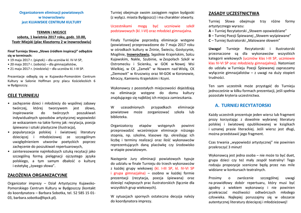 Organizatorem eliminacji powiatowych w Inowrocławiu jest KUJAWSKIE CENTRUM KULTURY TERMIN i MIEJSCE sobota, 1 kwietnia 2017 roku, godz. 10.00, Teatr Miejski (plac Klasztorny 2 w Inowrocławiu) Finał Turnieju Słowa „Słowo źródłem inspiracji” odbędzie się w terminach: • 19 maja 2017 r. (piątek) – dla uczniów kl. IV-VI SP, • 20 maja 2017 r. (sobota) – dla gimnazjalistów, • 21 maja 2017 r. (niedziela) – dla uczniów kl. I-III SP. Prezentacje odbędą się w Kujawsko-Pomorskim Centrum Kultury w Salonie Hoffman przy placu Kościeleckich 6 w Bydgoszczy. CELE TURNIEJU • zachęcenie dzieci i młodzieży do wspólnej zabawy twórczej, której tworzywem jest słowo, inspirowanie do twórczych poszukiwań indywidualnych sposobów artystycznej wypowiedzi ze wskazaniem na takie formy jak: recytacja, poezja śpiewana i sztuki plastyczne (ilustracja), • popularyzacja polskiej i światowej literatury dziecięcej i młodzieżowej ze szczególnym uwzględnieniem utworów poetyckich poprzez zachęcenie do poszukiwań repertuarowych, • zainteresowanie najmłodszych sztuką recytacji jako szczególną formą pielęgnacji ojczystego języka polskiego, a tym samym dbałość o kulturę i estetykę „żywego słowa”. ZAŁOŻENIA ORGANIZACYJNE Organizator imprezy – Dział Artystyczny KujawskoPomorskiego Centrum Kultury w Bydgoszczy (kontakt do koordynatora – Barbara Sobotka, tel. 52 585 15 0103, [email protected]). Turniej obejmuje swoim zasięgiem region bydgoski (z wyłącz. miasta Bydgoszcz) i ma charakter otwarty. Uczestnikami mogą być uczniowie szkół podstawowych (kl. I-VI) oraz młodzież gimnazjalna. Finały Turniejów poprzedzą eliminacje wstępne (powiatowe) przeprowadzone do 7 maja 2017 roku w ośrodkach kultury w Żninie, Świeciu, Gostycynie, Mogilnie, Inowrocławiu, Sępólnie Krajeńskim, Solcu Kujawskim, Nakle, Szubinie, w Zespołach Szkół w Ostromecku i Sicienku, w GOK w Nowej Wsi Wielkiej, w CK „Zamek” w Nowem nad Wisłą, CK „Ziemowit” w Kruszwicy oraz M-GOK w Koronowie, Mroczy, Kamieniu Krajeńskim i Kcyni. Wykonawcy z pozostałych miejscowości dojeżdżają na eliminacje wstępne do domu kultury znajdującego się najbliżej ich miejsca zamieszkania. W uzasadnionych przypadkach eliminacje powiatowe może zorganizować szkoła lub biblioteka. Organizatorzy etapów wstępnych powinni przeprowadzić wcześniejsze eliminacje niższego stopnia, np. szkolne, klasowe itp. określając ich liczbę i terminy realizacji oraz ilość wykonawców reprezentujących daną placówkę czy środowisko w etapie powiatowym. Następnie Jury eliminacji powiatowych typuje do udziału w finale Turnieju do trzech wykonawców z każdej grupy wiekowej (kl. I-III SP, kl. IV-VI SP i grupa gimnazjalna) – osobno w każdej formie prezentacji (recytacja, poezja śpiewana) oraz dziesięć najlepszych prac ilustratorskich (łącznie dla wszystkich grup wiekowych). W sytuacjach spornych ostateczna decyzja należy do koordynatora imprezy. ZASADY UCZESTNICTWA Turniej Słowa obejmuje trzy różne formy artystycznego wyrazu: A – Turniej Recytatorski „Słowem opowiedziane” B – Turniej Poezji Śpiewanej „Słowem wyśpiewane” C – Turniej Ilustratorski „Malowane słowem” Uwaga! Turnieje Recytatorski i Ilustratorski przeznaczone są dla wykonawców wszystkich kategorii wiekowych (uczniów klas I-III SP, uczniowie klas IV-VI SP oraz młodzieży gimnazjalnej). Natomiast do udziału w Turnieju Poezji Śpiewanej zapraszamy wyłącznie gimnazjalistów – z uwagi na duży stopień trudności. Ten sam uczestnik może przystąpić do Turnieju jednocześnie w kilku formach prezentacji, jeśli spełnia pozostałe kryteria uczestnictwa. A. TURNIEJ RECYTATORSKI Każdy uczestnik prezentuje jeden wiersz lub fragment prozy korzystając z dowolnie wybranej literatury polskiej i światowej opublikowanej w książkach i uznanej prasie literackiej. Jeśli wiersz jest długi, można przedstawić jego fragment. Czas trwania „wypowiedzi artystycznej” nie powinien przekroczyć 3 minut! Wykonawcą jest jedna osoba – nie może to być duet, grupa dzieci czy też mały zespół teatralny! Tego rodzaju propozycje sceniczne będą przez nas mile widziane w konkursach teatralnych. Prosimy o zwrócenie szczególnej uwagi na prawidłowy dobór repertuaru, który musi być zgodny z wiekiem wykonawcy i nie powinien przekraczać możliwości odtwórczych młodego człowieka. Najlepiej poruszajmy się w obszarze autentycznej literatury dziecięcej i młodzieżowej! W odniesieniu do formy prezentacji – preferowane będą propozycje skupione na słowie mówionym – prosimy nie stosować zabiegów teatralizacji. B. TURNIEJ POEZJI ŚPIEWANEJ Wykonawca prezentuje jeden utwór śpiewany oparty na tekście poetyckim. Może to być propozycja zapożyczona z repertuaru znanych wykonawców poezji śpiewanej lub utwór skomponowany przez samego uczestnika lub inną osobę – nieprofesjonalistę. Mile widziany będzie żywy akompaniament, a nie podkład z taśmy. Jednak soliście może towarzyszyć jedynie mały, maksymalnie trzyosobowy zespół. Szczególnie cenne będą własne (inne) pomysły interpretacyjne znanych przebojów. JURY, NAGRODY... Prezentacje finałowe oceniać będzie Jury powołane przez organizatorów, w skład którego wejdą fachowcy z dziedziny literatury i kultury „żywego słowa”, aktorzy, muzycy i artyści plastycy. Po wysłuchaniu wszystkich wykonawców i obejrzeniu nadesłanych prac plastycznych Jury przyzna wyróżnienia i nagrody rzeczowe w trzech odrębnych formach prezentacji (recytacja, poezja śpiewana i ilustracja) zachowując jednocześnie podział na kategorie wiekowe. SEKRETARIAT ELIMINACJI POWIATOWYCH W INOWROCŁAWIU Czas prezentacji – około 5 minut. C. TURNIEJ ILUSTRATORSKI Uczestnik tego Turnieju proponuje jedną lub maksymalnie trzy prace plastyczne wykonane w dowolnej technice – będące ilustracjami wierszy lub prozy dziecięcej i młodzieżowe