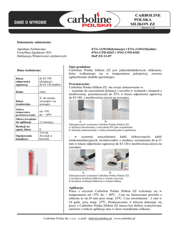 CARBOLINE POLSKA SILIKON ZZ Strona 1 z 4 Dokumenty odniesienia: Aprobata Techniczna: Certyfikat Zgodności WE: Deklaracja Właściwości użytkowych: Dane techniczne: Klasa odporności ogniowej do EI 180 (dylatacje) do EI 120 (kable) Kolor szary Klasa środowiska X- do użytku wewnątrz i na zewnątrz Zakres temperatury przechowywania od +5⁰C do + 30⁰C Okres trwałości do aplikacji 12 miesięcy Reakcji na ogień, klasa Opakowanie handlowe E 310 ml, 20 sztuk w kartonie ETA-12/0118(dylatacje) i ETA-13/0123(kable) 0761-CPD-0265 i 0761-CPD-0302 DoP ZZ-12-07 Opis produktu: Carboline Polska Silikon ZZ jest jednoskładnikowym silikonem, który wulkanizuje się w temperaturze pokojowej, zawiera ogniochronne dodatki pęczniejące . Przeznaczenie: Carboline Polska Silikon ZZ ma swoje zastosowanie w: - systemie do uszczelnień dylatacji i szczelin w ścianach i stropach z możliwością przemieszczeń do 25% w klasie odporności ogniowej do EI 180 z możliwością użycia na zewnątrz, a. b. Zabezpieczenie systemem Carboline Polska Silikon ZZ: a/ dylatacji dwustronnej z zatyczkami PE jako wypełnianie b/ dylatacji jednostronnej z wełną mineralną jako wypełnienie - w systemie uszczelniania kabli elektrycznych, kabli telekomunikacyjnych, światłowodów o średnicy zewnętrznej do ø 21 mm w klasie odporności ogniowej do EI 120 z możliwością użycia na zewnątrz. a. b. Zabezpieczenie systemem Carboline Polska Silikon ZZ: a/ przejścia instalacji kablowej w ścianie sztywnej b/ przejścia instalacji kablowej w ścianie lekkiej Aplikacja: Prace z użyciem Carboline Polska Silikon ZZ wykonuje się w temperaturze od +5⁰C do + 30⁰C. Czas na formowanie powłoki z silikonu to ok.10 min przy temp. 23⁰C. Czas utwardzenia : 2 mm w 24 godz. przy temp. 23⁰C. Pomieszczenie w którym dokonuje się prace z Carboline Polska Silikon ZZ musza być dobrze wentylowane zarówno z trakcie aplikacji oraz w fazie twardnienia silikonu. Carboline Polska Sp. z o.o. , e-mail : [email protected] , www.carboline.pl CARBOLINE POLSKA SILIKON ZZ Strona 2 z 4 Aplikacja krok po kroku PRZEPUSTY KABLOWE Zabezpieczenia ogniochronne przejeść instalacyjnych kabli przy użyciu Carboline Polska Silikon ZZ należy tworzyć zgodnie z ETA- 13/0123. 1.Przed aplikacją silikonu kable należy oczyścić z zanieczyszczeń i odkurzyć. Powierzchnie stykające się z silikonem powinny być wyrównane, wolne od kurzu, rdzy, tłuszczu i luźnych zanieczyszczeń. 2. Jako materiał wypełniający można użyć wełny mineralnej, płyty gipsowo-kartonowej , zatyczek polietylenowych . Należy zapewnić odpowiednią dla danego zastosowania, zgodną z aprobatą minimalną głębokość wypełnienia ogniochronnym Carboline Polska Silikonem ZZ . W przypadku dodania nowego elementu do istniejącego przejścia kablowego: za pomocą odpowiednich narzędzi należy zrobić odpowiedniej wielkości otwór w istniejącym przejściu. Ubytki lub luki wokół nowo dodanych elementów tudzież luki powstałe w wyniku usunięcia kabli powinny być zabezpieczone Carboline Polska Silikon ZZ. Należy upewnić się, że nowododane elementy są uwzględnione w aprobacie. 3. Do uszczelnienia większych powierzchni w stropach zaleca się użycia od dolnej strony stropu osłony np. z płyty gipsowo-katronowej. 4. Cartige silikonu wyposażony jest w stożkowy aplikator (dyszę) służącą do dozowania. Należy odciąć nożem koniec części gwintowej cartriga, na którą należy nakręcić aplikator. W przypadku konieczności aplikator może być skrócony. 5. Silikon należy włożyć w pistolet do iniekcji. 6. Wypełnij jednolicie przestrzenie zabezpieczanego przejścia w sposób od wewnątrz do zewnątrz przejścia. Można użyć również środka wygładzającego który jest kompatybilny z Carboline Polska Silikon ZZ. 7. W celu odpowiedniego wykonania zabezpieczenia należy w tym samym czasie wyciskać silikon oraz wygładzać go np. przy pomocy szpachelki. Wygładzanie musi być zgodne z czasem na wykonanie powłoki. 8. Po zakończeniu prac należy oznaczyć wykonane przejście METRYCZKĄ INFORMACYJNĄ dołączoną do Carboline Polska Silikon ZZ Schemat graficzny 1 5 3 2 6 4 7 Carboline Polska Sp. z o.o. , e-mail : [email protected] , www.carboline.pl CARBOLINE POLSKA SILIKON ZZ Strona 3 z 4 Tabela przejść kablowych zabezpieczonych Carboline Polska Silikon ZZ Rodzaj przegrody Minimalna szerokość przegrody Ściana sztywna: Gazobeton, beton, beton zbrojony, mur 100 mm Ściana lekka: Słupy drewniane lub stalowe obustronnie obłożone 100 mm Strop: gazobeton, beton, beton zbrojony 100 mm Klasa odporności Ogniowej EI 120 Minimalna grubość uszczelnienia przejść instalacji kablowej Minimalna głębokość wypełnienia 150 mm 2 x 15 mm 150 mm 2 x 15 mm Maksymalny otworu wymiar 100 x 100 (mm) Ø113 mm EI 90 EI 120 100 x 100 (mm) Ø113 mm EI 90 EI 120 150 mm 2 x 15 mm 100 x 100 (mm) Ø113 mm EI 120 Aplikacja krok po kroku ZŁĄCZA LINIOWE I DYLATACJE Uszczelnienia złączy i dylatacji przy użyciu Carboline Polska Silikon ZZ należy tworzyć zgodnie z ETA- 12/0118. 1.Przed aplikacją silikonu należy upewnić się czy materiał dylatacji jest kompatybilny z uszczelniaczem. Powierzchnie należy oczyścić z zanieczyszczeń i odkurzyć. Powierzchnie stykające się z silikonem powinny być wyrównane, wolne od kurzu, rdzy, tłuszczu i luźnych zanieczyszczeń, resztek cementu, farby itp. Złącza powinny posiadać odpowiednią określoną możliwość przemieszczeń bocznych i ścinających. 2. Należy dobrać materiał wypełnienia. Odpowiednia głębokość szczeliny musi być zachowana do wypełnienia Carboline Polska Silikon ZZ. Jeśli używa się jako wypełnienia wełny mineralnej, powinno użyć się plastra wełny przyciętego z nadmiarem na poszerzenie się go , po czym wcisnąć plaster w szczelinę. 3. Przy podłożu chłonnym i mineralnym oraz w przypadku złączy o dużym narażeniu na mechaniczne naciski zaleca się użycie podkładu (Otto 