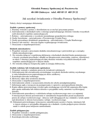 Ośrodek Pomocy Społecznej ul. Pocztowa 6a 48-100 Głubczyce telef. 485 85 15 485 29 22 Jak uzyskać świadczenie z Ośrodka Pomocy Społecznej? Należy złożyć następujące dokumenty: Zasiłek z pomocy społecznej 1. Pisemny wniosek o pomoc z określeniem na co ma być przyznana pomoc. 2. Zaświadczenia o dochodach netto z miesiąca poprzedzającego złożenie wniosku wszystkich osób dorosłych wspólnie zamieszkujacych. 3. Rolnicy - zaświadczenie o wysokości posiadanego gospodarstwa rolnego. 4. Osoby bezrobotne - zaświadczenie z Powiatowego Urzędu Pracy. 5. Osoby prowadzące działalność gospodarczą - zaświadczenie z Urzędu Skarbowego. 6. Emeryci lub renciści - decyzja organu wypłacającego świadczenie. 7. Orzeczenie o niepełnosprawności. Dodatek mieszkaniowy 1. Wypełnić wniosek o przyznanie dodatku mieszkaniowego i potwierdzić go u zarządcy lokalu mieszkaniowego. 2. Do wniosku dołączyć wypełnioną deklarację o dochodach (dochód brutto pomniejszony o koszty uzyskania przychodu i składki na ubezpieczenie emerytalne, rentowe, chorobowe) za okres 3 miesięcy poprzedzających datę złożenia wniosku wszystkich dorosłych osób wspólnie zamieszkujących w danym lokalu. 3. Do wniosku dołączyć książeczkę opłat za energię elektryczną. Zasiłek rodzinny lub świadczenie opiekuńcze 1. Wypełnić wniosek o ustalenie prawa do świadczeń rodzinnych. 2. Zaświadczenia lub oświadczenia stwierdzające wysokość dochodu rodziny uzyskanego w roku kalendarzowym poprzedzającym okres zasiłkowy. 3. Kserokopia dowodu osobistego. 4. Skrócony odpis aktu urodzenia dziecka. 5. Orzeczenie o niepełnosprawności. 6. Zaświadczenie szkoły o uczęszczaniu dziecka do szkoły ponadgimnazjalnej. 7. Informacja sądu o toczącym się postępowaniu w sprawie o przysposobienie dziecka. 8. Kopia odpisu prawomocnego wyroku sądu orzekającego rozwód lub separację albo kopię aktu zgonu małżonka lub rodzica dziecka w przypadku osoby samotnie wychowującej dziecko. 9. Zaświadczenie pracodawcy o udzieleniu urlopu wychowawczego oraz o co najmniej 6-miesięcznym okresie pozostawania w zatrudnieniu bezpośrednio przed uzyskaniem prawa do urlopu wychowawczego - dotyczy osób ubiegających się o dodatek z tytułu opieki nad dzieckiem w okresie korzystania z urlopu wychowawczego. 10. Dokument potwierdzający tymczasowe zameldowanie ucznia w bursie, internacie lub w innym miejscu w przypadku ubiegania się o dodatek z tytułu podjęcia przez dziecko nauki w szkole poza miejscem zamieszkania. Zasiłek pielęgnacyjny 1. Wypełnić wniosek o zasiłek pielęgnacyjny. 2. Orzeczenie o niepełnosprawności. 3. Kserokopia dowodu osobistego. Pobyt w ośrodku wsparcia (Dom Dziennego Pobytu, Środowiskowy Dom Samopomocy) 1. Pisemny wniosek. 2. Zaświadczenia o dochodach netto z miesiąca poprzedzającego złożenie wniosku wszystkich osób dorosłych wspólnie zamieszkujacych. 3. Rolnicy - zaświadczenie o wysokości posiadanego gospodarstwa rolnego. 4. Osoby bezrobotne - zaświadczenie z Powiatowego Urzędu Pracy. 5. Osoby prowadzące działalność gospodarczą - zaświadczenie z Urzędu Skarbowego. 6. Emeryci lub renciści - decyzja organu wypłacającego świadczenie. 7. Orzeczenie o niepełnosprawności. Usługi opiekuńcze nad chorym w domu 1. Pisemny wniosek. 2. Zaświadczenia o dochodach netto z miesiąca poprzedzającego złożenie wniosku wszystkich osób dorosłych wspólnie zamieszkujacych. 3. Rolnicy - zaświadczenie o wysokości posiadanego gospodarstwa rolnego. 4. Osoby bezrobotne - zaświadczenie z Powiatowego Urzędu Pracy. 5. Osoby prowadzące działalność gospodarczą - zaświadczenie z Urzędu Skarbowego. 6. Emeryci lub renciści - decyzja organu wypłacającego świadczenie. 7. Zaświadczenie lekarskie, że osoba wymaga pomocy w formie usług opiekuńczych. 2
