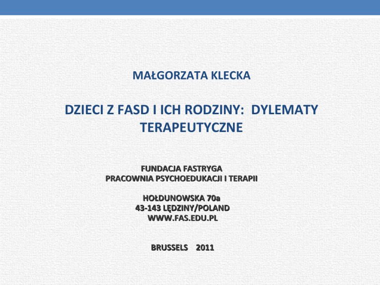 MAŁGORZATA KLECKA DZIECI Z FASD I ICH RODZINY: DYLEMATY TERAPEUTYCZNE FUNDACJA FASTRYGA PRACOWNIA PSYCHOEDUKACJI I TERAPII HOŁDUNOWSKA 70a 43-143 LĘDZINY/POLAND WWW.FAS.EDU.PL BRUSSELS 2011 TERATOGENNE DZIAŁANIE ALKOHOLU NA PŁÓD • FAS (900 URODZEŃ/ROK) – PRENATALNE I POSTNATALNE OPÓŹNIENIE WZROSTU – DEFICYTY OUN – CECHY DYSMORFICZNE TWARZY • SKRÓCONE SZPARY POWIEKOWE • SPŁASZCZONA ŚRODKOWA CZĘŚĆ TWARZY • CIENKA GÓRNA WARGA Błędne informacje w mediach Przykładowa błędna informacja z Internetu:„Picie alkoholu w ciąży uspokaja dziecko. Matka będzie mieć z nim mniej kłopotów” ???????????? Umiarkowane spożycie alkoholu w pierwszym trymestrze ciąży powoduje, że dziecko po urodzeniu jest spokojniejsze i bardziej zrównoważone umysłowo, niż dzieci matek, które alkohol odstawiły kompletnie. Do takich wniosków doszli australijscy naukowcy z Telethon Institute fo rChild Health Research po obserwacji 2,3 tys. ciężarnych na przestrzeni 14 lat – czytamy na topnews.co.uk. Pod sformułowaniem "umiarkowane picie" kryje się kieliszek wina dziennie przez pierwsze trzy miesiące ciąży. Kobiety, które stosowały się do tej zasady urodziły dzieci bardziej stabilne emocjonalnie i sprawiające mniej problemów wychowawczych. badanie proszą jednak kobiety,by nie sugerowałysięwynikami, gdyż brano pod uwagę wpływ alkoholu jedynie na jeden aspekt zdrowia dziecka – dodaje serwis”. DZIECI Z FASD: różnorodność symptomów uszkodzenia oun + tragiczna historia życia Polska wersja 4-digit diagnostic code jest już dostępna www.fasdpn.org DZIECI Z FASD: • Mają źle funkcjonujące zmysły: wzrok, słuch, propriocepcję, dotyk, równowagę • Funkcje poznawcze: pamięć, uwaga, • Mają trudności z dokończeniem zadań • Nie pamiętają informacji • Mogą kogoś uderzyć • Mogą nie rozumieć intencji • Mogą podejmować ryzykowne działania • Nie przewidują niebezpieczeństwa Jak im pomóc • Brak zrozumienia dla zachowań dzieci z FASD behaviors może doprowadzić do odrzucenia dziecka. Program FAStryga (znaczenie ang.: “zszywać”, “łączyć”) powstał, by wspierać rodziny. Podstawę programu stanowi rozbudowany preces diagnostyczny, któego celem jest ustalenie propozycji terapeutycznej. Program FAStryga to: 1. Szczegółowa medyczna i rozwojowa historia życia dziecka. 2. Profil neurorozwojowy (badanie sensomotoryczne, ocena stylu przywiązania). 3.Wspieranie funkcji metabolicznych. 4.Ocena sytuacji psychologicznej całej rodziny I wsparcie. Pomoc dla rodziny = pomoc dla dzieci Rodziny zastępcze/adopcyjne • Dlaczego chcę pomagać innym? Jakie są moje motywacje? • Czego oczekuję od dziecka, rodziny przyjaciół? • Jak daję sobie radę ze stratami? • Czy nadal wierzę, że moja miłość może „uzdrowić” dziecko? • Czy rozumiem, że dziecko ma ograniczenia rozwojowe? Jeśli planowałeś podróż do Paryża, ale twój samolot wylądował w Katowicach, wciąż masz co najmniej dwa wyjścia: możesz się złościć i żałować, że nie jesteś w Paryżu, albo zacząć próbę odkrywania piękna Katowic. DZIĘKUJĘ BARDZO! WWW.FAS.EDU.PL