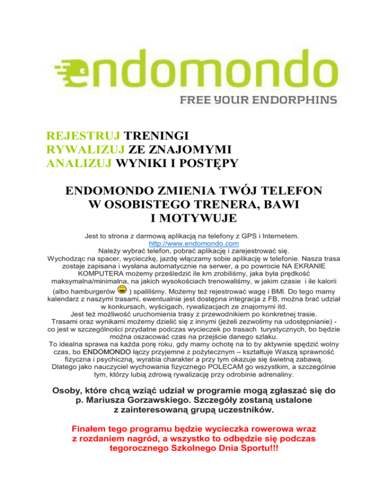 REJESTRUJ TRENINGI RYWALIZUJ ZE ZNAJOMYMI ANALIZUJ WYNIKI I POSTĘPY ENDOMONDO ZMIENIA TWÓJ TELEFON W OSOBISTEGO TRENERA, BAWI I MOTYWUJE Jest to strona z darmową aplikacją na telefony z GPS i Internetem. http://www.endomondo.com Należy wybrać telefon, pobrać aplikację i zarejestrować się. Wychodząc na spacer, wycieczkę, jazdę włączamy sobie aplikację w telefonie. Nasza trasa zostaje zapisana i wysłana automatycznie na serwer, a po powrocie NA EKRANIE KOMPUTERA możemy prześledzić ile km zrobiliśmy, jaka była prędkość maksymalna/minimalna, na jakich wysokościach trenowaliśmy, w jakim czasie i ile kalorii (albo hamburgerów ) spaliliśmy. Możemy też rejestrować wagę i BMI. Do tego mamy kalendarz z naszymi trasami, ewentualnie jest dostępna integracja z FB, można brać udział w konkursach, wyścigach, rywalizacjach ze znajomymi itd. Jest też możliwość uruchomienia trasy z przewodnikiem po konkretnej trasie. Trasami oraz wynikami możemy dzielić się z innymi (jeżeli zezwolimy na udostępnianie) co jest w szczególności przydatne podczas wycieczek po trasach turystycznych, bo będzie można oszacować czas na przejście danego szlaku. To idealna sprawa na każda porę roku, gdy mamy ochotę na to by aktywnie spędzić wolny czas, bo ENDOMONDO łączy przyjemne z pożytecznym – kształtuje Waszą sprawność fizyczna i psychiczną, wyrabia charakter a przy tym okazuje się świetną zabawą. Dlatego jako nauczyciel wychowania fizycznego POLECAM go wszystkim, a szczególnie tym, którzy lubią zdrową rywalizację przy odrobinie adrenaliny. Osoby, które chcą wziąć udział w programie mogą zgłaszać się do p. Mariusza Gorzawskiego. Szczegóły zostaną ustalone z zainteresowaną grupą uczestników. Finałem tego programu będzie wycieczka rowerowa wraz z rozdaniem nagród, a wszystko to odbędzie się podczas tegorocznego Szkolnego Dnia Sportu!!!