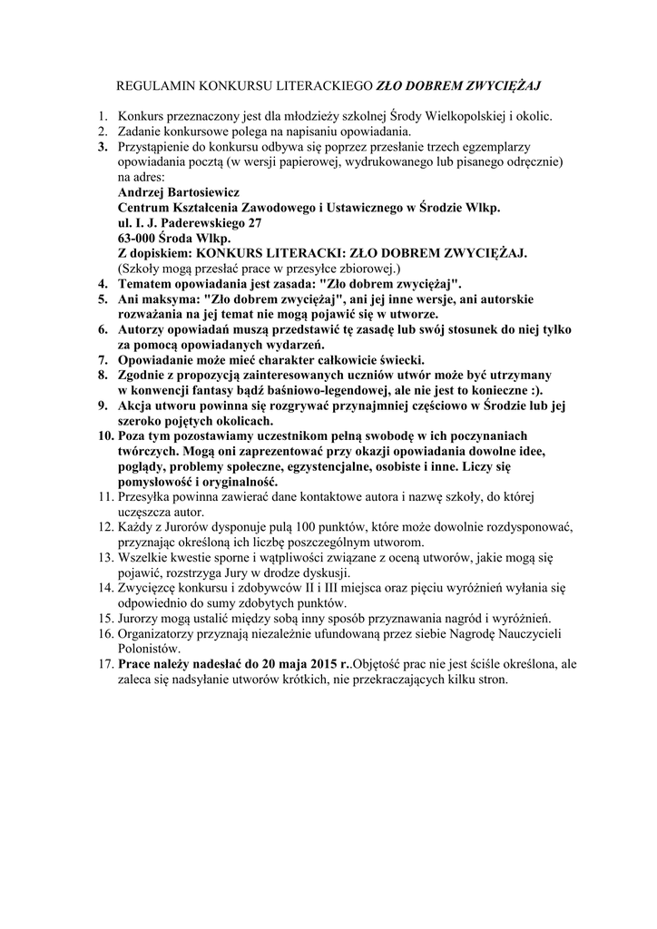 REGULAMIN KONKURSU LITERACKIEGO ZŁO DOBREM ZWYCIĘŻAJ 1. Konkurs przeznaczony jest dla młodzieży szkolnej Środy Wielkopolskiej i okolic. 2. Zadanie konkursowe polega na napisaniu opowiadania. 3. Przystąpienie do konkursu odbywa się poprzez przesłanie trzech egzemplarzy opowiadania pocztą (w wersji papierowej, wydrukowanego lub pisanego odręcznie) na adres: Andrzej Bartosiewicz Centrum Kształcenia Zawodowego i Ustawicznego w Środzie Wlkp. ul. I. J. Paderewskiego 27 63-000 Środa Wlkp. Z dopiskiem: KONKURS LITERACKI: ZŁO DOBREM ZWYCIĘŻAJ. (Szkoły mogą przesłać prace w przesyłce zbiorowej.) 4. Tematem opowiadania jest zasada: "Zło dobrem zwyciężaj". 5. Ani maksyma: "Zło dobrem zwyciężaj", ani jej inne wersje, ani autorskie rozważania na jej temat nie mogą pojawić się w utworze. 6. Autorzy opowiadań muszą przedstawić tę zasadę lub swój stosunek do niej tylko za pomocą opowiadanych wydarzeń. 7. Opowiadanie może mieć charakter całkowicie świecki. 8. Zgodnie z propozycją zainteresowanych uczniów utwór może być utrzymany w konwencji fantasy bądź baśniowo-legendowej, ale nie jest to konieczne :). 9. Akcja utworu powinna się rozgrywać przynajmniej częściowo w Środzie lub jej szeroko pojętych okolicach. 10. Poza tym pozostawiamy uczestnikom pełną swobodę w ich poczynaniach twórczych. Mogą oni zaprezentować przy okazji opowiadania dowolne idee, poglądy, problemy społeczne, egzystencjalne, osobiste i inne. Liczy się pomysłowość i oryginalność. 11. Przesyłka powinna zawierać dane kontaktowe autora i nazwę szkoły, do której uczęszcza autor. 12. Każdy z Jurorów dysponuje pulą 100 punktów, które może dowolnie rozdysponować, przyznając określoną ich liczbę poszczególnym utworom. 13. Wszelkie kwestie sporne i wątpliwości związane z oceną utworów, jakie mogą się pojawić, rozstrzyga Jury w drodze dyskusji. 14. Zwycięzcę konkursu i zdobywców II i III miejsca oraz pięciu wyróżnień wyłania się odpowiednio do sumy zdobytych punktów. 15. Jurorzy mogą ustalić między sobą inny sposób przyznawania nagród i wyróżnień. 16. Organizatorzy przyznają niezależnie ufundowaną przez siebie Nagrodę Nauczycieli Polonistów. 17. Prace należy nadesłać do 20 maja 2015 r..Objętość prac nie jest ściśle określona, ale zaleca się nadsyłanie utworów krótkich, nie przekraczających kilku stron.