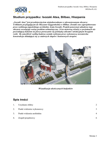 Studium przypadku: Isozaki Atea, Bilbao, Hiszpania SP028a-PL-EU Studium przypadku: Isozaki Atea, Bilbao, Hiszpania „Isozaki Atea” jest przedsięwzięciem niejednorodnym w zdewastowanym obszarze Uribitarte przylegającym do Muzeum Guggenheima w Bilbao. Zostało ono zaprojektowane przez wybitnego japońskiego architekta Arata Isozaki. Projekt ponownej zabudowy tego obszaru rozwiązuje waŜny problem urbanistyczny, 14-to metrową róŜnicę w poziomach nie pozwalającą ludziom na piesze poruszanie się pomiędzy ulicami i atrakcyjnym brzegiem rzeki. By umoŜliwić szybką budowę została wybrana przez wykonawcę nowatorska konstrukcja składająca się ze stalowych słupów i betonowych stropów. Wizualizacja ukończonych budynków Spis treści 1. Uzyskane efekty 2 2. Punkt widzenia wykonawcy 3 3. Punkt widzenia architekta 4 4. Zespół projektowy 6 Strona 1 Studium przypadku: Isozaki Atea, Bilbao, Hiszpania SP028a-PL-EU 1. Uzyskane efekty 77 000 m2 powierzchni uŜytkowej w sercu Bilbao. Dwa wieŜowce o wysokości 82 m. 5 innych mniejszych budynków. Obszar przeznaczony dla pieszych z ciągiem schodów o szerokości 35 m. 22 kondygnacje z 317 mieszkaniami, sklepy, biura, 783 miejsca parkingowe i obszary do uŜytku publicznego. UŜycie nowatorskich słupów stalowych, Ŝelbetowych stropów, by przyśpieszyć proces budowy. Czas montaŜu konstrukcji: 11 miesięcy. MontaŜ jednej kondygnacji w 1 tydzień. 1 800 ton konstrukcji stalowej wykonanej z kształtowników gorąco walcowanych. Rys. 1.1 Widok placu budowy pod koniec wznoszenia konstrukcji (lipiec 2006) Strona 2 Studium przypadku: Isozaki Atea, Bilbao, Hiszpania SP028a-PL-EU 2. Punkt widzenia wykonawcy Eduardo Galnares, UTE URIBITARTE Wykonanie montaŜu mieszanej konstrukcji stalowo – betonowej zabrało 11 miesięcy. MoŜliwe było wykonanie kompletnej kondygnacji (800 m2 powierzchni uŜytkowej) w ciągu jednego tygodnia z dwóch powodów: UŜycie specjalnego deskowania, które skróciło czas potrzebny do wykonania poszczególnych stropów. UŜycie słupów o długości 10,5 m. Połączenie pomiędzy słupami i stropem wykonano za pośrednictwem prostej płyty głowicowej i łączników montaŜowych spawanych do słupów w czasie wykonywania warsztatowego (patrz Rys. 2.1. Wzniesienie konstrukcji wymagało tylko krótkiego czasu, a szybki montaŜ słupów zwalniał dźwigi do innych prac. Po wzniesieniu słupów moŜna było wykonać końcowe połączenia techniką spawania. Te dwa czynniki pozwoliły na uzyskanie Ŝądnego stopnia uprzemysłowienia i prefabrykacji, co zmniejszyło zakres prac na placu budowy znacznie przyśpieszyło wzniesienie budynków. Rys. 2.1 Etapy wznoszenia słupów i wykonania ich połączeń – uzupełnienie wcześniejszych Strona 3 Studium przypadku: Isozaki Atea, Bilbao, Hiszpania SP028a-PL-EU uwag Do zabezpieczenia przeciwpoŜarowego uŜyto niepalnych płyt okładzinowych, tak by spełnić wymagania krajowe. Płyty okładzinowe są łatwe w montaŜu, są wkomponowane w ściany zewnętrzne pomieszczeń i w ścianki działowe. 3. Punkt widzenia architekta Diego Martín, Architekt, BOMA S.L. Całe przedsięwzięcie to dwa place budowy; “Depósito Franco” jest częścią istniejącej konstrukcji z czterema kondygnacjami podziemnymi. Zostały one pozostawione jako parking samochodowy, a nowa konstrukcja powstała na górze, tworząc dwa ustroje konstrukcyjne o róŜnych układach, w których nie pasował rozstaw słupów.. Łącznik tych dwóch ustrojów to spręŜony strop betonowy uŜyty wspólnie z Ŝelbetowymi słupami i fundamentami poniŜej.. Z tej przyczyny podstawowym wymaganiem była lekkość, a konstrukcja stalowa pomogła w uzyskaniu Ŝądanego minimalnego cięŜaru tak by uniknąć przeciąŜenia konstrukcji fundamentów. Drugi plac budowy, obok “Depósito Franco”, mieści dwie nowo wybudowane kondygnacje podziemne na fundamentach palowych, na których to wybudowano wieŜowce i ciąg schodów. By zapewnić stateczność wybrano rozwiązanie z centralnym trzonem betonowym. Jest on utworzony przez ściany szybów windowych i połączony jest z najbliŜszymi słupami fasady tworząc zespolony stalowo-betonowy trzon centralny. Rys. 3.1 Betonowy trzon centralny nowej konstrukcji. UŜyto głównie stropów zbrojonych jednokierunkowo, tam gdzie geometria stropu była bardzo nieregularna konieczne było zastosowanie sztywnego zbrojenia betonu. Strona 4 Studium przypadku: Isozaki Atea, Bilbao, Hiszpania SP028a-PL-EU Na wieŜowce wybrano dwa typy konstrukcji. Do trzeciej kondygnacji uŜyto Ŝelbetu, powyŜej, dla kondygnacji mieszkalnych, zastosowano słupy stalowe. Pokazane jest to na Rys. 3.1. Rys. 3.2 śelbet i stalowe słupy jako część tej samej konstrukcji. Połączenia pomiędzy słupami a stropem wykonano przez wspawanie krótkich profili stalowych do kolumn, które przenoszą obciąŜenia ścinające z Ŝeber Ŝelbetowej płyty stropowej Rys. 3.3 Połączenie pomiędzy stalowymi słupami a Ŝelbetowymi stropami. Słupy mają długość 10,5 m (co odpowiada trzem kondygnacjom) i wykonane są ze stalowych kształtowników gorąco walcowanych. W niŜszych kondygnacjach są one wzmocnione nakładkami pomiędzy oboma półkami, tworzącymi przekrój skrzynkowy. Nie było to potrzebne w słupach w wyŜszej części, i uŜyto samych dwuteowników szeroko stopowych HE. Zastosowanie słupów stalowych zaoszczędziło istotnie czas poświecony na wzniesienie budynku poniewaŜ montaŜ słupów prowadzono z wyprzedzeniem, przed betonowaniem Strona 5 Studium przypadku: Isozaki Atea, Bilbao, Hiszpania SP028a-PL-EU stropów, tylko jeden raz na trzy tygodnie. Całkowita szybkość budowy to jedna kondygnacja (800 m2) tygodniowo. Inną zaletą uŜycia słupów stalowych była ich mniejsza powierzchnia w porównaniu ze słupami betonowymi. W mieszkaniach róŜnica ta jest kluczowa ze względu na właściwe rozplanowanie przestrzeni wewnętrznej. 4. Zespół projektowy Właściciel: IBAIBIDE, S.A. –