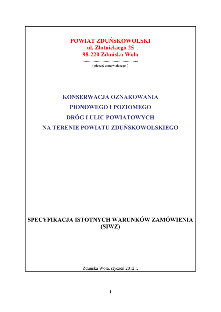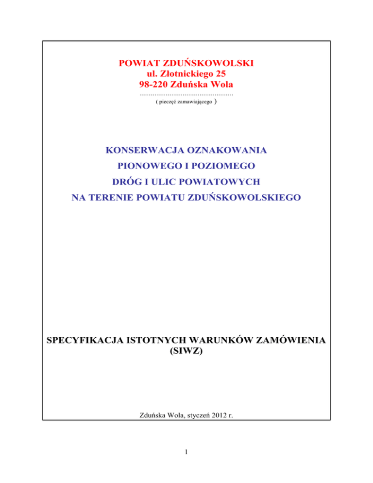 POWIAT ZDUŃSKOWOLSKI ul. Złotnickiego 25 98-220 Zduńska Wola .................................................. ( pieczęć zamawiającego ) KONSERWACJA OZNAKOWANIA PIONOWEGO I POZIOMEGO DRÓG I ULIC POWIATOWYCH NA TERENIE POWIATU ZDUŃSKOWOLSKIEGO SPECYFIKACJA ISTOTNYCH WARUNKÓW ZAMÓWIENIA (SIWZ) Zduńska Wola, styczeń 2012 r. 1 I. Znak Sprawy: DF-II.272.2.2012 II. Zamawiający: Powiat Zduńskowolski ul Złotnickiego 25 98-220 Zduńska Wola Regon: 730 934 795 NIP: 829 16 24 435 III. Tryb udzielania zamówienia publicznego: Zamówienie ma formę przetargu nieograniczonego, ogłoszonego w oparciu o ustawę z dnia 29 stycznia 2004 r. Prawo zamówień publicznych (tekst jednolity: Dz. U. z 2010 r. Nr 113, poz. 759 z późn. zm.) zwanej dalej ustawą Pzp. Wartość zamówienia mieści się poniżej wartości wskazanej w Rozporządzeniu Prezesa Rady Ministrów z 16 grudnia 2011 r. (Dz. U. Nr 282, poz. 1649) w sprawie kwot wartości zamówień oraz konkursów, od których jest uzależniony obowiązek przekazywania ogłoszeń Urzędowi Publikacji Unii Europejskiej, opublikowanym na podstawie delegacji art. 11 ust. 8 ustawy Pzp. IV. Opis przedmiotu zamówienia: Konserwacja oznakowania pionowego i poziomego dróg i ulic powiatowych na terenie powiatu zduńskowolskiego. Zamówienie obejmuje realizację zadania na wszystkich drogach i ulicach powiatowych na terenie powiatu zduńskowolskiego. Oznaczenie za pomocą Wspólnego Słownika Zamówień (CPV) : Główny przedmiot zamówienia 34.92.21.00-7 - Oznakowanie drogowe Dodatkowe przedmioty zamówienia 45.23.32.90-8 - Instalowanie znaków drogowych 45.23.32.21-4 - Malowanie nawierzchni V. Termin realizacji zamówienia: Od 1 lutego 2012 r. do 31 grudnia 2012 r. VI. Nie dopuszcza się składania ofert częściowych, wariantowych lub równoważnych. VII. Zamawiający przewiduje udzielenie zamówienia uzupełniającego, do 20% wartości przedmiotu zamówienia podstawowego. Zamawiający dopuszcza możliwość udzielenia zamówień uzupełniających w trybie art. 67 ust. 1 pkt 6 ustawy Pzp do wielkości nieprzekraczającej 20% wartości zamówienia podstawowego. VIII. Warunki udziału w postępowaniu oraz opis sposobu dokonywania oceny spełnienia tych warunków: Warunki udziału: O udzielenie zamówienia ubiegać się mogą Wykonawcy (osoby fizyczne, prawne, bądź jednostki organizacyjne nie posiadające osobowości prawnej) spełniający warunki określone w art. 22 ust. 1 ustawy Pzp: 2 1. posiadają uprawnienia do wykonywania określonej działalności lub czynności: Opis sposobu dokonania oceny tego warunku. Wykonawca winien przedłożyć wyciąg z aktu rejestracji firmy (koncesja, zezwolenie lub licencja), potwierdzający profil działania Wykonawcy odpowiadający przedmiotowi zamówienia; 2. posiadają odpowiednią wiedzę i doświadczenia do wykonania zamówienia: Opis sposobu dokonania oceny tego warunku. Wykonawca winien wykazać, że w okresie ostatnich pięciu lat zrealizował samodzielnie, lub w konsorcjum co najmniej 2 zadania o charakterze porównywalnym z przedmiotem zamówienia (tj.: wykaz usług z zakresu oznakowania pionowego i poziomego lub robót drogowych wraz z wykonaniem usług z zakresu oznakowania pionowego i poziomego na realizowanych robotach) oraz potwierdzenie, iż te usługi z zakresu oznakowania pionowego i poziomego lub roboty drogowe wraz z wykonaniem usług z zakresu oznakowania pionowego i poziomego na realizowanych robotach zostały wykonane lub są wykonywane należycie. 3. dysponują odpowiednim potencjałem technicznym: Opis sposobu dokonania oceny tego warunku. Wykonawca winien przedłożyć oświadczenie, że dysponuje wystarczającym do realizacji zadania potencjałem sprzętowym. Zamawiający przyjmując prawdziwość złożonego oświadczenia pozytywnie oceni spełnienie tego warunku. 4. dysponują osobami zdolnymi do wykonania zamówienia: Opis sposobu dokonania oceny tego warunku. Wykonawca winien przedłożyć oświadczenie, że dysponuje odpowiednio wykwalifikowaną kadrą w celu obsadzenia wymaganych do realizacji zadania stanowisk. Zamawiający przyjmując prawdziwość złożonego oświadczenia pozytywnie oceni spełnienie tego warunku. 5. są w odpowiedniej sytuacji ekonomicznej i finansowej: Opis sposobu dokonania oceny tego warunku. Zamawiający oceni pozytywnie spełnienie tego warunku, jeżeli: 1) Wykonawca złoży oświadczenie, że znajduje się w odpowiedniej sytuacji ekonomicznej i finansowej do realizacji zamówienia, 2) Wykonawca jest ubezpieczony od odpowiedzialności cywilnej w zakresie prowadzenia działalności związanej z przedmiotem zamówienia. IX. Informacja o oświadczeniach lub dokumentach jakie mają dostarczyć Wykonawcy w celu potwierdzenia spełniania warunków udziału w postępowaniu oraz niepodlegania wykluczeniu na podstawie art. 24 ust. 1 ustawy Pzp. 1. W zakresie wykazania spełniania przez Wykonawcę warunków, o których mowa w art. 22 ust 1 ustawy Pzp Wykonawca przedkłada oświadczenie o spełnieniu warunków udziału w postępowaniu (załącznik nr 5 do SIWZ pn.: Oświadczenie art. 22 PZP) oraz następujące dokumenty: 1) wyciąg z aktu rejestracji firmy (koncesja, zezwolenie lub licencja), potwierdzający profil działania Wykonawcy odpowiadający przedmiotowi zamówienia; 3 2) wykaz co najmniej 2 zadań o charakterze porównywalnym z przedmiotem zamówienia (tj.: wykaz usług z zakresu oznakowania pionowego i poziomego lub robót drogowych wraz z wykonaniem usług z zakresu oznakowania pionowego i poziomego na realizowanych robotach) do wykazania spełniania warunku wiedzy i doświadczenia, wykonanych w okresie ostatnich pięciu lat przed upływem terminu składania ofert, a jeżeli okres prowadzenia działalności jest krótszy – w tym okresie, z podaniem ich rodzaju i wartości, dat (czasu) oraz miejsca wykonania i odbiorców oraz załączeniem dokumentu potwierdzającego, iż te usługi z zakresu oznakowania pionowego i poziomego zostały wykonane lub są