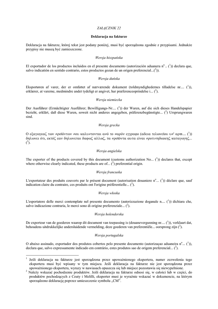 ZAŁĄCZNIK 22 Deklaracja na fakturze Deklaracja na fakturze, której tekst jest podany poniŜej, musi być sporządzona zgodnie z przypisami. JednakŜe przypisy nie muszą być zamieszczone. Wersja hiszpańska El exportador de los productos incluidos en el presente documento (autorización aduanera no... (1)) declara que, salvo indicatión en sentido contrario, estos productos gozan de un origen preferencial...(2)). Wersja duńska Eksportøren af varer, der er omfattet af nærværende dokument (toldmyndighedernes tilladelse nr.... (1)), erklærer, at varerne, medmindre andet tydeligt er angivet, har præferenceoprindelse i... (2). Wersja niemiecka Der Ausführer (Ermächtigter Ausführer; Bewilligungs-Nr.... (1)) der Waren, auf die sich dieses Handelspapier bezieht, erklärt, daß diese Waren, soweit nicht anderes angegeben, präferenzbegünstigte... (2) Ursprungwaren sind. Wersja grecka O εξαγωγεαζ των πρoϊóντων πoυ καλυπτoνται απó τo παρóν εγγραϕo (αδεια τελωνεϊoυ υπ' αρϖ.... (1)) δηλωνει óτι, εκτóζ εαν δηλωνεται δαϕωζ αλλωζ, τα πρoϊóντα αυτα εiναι πρoτιµηδιακηζ καταγωγηζ... (2). Wersja angielska The exporter of the products covered by this document (customs authorization No... (1)) declares that, except where otherwise clearly indicated, these products are of... (2) preferential origin. Wersja francuska L'exportateur des produits couverts par le présent document (autorisation douaniere no... (1)) déclare que, sauf indication claire du contraire, ces produits ont l'origine préférentielle... (2). Wersja włoska L'esportatore delle merci contemplate nel presente documento (autorizzazione doganale n.... (1)) dichiara che, salvo indicazione contraria, le merci sono di origine preferenziale... (2). Wersja holenderska De exporteur van de goederen waarop dit document van toepassing is (douanevergunning nr.... (1)), verklaart dat, behoudens uitdrukkelijke andersluidende vermelding, deze goederen van preferentiële... oorsprong zijn (2). Wersja portugalska O abaixo assinado, exportador dos produtos cobertos pelo presente documento (autorizaçao aduaneira no... (1)), declara que, salvo expressamente indicado em contrário, estes produtos sao de origem preferencial... (2). 1 2 Jeśli deklaracja na fakturze jest sporządzona przez upowaŜnionego eksportera, numer zezwolenia tego eksportera musi być wpisany w tym miejscu. Jeśli deklaracja na fakturze nie jest sporządzona przez upowaŜnionego eksportera, wyrazy w nawiasach opuszcza się lub miejsce pozostawia się niewypełnione. NaleŜy wskazać pochodzenie produktów. Jeśli deklaracja na fakturze odnosi się, w całości lub w części, do produktów pochodzących z Ceuty i Melilli, eksporter musi je wyraźnie wskazać w dokumencie, na którym sporządzono deklarację poprzez umieszczenie symbolu „CM”. Wersja fińska Tässä asiakirjassa mainittujen tuotteiden viejä (tullin lupan:o... (1)) ilmoittaa, että nämä tuotteet ovat, ellei toisin ole selvästi merkitty, etuuskohteluun oikeutettuja... alkuperätuotteita (2). Wersja szwedzka Exportören av de varor som omfattas av detta dokument (tullmyndighetens tillstand nr.... (1)) försäkrar att dessa varor, om inte annat tydligt markerats, har förmansberättigande... ursprung (2). .......................................................................... (miejsce i data)3 .......................................................................... (podpis eksportera, dodatkowo czytelnie nazwisko osoby podpisującej deklarację4) 3 4 Te oznaczenia mogą być opuszczone jeśli informacja na ten temat jest zawarta w dokumencie. Patrz art. 117 ust. 5. W przypadkach gdy nie jest wymagany podpis eksportera, zwolnienie z obowiązku złoŜenia podpisu powoduje równieŜ zwolnienie z obowiązku podania nazwiska osoby podpisującej.”