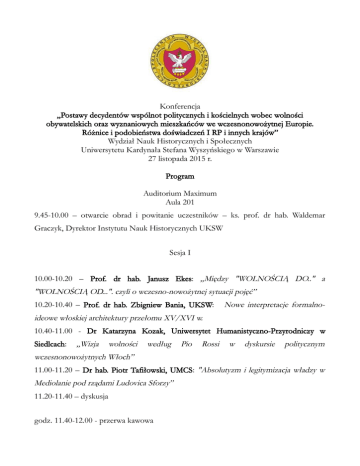Konferencja „Postawy decydentów wspólnot politycznych i kościelnych wobec wolności obywatelskich oraz wyznaniowych mieszkańców we wczesnonowożytnej Europie. Różnice i podobieństwa doświadczeń I RP i innych krajów” Wydział Nauk Historycznych i Społecznych Uniwersytetu Kardynała Stefana Wyszyńskiego w Warszawie 27 listopada 2015 r. Program Auditorium Maximum Aula 201 9.45-10.00 – otwarcie obrad i powitanie uczestników – ks. prof. dr hab. Waldemar Graczyk, Dyrektor Instytutu Nauk Historycznych UKSW Sesja I 10.00-10.20 – Prof. dr hab. Janusz Ekes: „Między "WOLNOŚCIĄ DO.." a "WOLNOŚCIĄ OD...". czyli o wczesno-nowożytnej sytuacji pojęć” 10.20-10.40 – Prof. dr hab. Zbigniew Bania, UKSW: Nowe interpretacje formalno- ideowe włoskiej architektury przełomu XV/XVI w. 10.40-11.00 - Dr Katarzyna Kozak, Uniwersytet Humanistyczno-Przyrodniczy w Siedlcach: „Wizja wolności według Pio Rossi w dyskursie politycznym wczesnonowożytnych Włoch” 11.00-11.20 – Dr hab. Piotr Tafiłowski, UMCS: "Absolutyzm i legitymizacja władzy w Mediolanie pod rządami Ludovica Sforzy” 11.20-11.40 – dyskusja godz. 11.40-12.00 - przerwa kawowa Sesja II 12.00-12.20 – Dr Valentin Constantinov, Academia de Ştiinţe a Moldovei: „Bojarzy mołdawscy i ich prawa obywatelskie – między prawem ziemskim a polskim modelem szlacheckim” 12.20.-12.40 – Prof. dr hab. Włodzimierz Marciniak, Akademii Ignatianum w Krakowie: „Postawy pierwszych Romanowów wobec wolności obywatelskich oraz wyznaniowych mieszkańców państwa moskiewskiego” 12.40-13.00 - dr Teresa Bałuk-Ulewiczowa, UJ: „Wawrzyniec Goślicki, ustrój mieszany i mieszane uczucia o tzw. złotej wolności szlacheckiej” 13.00-13.20 – dr Radosław Lolo, Akademia Humanistyczna w Pułtusku: Zagłada chrześcijaństwa w Europie nowożytnej? 13.20-13.40 – Prof. dr hab. Dariusz Kuźmina, UW: Czy Towarzystwo Jezusowe uczyło tolerancji religijnej w Rzeczypospolitej? 13.40-14.00 – dyskusja godz. 14.00-14.40 - obiad Sesja III 14.40-15.00 –Prof. dr hab. Dariusz Makiłła, Wyższa Szkoła Finansów i Zarządzania w Warszawie: Landesherr i jego Landeskirche. Stosunki religijne w Prusach Książęcych w XVI - XVII w. 15.00-15.20 – Dr hab. Sławomir Kościelak, UG: „Rada Miejska wobec wolności wyznania katolickiego w Gdańsku w drugiej połowie XVI i pierwszej połowie XVII wieku” 15.20-15.40 – Ks. prof. dr hab. Wojciech Zawadzki, UKSW: Wolność obywatelska i religijna katolików w protestanckim Elblągu na przełomie XVI i XVII wieku 15.40-16.00 – Prof. dr hab. Krzysztof Koehler, UKSW: Jakie miał poglądy w kwestii wyznaniowej Jan Kochanowski? Próba rewizji 16.00-16.15 – Mgr Adrian Leszek, UKSW: Arianie Arciszewscy - postawa rodu względem wiary oraz służby Rzeczpospolitej w pierwszej połowie XVII w. 16.15-16.35 – Prof. dr hab. Jan Dzięgielewski, UKSW: Czy projekty „procesu Konfederacji Warszawskiej” z przełomu XVI/XVII w. umocniłyby pokój wyznaniowy w Rzeczypospolitej ? 16.35-17.00 - dyskusja i podsumowanie konferencji