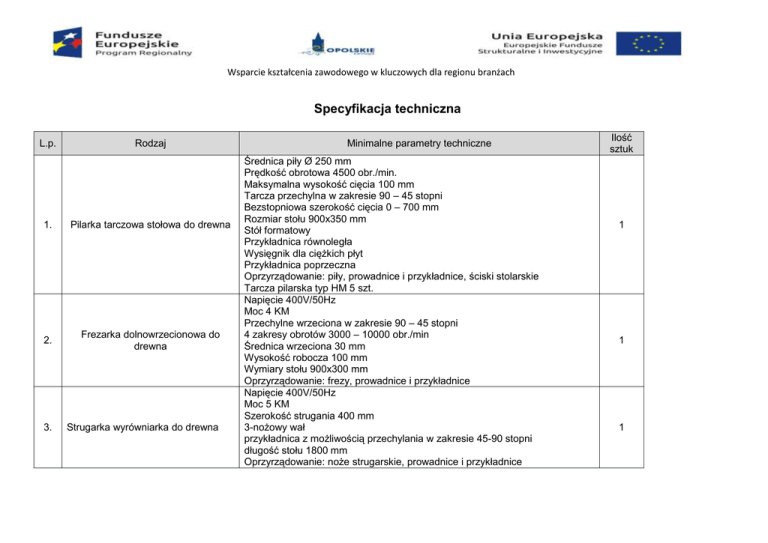 Wsparcie kształcenia zawodowego w kluczowych dla regionu branżach Specyfikacja techniczna L.p. Rodzaj 1. Pilarka tarczowa stołowa do drewna 2. Frezarka dolnowrzecionowa do drewna 3. Strugarka wyrówniarka do drewna Minimalne parametry techniczne Średnica piły Ø 250 mm Prędkość obrotowa 4500 obr./min. Maksymalna wysokość cięcia 100 mm Tarcza przechylna w zakresie 90 – 45 stopni Bezstopniowa szerokość cięcia 0 – 700 mm Rozmiar stołu 900x350 mm Stół formatowy Przykładnica równoległa Wysięgnik dla ciężkich płyt Przykładnica poprzeczna Oprzyrządowanie: piły, prowadnice i przykładnice, ściski stolarskie Tarcza pilarska typ HM 5 szt. Napięcie 400V/50Hz Moc 4 KM Przechylne wrzeciona w zakresie 90 – 45 stopni 4 zakresy obrotów 3000 – 10000 obr./min Średnica wrzeciona 30 mm Wysokość robocza 100 mm Wymiary stołu 900x300 mm Oprzyrządowanie: frezy, prowadnice i przykładnice Napięcie 400V/50Hz Moc 5 KM Szerokość strugania 400 mm 3-nożowy wał przykładnica z możliwością przechylania w zakresie 45-90 stopni długość stołu 1800 mm Oprzyrządowanie: noże strugarskie, prowadnice i przykładnice Ilość sztuk 1 1 1 4. 5. 6. 7. 8. Wsparcie kształcenia zawodowego w kluczowych dla regionu branżach Napięcie 400V/50Hz Moc 5 KM Szerokość strugania 400 mm Strugarka grubiarka do drewna 3-nożowy wał Długość stołu 550 mm Wysokość strugania w zakresie 4 – 220 mm Oprzyrządowanie: noże strugarskie, prowadnice i przykładnice Napięcie 400V/50Hz Moc 3 KM Wysokość cięcia 300 mm Szerokość cięcia 400 mm Pilarka taśmowa do drewna Wymiary stołu 400x550 mm Przechył stołu w zakresie -10 do 45 stopni Wysokość stołu 800 mm Oprzyrządowanie: brzeszczot piły taśmowej, prowadnice i przykładnice Napięcie 400V/50Hz Grubość krawędzi 0.4 – 2 mm Grubość płyt 10 – 45 mm Minimalna długość obrabianego przedmiotu 250 mm Okleiniarka stołowa Minimalna szerokość obrabianego przedmiotu 90 mm Złącze odciągu 100 mm Pojemność pojemnika na klej 1 kg Długość 2000 mm Napięcie 400V/50Hz Moc 3 KM Szerokość taśmy ściernej 150 mm Długość taśmy ściernej 2500 mm Szlifierka taśmowa krawędziowa do Stół podnośny o wymiarach 800x300 mm drewna Regulacja wysokości stołu 50 mm Kat przechyłu w zakresie 90 – 180 stopni dodatkowy stolik do szlifowania elementów okrągłych oprzyrządowanie: taśmy szlifierskie Napięcie 230V/50Hz Okleiniarka ręczna Grubość krawędzi 0.4 – 3 mm 1 1 1 1 1 9. 10. 11. 12. Wsparcie kształcenia zawodowego w kluczowych dla regionu branżach Grubość płyt 10 – 45 mm Minimalna długość obrabianego przedmiotu 250 mm Minimalna szerokość obrabianego przedmiotu 90 mm Prędkość posuwu 3m/min. Temperatura 130 – 200 stopni C Pojemność pojemnika na klej 150 cm3 Napięcie 400V/50Hz Moc 2 KM Liczba wrzecion 20 Wiertarka wielowrzecionowa Maksymalna głębokość wiercenia 50 mm Wymiary stołu 900x300 mm Ciśnienie powietrza 6 – 8 bar Oprzyrządowanie: wiertła, prowadnice i przykładnice Napięcie akumulatora 10,8 V Maksymalny moment obrotowy 16 Nm Typ akumulatora Li-Ion Pojemność akumulatora 2,6 Ah Ilość akumulatorów 2 Wiertarko-wkrętarka akumulatorowa Ilość biegów 2 Średnica wiertła do drewna 12mm Czas ładowania poniżej 1h Masa wraz z akumulatorem poniżej 1kg Oprzyrządowanie: walizka transportowa, ładowarka, uchwyt narzędziowy, uchwyt bitów, nasadka kątowa Moc 700W Średnica talerza 150 mm Szlifierka mimośrodowa do drewna Suw szlifujący 5mm Przyłącze do odsysania pyłu Oprzyrządowanie: walizka transportowa, talerz szlifierski Moc 1400W. Szerokość frezu 50 mm Frezarka ręczna górnowrzecionowa Uchwyt zaciskowy 6/12 mm do drewna Oprzyrządowanie: uchwyty zaciskowe, prowadnica boczna, łapacz wiórów Frez do frezarki 2 szt. 1 10 2 2 13. 14. 15. 16. 17. 20. Wsparcie kształcenia zawodowego w kluczowych dla regionu branżach Moc 720W Głębokość ciecia w drewnie 120 mm Wyrzynarka Maksymalne odchylenie od pionu 45 stopni Oprzyrządowanie: walizka transportowa, brzeszczoty, zabezpieczenie przeciwodpryskowe Moc 1200W Średnica tarczy tnącej 160 mm Głębokość cięcia przy 90°: 50 mm Piła tarczowa zagłębiarka Głębokość cięcia przy 45°: 40 mm Przyłącze do odsysania pyłu Oprzyrządowanie: walizka transportowa, tarcza pilarska, narzędzia do obsługi Materiał: aluminium Długość 140 cm Szyna prowadząca Szybki zacisk do szyny prowadzącej 10 szt. Szybki zacisk dźwigniowy 10 szt. Napięcie akumulatora 18 V Maksymalny moment obrotowy 60 Nm Typ akumulatora Li-Ion Pojemność akumulatora 4,2 Ah Ilość akumulatorów 2 Wiertarko-wkrętarka akumulatorowa Ilość biegów 4 udar Średnica wiertła do drewna 50mm Masa wraz z akumulatorem poniżej 2kg Oprzyrządowanie: walizka transportowa, uchwyty, ładowarka, głowica kątowa Moc 310W Średnica talerza 150 mm Szlifierka mimośrodowa do drewna Suw szlifujący 5mm Przyłącze do odsysania pyłu Oprzyrządowanie: walizka transportowa, talerz szlifierski Moc 550W Głębokość ciecia w drewnie 120 mm Wyrzynarka Maksymalne odchylenie od pionu 45 stopni Oprzyrządowanie: walizka transportowa, brzeszczoty, zabezpieczenie 1 1 1 3 2 1 21. 22. 23. 24. 25. Wsparcie kształcenia zawodowego w kluczowych dla regionu branżach przeciwodpryskowe Napięcie 230 V Moc 1150 W Pilarka ukośnica do drewna Średnica piły 216 mm Oprzyrządowanie: tarcza pilarska, kątownik nastawny, zacisk stolarski Napięcie akumulatora 10.8 V Maksymalny moment obrotowy 30 Nm Typ akumulatora Li-Ion Pojemność akumulatora 2,0 Ah Wiertarko-wkrętarka akumulatorowa Ilość akumulatorów 2 Ilość biegów 4 Średnica wiertła do drewna 19 mm Masa wraz z akumulatorem poniżej 1kg Oprzyrządowanie: ładowarka, zestaw akcesoriów, torba transportowa Zasięg do 50 m Maksymalny czas pomiaru do 5 s. Dalmierz laserowy Dokładność pomiaru +- 1,5 mm Zasilanie baterie AAA Moc 720W Gwint wrzeciona M14 Szlifierka kątowa Średnica tarcz 115 mm Oprzyrządowanie: Kołni