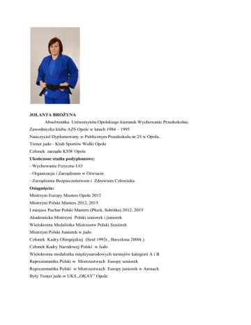 JOLANTA BROŻYNA Absolwentka Uniwersytetu Opolskiego kierunek Wychowanie Przedszkolne. Zawodniczka klubu AZS Opole w latach 1984 – 1995 Nauczyciel Dyplomowany w Publicznym Przedszkolu nr 25 w Opolu. Trener judo - Klub Sportów Walki Opole Członek zarządu KSW Opole Ukończone studia podyplomowe: - Wychowanie Fizyczne UO - Organizacja i Zarządzanie w Oświacie - Zarządzanie Bezpieczeństwem i Zdrowiem Człowieka Osiągnięcia: Mistrzyni Europy Masters Opole 2012 Mistrzyni Polski Masters 2012, 2015 I miejsce Puchar Polski Masters (Płock, Sobótka) 2012, 2015 Akademicka Mistrzyni Polski seniorek i juniorek Wielokrotna Medalistka Mistrzostw Polski Seniorek Mistrzyni Polski Juniorek w judo Członek Kadry Olimpijskiej (Seul 1992r., Barcelona 2000r.) Członek Kadry Narodowej Polski w Judo Wielokrotna medalistka międzynarodowych turniejów kategorii A i B Reprezentantka Polski w Mistrzostwach Europy seniorek Reprezentantka Polski w Mistrzostwach Europy juniorek w Atenach Były Trener judo w UKS „OKAY” Opole