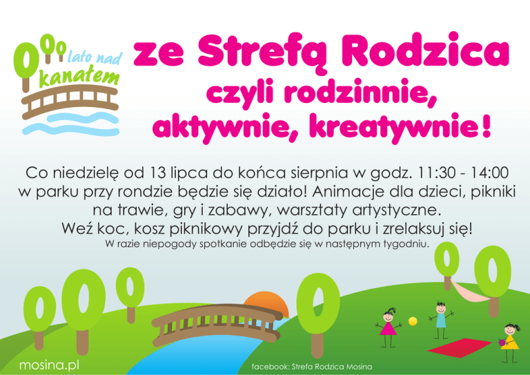 oo o ze Stref¹ Rodzica czyli rodzinnie, aktywnie, kreatywnie ! Co niedzielê od 13 lipca do koñca sierpnia w godz. 11:30 - 14:00 w parku przy rondzie bêdzie siê dzia³o! Animacje dla dzieci, pikniki na trawie, gry i zabawy, warsztaty artystyczne. WeŸ koc, kosz piknikowy przyjdŸ do parku i zrelaksuj siê! o oo o W razie niepogody spotkanie odbêdzie siê w nastêpnym tygodniu. mosina.pl facebook: Strefa Rodzica Mosina oo