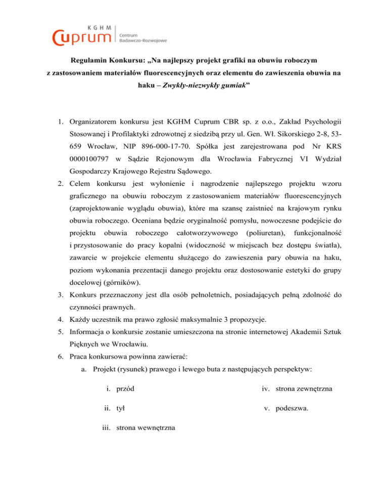 Regulamin Konkursu: „Na najlepszy projekt grafiki na obuwiu roboczym z zastosowaniem materiałów fluorescencyjnych oraz elementu do zawieszenia obuwia na haku – Zwykły-niezwykły gumiak” 1. Organizatorem konkursu jest KGHM Cuprum CBR sp. z o.o., Zakład Psychologii Stosowanej i Profilaktyki zdrowotnej z siedzibą przy ul. Gen. Wł. Sikorskiego 2-8, 53659 Wrocław, NIP 896-000-17-70. Spółka jest zarejestrowana pod Nr KRS 0000100797 w Sądzie Rejonowym dla Wrocławia Fabrycznej VI Wydział Gospodarczy Krajowego Rejestru Sądowego. 2. Celem konkursu jest wyłonienie i nagrodzenie najlepszego projektu wzoru graficznego na obuwiu roboczym z zastosowaniem materiałów fluorescencyjnych (zaprojektowanie wyglądu obuwia), które ma szansę zaistnieć na krajowym rynku obuwia roboczego. Oceniana będzie oryginalność pomysłu, nowoczesne podejście do projektu obuwia roboczego całotworzywowego (poliuretan), funkcjonalność i przystosowanie do pracy kopalni (widoczność w miejscach bez dostępu światła), zawarcie w projekcie elementu służącego do zawieszenia pary obuwia na haku, poziom wykonania prezentacji danego projektu oraz dostosowanie estetyki do grupy docelowej (górników). 3. Konkurs przeznaczony jest dla osób pełnoletnich, posiadających pełną zdolność do czynności prawnych. 4. Każdy uczestnik ma prawo zgłosić maksymalnie 3 propozycje. 5. Informacja o konkursie zostanie umieszczona na stronie internetowej Akademii Sztuk Pięknych we Wrocławiu. 6. Praca konkursowa powinna zawierać: a. Projekt (rysunek) prawego i lewego buta z następujących perspektyw: i. przód iv. strona zewnętrzna ii. tył v. podeszwa. iii. strona wewnętrzna b. Opis projektu (w języku polskim), którego objętość nie może przekraczać 1000 wyrazów: i. uzasadnienie projektu (wybór kształtu, kolorów itp.) ii. parametry techniczne (długość i grubość zastosowanych elementów itp.) iii. uzasadnienie zastosowanego rozwiązania dot. widoczności w kopalni 7. Warunkiem uczestnictwa w konkursie jest przesłanie zgłoszenia do konkursu (załącznik nr 1), wraz ze zgłaszanym projektem obuwia roboczego wg wymagań opisanych w pkt. 6 niniejszego Regulaminu w formacie JPG lub PDF na adres [email protected] do dnia 20 marca 2016. Maila ze zgłoszeniem należy zatytułować: KONKURS – obuwie robocze 8. Wyniki konkursu zostaną ogłoszone do 31 marca 2016 roku. Laureaci zostaną powiadomieni o przyznanych nagrodach mailowo lub telefonicznie. 9. Wgląd do dokumentacji konkursowej będzie możliwy w siedzibie Organizatora konkursu. 10. Jury konkursu składa się z pracowników KGHM CUPRUM CBR, KGHM Polska Miedź S.A. oraz pracownika dydaktycznego Akademii Sztuk Pięknych we Wrocławiu. 11. Nagrodą Główną jest nagroda pieniężna wysokości 1000 PLN (netto). 12. Poza Nagrodą Główną Jury wybierze spośród nadesłanych zgłoszeń II i III miejsca. Za II miejsce przewidziana jest nagroda pieniężna w wysokości 500 PLN (netto), a za miejsce III w wysokości 300 PLN (netto). Jury zastrzega sobie prawo przyznania wyłącznie Nagrody Głównej 13. Organizator nie przyjmuje odwołań od decyzji Jury. 14. Przyznanie nagrody lub wyróżnienia za nadesłaną pracę konkursową skutkuje przeniesieniem całości autorskich praw majątkowych do pracy konkursowej na Organizatora, zgodnie z treścią umowy w sprawie przeniesienia autorskich praw majątkowych, stanowiącego załącznik nr 2 do Regulaminu konkursu. 15. Warunkiem wypłacenia nagrody jest podpisanie umowy o przeniesienie autorskich praw majątkowych (załącznik nr 2). 16. Prace, które nie zostaną wybrane, zostaną zwrócone autorom i trwale usunięte z komputerów i baz danych Organizatora. 17. Organizator zastrzega sobie możliwość zmiany regulaminu, jak również jego unieważnienia w trakcie trwania konkursu. 18. Wysłanie prac konkursowych jest jednoznaczne z zapoznaniem się i akceptacją regulaminu oraz wszystkich jego załączników. 19. Ewentualne pytania do treści regulaminu oraz załączników do niego należy kierować drogą e-mail na adres [email protected]. 20. Uczestnicy ponoszą wszelkie koszty swojego uczestnictwa w konkursie, bez prawa do żądania ich refundacji od Organizatora konkursu. Organizator nie zaciąga żadnych zobowiązań wobec uczestników w związku z ich udziałem w konkursie. Organizator Konkursu Zakład Psychologii Stosowanej i Profilaktyki Zdrowotnej KGHM Cuprum Sp. z o.o. Centrum Badawczo-Rozwojowe Ul. Gen. Sikorskiego 2-8 53-659 Wrocław Załącznik nr 1 FORMULARZ ZGŁOSZENIOWY dla uczestnika konkursu na projekt (design) obuwia roboczego z zastosowaniem materiałów fluorescencyjnych I. DANE UCZESTNIKA: Imię i nazwisko ……………………......…………………………………………………………………...…… Adres do korespondencji ……………………………..…………………………………………………………………… ….………………………………………………………………………………………………. Telefon ……………………………… II. e-mail:…………………………………….………. OŚWIADCZENIA 1. Oświadczam, że zgłoszona przeze mnie praca konkursowa jest mojego autorstwa, dysponuję całością praw autorskich do pracy konkursowej, praca nie narusza praw osób trzecich oraz nie była zgłoszona do innego konkursu. 2. Oświadczam, że znam i akceptuję postanowienia Regulaminu konkursu oraz załączników do niego. 3. Wyrażam zgodę na przetwarzanie danych osobowych przez KGHM CUPRUM sp. z o.o. CBR dla potrzeb konkursu zgodnie z przepisami Ustawy z dnia 29 sierpnia 1997 roku o ochronie danych osobowych, a w szczególności na przetwarzanie moich danych osobowych w celu przeprowadzenia konkursu, wyłonienia zwycięzcy, przyznania, wydania i odbioru nagrody. Mam prawo wglądu i poprawiania moich danych, a także odwołania tej zgody w każdej chwili. Administratorem danych osobo
