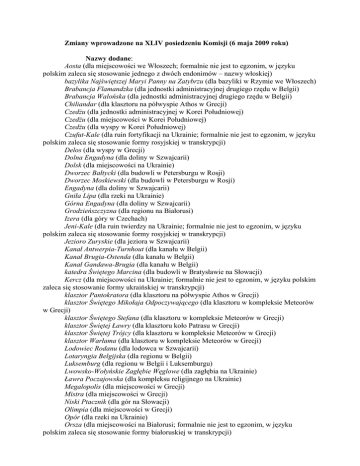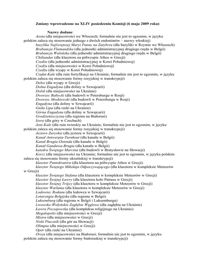 Zmiany wprowadzone na XLIV posiedzeniu Komisji (6 maja 2009 roku) Nazwy dodane: Aosta (dla miejscowości we Włoszech; formalnie nie jest to egzonim, w języku polskim zaleca się stosowanie jednego z dwóch endonimów – nazwy włoskiej) bazylika Najświętszej Maryi Panny na Zatybrzu (dla bazyliki w Rzymie we Włoszech) Brabancja Flamandzka (dla jednostki administracyjnej drugiego rzędu w Belgii) Brabancja Walońska (dla jednostki administracyjnej drugiego rzędu w Belgii) Chiliandar (dla klasztoru na półwyspie Athos w Grecji) Czedżu (dla jednostki administracyjnej w Korei Południowej) Czedżu (dla miejscowości w Korei Południowej) Czedżu (dla wyspy w Korei Południowej) Czufut-Kale (dla ruin fortyfikacji na Ukrainie; formalnie nie jest to egzonim, w języku polskim zaleca się stosowanie formy rosyjskiej w transkrypcji) Delos (dla wyspy w Grecji) Dolna Engadyna (dla doliny w Szwajcarii) Dolsk (dla miejscowości na Ukrainie) Dworzec Bałtycki (dla budowli w Petersburgu w Rosji) Dworzec Moskiewski (dla budowli w Petersburgu w Rosji) Engadyna (dla doliny w Szwajcarii) Gniła Lipa (dla rzeki na Ukrainie) Górna Engadyna (dla doliny w Szwajcarii) Grodzieńszczyzna (dla regionu na Białorusi) Izera (dla góry w Czechach) Jeni-Kale (dla ruin twierdzy na Ukrainie; formalnie nie jest to egzonim, w języku polskim zaleca się stosowanie formy rosyjskiej w transkrypcji) Jezioro Zuryskie (dla jeziora w Szwajcarii) Kanał Antwerpia-Turnhout (dla kanału w Belgii) Kanał Brugia-Ostenda (dla kanału w Belgii) Kanał Gandawa-Brugia (dla kanału w Belgii) katedra Świętego Marcina (dla budowli w Bratysławie na Słowacji) Kercz (dla miejscowości na Ukrainie; formalnie nie jest to egzonim, w języku polskim zaleca się stosowanie formy ukraińskiej w transkrypcji) klasztor Pantokratora (dla klasztoru na półwyspie Athos w Grecji) klasztor Świętego Mikołaja Odpoczywającego (dla klasztoru w kompleksie Meteorów w Grecji) klasztor Świętego Stefana (dla klasztoru w kompleksie Meteorów w Grecji) klasztor Świętej Ławry (dla klasztoru koło Patrasu w Grecji) klasztor Świętej Trójcy (dla klasztoru w kompleksie Meteorów w Grecji) klasztor Warłama (dla klasztoru w kompleksie Meteorów w Grecji) Lodowiec Rodanu (dla lodowca w Szwajcarii) Lotaryngia Belgijska (dla regionu w Belgii) Luksemburg (dla regionu w Belgii i Luksemburgu) Lwowsko-Wołyńskie Zagłębie Węglowe (dla zagłębia na Ukrainie) Ławra Poczajowska (dla kompleksu religijnego na Ukrainie) Megalopolis (dla miejscowości w Grecji) Mistra (dla miejscowości w Grecji) Niski Ptacznik (dla gór na Słowacji) Olimpia (dla miejscowości w Grecji) Opór (dla rzeki na Ukrainie) Orsza (dla miejscowości na Białorusi; formalnie nie jest to egzonim, w języku polskim zaleca się stosowanie formy białoruskiej w transkrypcji) Pałac Dioklecjana (dla budowli w Splicie w Chorwacji) Postojna (dla jaskini w Słowenii) Ptacznik (dla góry na Słowacji) Pylos (dla miejscowości w Grecji) Region Flamandzki (dla jednostki administracyjnej w Belgii) Region Stołeczny Brukseli (dla jednostki administracyjnej w Belgii) Region Waloński (dla jednostki administracyjnej w Belgii) Sankt Moritz (dla miejscowości w Szwajcarii; formalnie nie jest to egzonim, w języku polskim zaleca się stosowanie jednego z endonimów – nazwy niemieckiej) Słonim (dla miejscowości na Białorusi; formalnie nie jest to egzonim, w języku polskim zaleca się stosowanie formy białoruskiej w transkrypcji) Słuck (dla miejscowości na Białorusi; formalnie nie jest to egzonim, w języku polskim zaleca się stosowanie formy białoruskiej w transkrypcji) Szack (dla miejscowości na Białorusi; formalnie nie jest to egzonim, w języku polskim zaleca się stosowanie formy białoruskiej w transkrypcji) Szczuczyn (dla miejscowości na Białorusi; formalnie nie jest to egzonim, w języku polskim zaleca się stosowanie formy białoruskiej w transkrypcji) Watopedi (dla klasztoru na półwyspie Athos w Grecji) Wielka Ławra dla klasztoru na półwyspie Athos w Grecji) Wielki Meteor wraz z egzonimem wariantowym klasztor Przemienienia Pańskiego (dla klasztoru w kompleksie Meteorów w Grecji) Wielkie Kniazikowce (dla miejscowości na Białorusi) Wilejka (dla miejscowości na Białorusi) Wyhorlat (dla góry na Słowacji) Wysoki Ptacznik (dla gór na Słowacji) Wyspa Książęca (dla jednostki administracyjnej Wysp Świętego Tomasza i Książęca) Zadwórze (dla miejscowości na Ukrainie) Zamek Królewski (dla budowli w Budapeszcie na Węgrzech) Zamek Praski (dla budowli w Pradze w Czechach) Nazwy zmienione: Archipelag Nordenskiölda (zamiast Archipelag Nordenskjölda dla wysp w Rosji) Azad Dżammu i Kaszmir (zamiast Azad Kaszmir dla jednostki administracyjnej w Pakistanie) kaplica Boimów (zamiast Kaplica Boimów dla budowli na Ukrainie) klasztor Bazylianów (zamiast Klasztor Bazylianów dla budowli na Litwie) mauzoleum Władysława Warneńczyka (zamiast Mauzoleum Władysława Warneńczyka dla budowli w Bułgarii) świątynia Nike (zamiast Świątynia Nike dla budowli w Grecji) wieża Giedymina (zamiast Wieża Giedymina dla budowli na Litwie) wieża Wiatrów (zamiast Wieża Wiatrów dla budowli w Grecji) Egzonimy skasowane: Bazylea (dla jednostki administracyjnej w Szwajcarii) Brabancja (dla jednostki administracyjnej drugiego rzędu w Belgii) Czerwonogród (dla ruin zamku na Ukrainie) Sanicze (dla miejscowości na Białorusi) Stolica Apostolska (w odniesieniu do długiej nazwy państwa; w użyciu pozostaje nadal drugi egzonim Państwo Watykańskie)