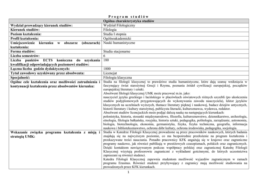 Program studiów Ogólna charakterystyka studiów Wydział Filologiczny Filologia Studia I stopnia Ogólnoakademicki (obszarach) Nauki humanistyczne Wydział prowadzący kierunek studiów: Kierunek studiów: Poziom kształcenia: Profil kształcenia: Umiejscowienie kierunku w obszarze kształcenia: Forma studiów: Liczba semestrów: Liczba punktów ECTS konieczna do uzyskania kwalifikacji odpowiadających poziomowi studiów: Łączna liczba godzin dydaktycznych: Tytuł zawodowy uzyskiwany przez absolwenta: Specjalność: Ogólne cele kształcenia oraz możliwości zatrudnienia i kontynuacji kształcenia przez absolwentów kierunku: Studia stacjonarne 6 180 1800 Licencjat Filologia klasyczna Studia na filologii klasycznej to prawdziwe studia humanistyczne, które dają szansę wniknięcia w fascynujący świat starożytnej Grecji i Rzymu, poznania źródeł cywilizacji europejskiej, początków europejskiej literatury i sztuki. Absolwent filologii klasycznej UMK może pracować m.in. jako: nauczyciel języka greckiego i łacińskiego w placówkach oświatowych różnych szczebli (po ukończeniu studiów podyplomowych przygotowujących do wykonywania zawodu nauczyciela), lektor języków klasycznych na uczelniach wyższych, tłumacz literatury pięknej i naukowej, badacz dziejów antycznych, historii literatury i kultury starożytnej, publicysta literacki, kulturoznawca, wydawca, redaktor. Absolwent studiów licencjackich może podjąć dalszą naukę na następujących kierunkach: polonistyka, historia, stosunki międzynarodowe, filozofia, kulturoznawstwo, dziennikarstwo, archeologia, etnologia, filologia bałkańska, rosyjska, historia sztuki, pedagogika, politologia, zarządzanie, astronomia, biologia, biotechnologia, ekonomia, germanistyka, fizyka, fizyka techniczna, geografia, informacja naukowa i bibliotekoznawstwo, ochrona dóbr kultury, ochrona środowiska, pedagogika, socjologia. Wskazanie związku programu kształcenia z misją i Studia w Katedrze Filologii Klasycznej prowadzone są przez pracowników naukowych, których badania znajdują się na najwyższym poziomie, co ma bezpośrednie przełożenie na program kształcenia i strategią UMK: przekazywane treści nauczania. Ponadto pracownicy KFK angażują się w krajowe oraz zagraniczne programy naukowe, jak również publikują w prestiżowych czasopismach, polskich oraz zagranicznych. Dzięki kontaktom nawiązywanym podczas współpracy polskiej oraz zagranicznej Katedrę Filologii Klasycznej wizytują profesorowie zagraniczni z wykładami gościnnymi, do których uczestnictwa zapraszani są również studenci. Katedra Filologii Klasycznej zapewnia studentom możliwość wyjazdów zagranicznym w ramach programu Erasmus. Również studenci przybywający z zagranicy mają możliwość studiowania na prowadzonych przez KFK kierunkach. 1 Program kształcenia na prowadzonych przez Katedrę Filologii Klasycznej kierunkach ma charakter interdyscyplinarny, dający studentom ogólnohumanistyczne wykształcenie oraz uczący ich kreatywności, co zwiększa szanse studentów na zmiennym rynku pracy. Studia prowadzone przez KFK, dzięki poruszanym treściom, przyczyniają się także do podniesienia poziomu kultury oraz uwrażliwienia społecznego studentów. Ponadto w prowadzonych przez KFK kołach naukowych studenci mają możliwość wykazania się swoją aktywnością oraz zainteresowaniami tak naukowymi, jak i kulturotwórczymi. W Katedrze Filologii Klasycznej studenci mają również okazję wykazać się aktywnością społeczną i jako wolontariusze brać udział np. w konkursach dla młodzieży organizowanych przez KFK. Wskazanie, czy w procesie definiowania efektów kształcenia Opinie zostały uwzględnione oraz w procesie przygotowania i udoskonalania programu studiów uwzględniono opinie interesariuszy, w tym w szczególności studentów, absolwentów, pracodawców: Wymagania wstępne (oczekiwane kompetencje kandydata) – zwłaszcza w przypadku studiów drugiego stopnia: Moduły kształcenia wraz z zakładanymi efektami kształcenia Moduły kształcenia Przed Liczba Charakter mioty punktów zajęć ECTS obligatoryjny/ fakultatywny Historia literatury starogreckiej (okres archaiczny i klasyczny) 8 obligatoryjny Historia literatury starogreckiej (okres 8 obligatoryjny Przynależność do obszaru kształcenia (w przypadku przyporządkowania kierunku do więcej niż jednego obszaru kształcenia) Zakładane efekty kształcenia Sposoby weryfikacji zakładanych efektów kształcenia osiąganych przez studenta Egzamin po każdym semestrze K_W04, K_W07, K_U08, K_U09, K_K01, K_K04 - ma podstawową wiedzę o literaturze starożytnej Grecji obejmującą jej periodyzację, genologię oraz klasyczne kanony twórców - ma podstawową wiedzę o głównych kierunkach rozwoju i najważniejszych osiągnięciach w dziedzinie literaturoznawstwa - umie umiejscowić poznawane utwory w ogólnym kontekście historyczno- kulturowym - umie rozpoznać rodzaj literacki i gatunkową konwencję poznawanych utworów - ma świadomość poziomu swojej wiedzy i umiejętności - docenia tradycję i dziedzictwo kulturowe ludzkości oraz ma świadomość odpowiedzialności za zachowanie dziedzictwa kulturowego, szczególnie grecko-rzymskiego antyku K_W04, K_W07, K_U08, K_U09, K_K01, K_K04 Egzamin po każdym semestrze - ma podstawową wiedzę o literaturze starożytnej 2 hellenistyczny i Cesarstwa) Historia literatury rzymskiej (okres archaiczny i cyceroński) 8 obligatoryjny Historia literatury rzymskiej (okres augustowski i Cesarstwa) 8 obligatoryjny Grecji epoki hellenistycznej i cesarskiej obejmującą jej periodyzację, genologię oraz klasyczne kanony twórców - ma podstawową wiedzę o głównych kierunkach rozwoju i najważniejszych osiągnięciach w dziedzinie literaturoznawstwa - umie umiejscowić poznawane utwory w ogólnym kontekście historyczno- kulturowym - umie rozpoznać rodzaj literacki i gatunkową konwencję poznawanych utworów - ma świadom