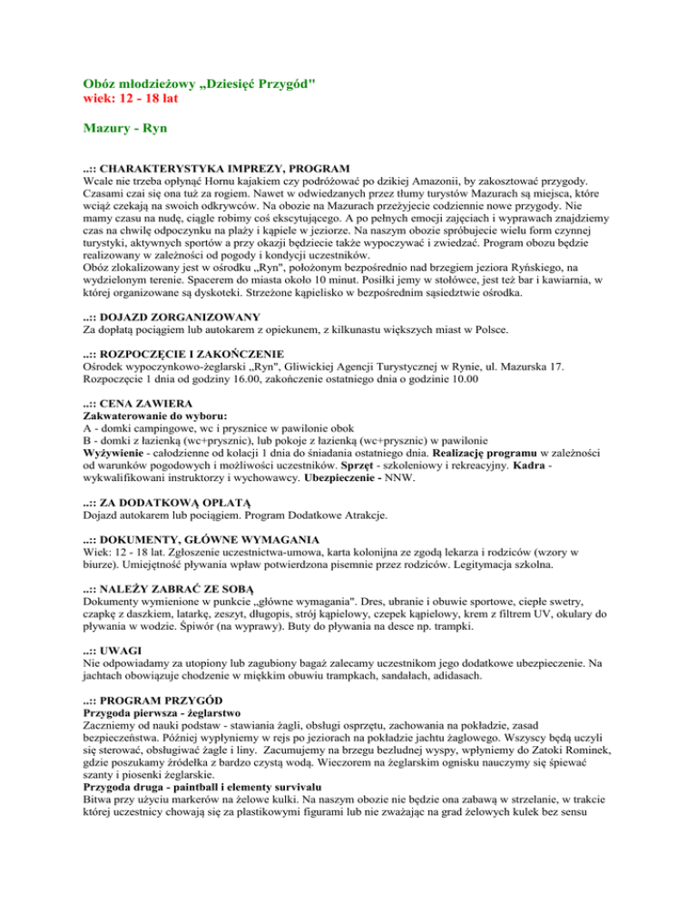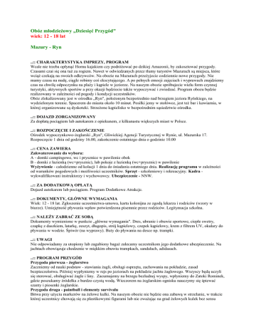 Obóz młodzieżowy „Dziesięć Przygód" wiek: 12 - 18 lat Mazury - Ryn ..:: CHARAKTERYSTYKA IMPREZY, PROGRAM Wcale nie trzeba opłynąć Hornu kajakiem czy podróżować po dzikiej Amazonii, by zakosztować przygody. Czasami czai się ona tuż za rogiem. Nawet w odwiedzanych przez tłumy turystów Mazurach są miejsca, które wciąż czekają na swoich odkrywców. Na obozie na Mazurach przeżyjecie codziennie nowe przygody. Nie mamy czasu na nudę, ciągle robimy coś ekscytującego. A po pełnych emocji zajęciach i wyprawach znajdziemy czas na chwilę odpoczynku na plaży i kąpiele w jeziorze. Na naszym obozie spróbujecie wielu form czynnej turystyki, aktywnych sportów a przy okazji będziecie także wypoczywać i zwiedzać. Program obozu będzie realizowany w zależności od pogody i kondycji uczestników. Obóz zlokalizowany jest w ośrodku „Ryn", położonym bezpośrednio nad brzegiem jeziora Ryńskiego, na wydzielonym terenie. Spacerem do miasta około 10 minut. Posiłki jemy w stołówce, jest też bar i kawiarnia, w której organizowane są dyskoteki. Strzeżone kąpielisko w bezpośrednim sąsiedztwie ośrodka. ..:: DOJAZD ZORGANIZOWANY Za dopłatą pociągiem lub autokarem z opiekunem, z kilkunastu większych miast w Polsce. ..:: ROZPOCZĘCIE I ZAKOŃCZENIE Ośrodek wypoczynkowo-żeglarski „Ryn", Gliwickiej Agencji Turystycznej w Rynie, ul. Mazurska 17. Rozpoczęcie 1 dnia od godziny 16.00, zakończenie ostatniego dnia o godzinie 10.00 ..:: CENA ZAWIERA Zakwaterowanie do wyboru: A - domki campingowe, wc i prysznice w pawilonie obok B - domki z łazienką (wc+prysznic), lub pokoje z łazienką (wc+prysznic) w pawilonie Wyżywienie - całodzienne od kolacji 1 dnia do śniadania ostatniego dnia. Realizację programu w zależności od warunków pogodowych i możliwości uczestników. Sprzęt - szkoleniowy i rekreacyjny. Kadra wykwalifikowani instruktorzy i wychowawcy. Ubezpieczenie - NNW. ..:: ZA DODATKOWĄ OPŁATĄ Dojazd autokarem lub pociągiem. Program Dodatkowe Atrakcje. ..:: DOKUMENTY, GŁÓWNE WYMAGANIA Wiek: 12 - 18 lat. Zgłoszenie uczestnictwa-umowa, karta kolonijna ze zgodą lekarza i rodziców (wzory w biurze). Umiejętność pływania wpław potwierdzona pisemnie przez rodziców. Legitymacja szkolna. ..:: NALEŻY ZABRAĆ ZE SOBĄ Dokumenty wymienione w punkcie „główne wymagania". Dres, ubranie i obuwie sportowe, ciepłe swetry, czapkę z daszkiem, latarkę, zeszyt, długopis, strój kąpielowy, czepek kąpielowy, krem z filtrem UV, okulary do pływania w wodzie. Śpiwór (na wyprawy). Buty do pływania na desce np. trampki. ..:: UWAGI Nie odpowiadamy za utopiony lub zagubiony bagaż zalecamy uczestnikom jego dodatkowe ubezpieczenie. Na jachtach obowiązuje chodzenie w miękkim obuwiu trampkach, sandałach, adidasach. ..:: PROGRAM PRZYGÓD Przygoda pierwsza - żeglarstwo Zaczniemy od nauki podstaw - stawiania żagli, obsługi osprzętu, zachowania na pokładzie, zasad bezpieczeństwa. Później wypłyniemy w rejs po jeziorach na pokładzie jachtu żaglowego. Wszyscy będą uczyli się sterować, obsługiwać żagle i liny. Zacumujemy na brzegu bezludnej wyspy, wpłyniemy do Zatoki Rominek, gdzie poszukamy źródełka z bardzo czystą wodą. Wieczorem na żeglarskim ognisku nauczymy się śpiewać szanty i piosenki żeglarskie. Przygoda druga - paintball i elementy survivalu Bitwa przy użyciu markerów na żelowe kulki. Na naszym obozie nie będzie ona zabawą w strzelanie, w trakcie której uczestnicy chowają się za plastikowymi figurami lub nie zważając na grad żelowych kulek bez sensu biegną przed siebie krzycząc „hura". Nasze zmagania będą odbywać się w terenie, na leśnych polanach i przecinkach, wśród zróżnicowanego terenu a czasem będą częścią większych manewrów, w których paintballowe starcie będzie jednym z wielu elementów, lecz bardzo ekscytującym. Żeby zmierzyć się z przeciwnikiem, trzeba będzie go najpierw odnaleźć. W teren wyruszą zawiadowcy, aby wykryć tajne obozowisko. Ukryci snajperzy przeciwnika będą starali się ich wyeliminować. Nauczymy się skrycie podchodzić przeciwnika, nawiązywać łączność za pomocą krótkofalówek, działać w większych i mniejszych grupach a także samodzielnie. Wybudujemy terenowe schronienia, które będą stanowić naszą bazę wypadową. Skorzystamy z darów leśnej i wodnej kuchni, przygotowując posiłki. Będziemy opracowywać strategię i taktykę, tak aby nauczyć się prowadzić bitewne zmagania. Dowódcy większych i mniejszych oddziałów będą wyznaczani na zmianę wśród uczestników. Przygoda trzecia - windsurfing Nauka i doskonalenie żeglowania na desce z żaglem. Do dyspozycji uczestników obozu wydzielona plaża windsurfingowa. Szkolenie odbywa się na sprzęcie o parametrach przystosowanych do rozmiarów i umiejętności uczestników oraz warunków pogodowych. Przygoda czwarta - quady To czterokołowe pojazdy łączące cechy samochodu terenowego i motoru. Sprawdzimy jak zachowują się w zróżnicowanym terenie. To maszyny, które umożliwiają nam bezpieczne i stabilne pokonywanie nawet najtrudniejszych tras. Dzięki temu dają nam poczucie swobody i wolności. Przygodę z quadami rozpoczynamy od ich stopniowego opanowania. Mamy większe i mniejsze pojazdy, dzięki czemu także młodsi uczestnicy mogą je dobrze prowadzić. Pierwsze jazdy z instruktorem i pod jego czujnym okiem, odbywają się na prostym terenie, następnie pokonujemy coraz większe wertepy aż do rajdu w terenie. Okolice ośrodka obfitują w tereny wymarzone do jazdy na tych maszynach - leśne drogi i dróżki, dzikie ścieżki, mokradła, poprzecinane większymi i mniejszymi pagórkami lub wzniesieniami a wszystko to nad pięknymi i czystymi mazurskimi jeziorami. Przygoda piąta - rowery Mazury i Suwalszczyzna to doskonały region do uprawiania turystyki rowerowej. Niezbyt długie, ale często zaskakująco strome zjazdy dodają emocji jeździe na rowerze. Resztki dawnych ost