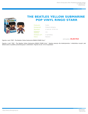 Aliens Group Jerzy Stec Produkcja-Handel-Usługi ul. Lipowa 17C Inowrocław THE BEATLES YELLOW SUBMARINE POP VINYL RINGO STARR Producent: Funko Dostępność: Produkt dostępny Wysokość: 4 cale (ok. 10,16 cm) Kategoria wiekowa: 14+ Dostępny od*: w sprzedaży Status: Nowości price gross: 45,00 PLN Figurka z serii "POP - The Beatles Yellow Submarine RINGO STARR Vinyl " Figurka z serii "POP - The Beatles Yellow Submarine RINGO STARR Vinyl " Idealna pozycja dla kolekcjonerów i miłośników muzyki. Jest dostarczana w pudełku prezentacyjnym z okienkiem. Figurka ma ok. 10 cm wysokości http://www.aliensgroup.eu generator: aptusshop