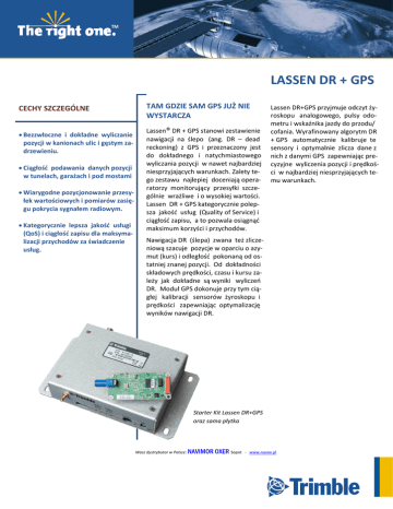 TM LASSEN DR + GPS CECHY SZCZEGÓLNE • Bezzwłoczne i dokładne wyliczanie pozycji w kanionach ulic i gęstym za‐ drzewieniu. • Ciągłość podawania danych pozycji w tunelach, garażach i pod mostami • Wiarygodne pozycjonowanie przesy‐ łek wartościowych i pomiarów zasię‐ gu pokrycia sygnałem radiowym. • Kategorycznie lepsza jakość usługi (QoS) i ciągłość zapisu dla maksyma‐ lizacji przychodów za świadczenie usług. TAM GDZIE SAM GPS JUŻ NIE WYSTARCZA Lassen® DR + GPS stanowi zestawienie nawigacji na ślepo (ang. DR – dead reckoning) z GPS i przeznaczony jest do dokładnego i natychmiastowego wyliczania pozycji w nawet najbardziej niesprzyjających warunkach. Zalety te‐ go zestawu najlepiej doceniają opera‐ ratorzy monitorujący przesyłki szcze‐ gólnie wrażliwe i o wysokiej wartości. Lassen DR + GPS kategorycznie polep‐ sza jakość usług (Quality of Service) i ciągłość zapisu, a to pozwala osiągnąć maksimum korzyści i przychodów. Lassen DR+GPS przyjmuje odczyt ży‐ roskopu analogowego, pulsy odo‐ metru i wskaźnika jazdy do przodu/ cofania. Wyrafinowany algorytm DR + GPS automatycznie kalibruje te sensory i optymalnie zlicza dane z nich z danymi GPS zapewniając pre‐ cyzyjne wyliczenia pozycji i prędkoś‐ ci w najbardziej niesprzyjających te‐ mu warunkach. Nawigacja DR (ślepa) zwana też zlicze‐ niową szacuje pozycje w oparciu o azy‐ mut (kurs) i odległość pokonaną od os‐ tatniej znanej pozycji. Od dokładności składowych prędkości, czasu i kursu za‐ leży jak dokładne są wyniki wyliczeń DR. Moduł GPS dokonuje przy tym cią‐ głej kalibracji sensorów żyroskopu i prędkości zapewniając optymalizację wyników nawigacji DR. Starter Kit Lassen DR+GPS oraz sama płytka Wasz dystrybutor w Polsce: NAVIMOR OXER Sopot ‐ www.navox.pl Zasilanie ..................................................................3,3 ± 0,2 V DC CHARAKTERYSTYKA OGÓLNA y Nawigacja zliczeniowa DR z udziałem odbiornika GPS y Dostępny jako zestaw lub w formie płytek PCB y Współpracuje zarówno z NMEA jak i binarnym protokołem Trimble y Automatyczna kalibracja danych wejścia z sensorów zewnętrznych PARAMETRY OPERACYJNE Częstotliwość odświeżania pozycji......................................... 1 Hz Dokładność w płaszczyźnie horyzontalnej............................. <5 m Dokładność wysokości..........................................................<10 m Dokładność prędkości.................................................. 0,02 m/sek PPS………………………............................................................ ± 200 ns Konfigurowalny TTFF (czas wyliczenia pierwszej pozycji)… < 2 sek typowo 190 mW Zasilanie podtrzymujące...................................+2,5V do +3,6V DC Zasilanie anteny .............................................................. 5,0 V DC Zakres temperatur pracy....................................... ‐40°C do +85°C Temperatury składowania.................................. ‐ 55°C do +100°C Interfejs systemowy............................ 14‐szpilkowy Micro Match (AMP Part Numer 1‐215079‐4) Złącze antenowe......................................................SMB lub Fakra Wymiary PCB bez złącza RF ............................ 32 x 66 x 8,5 mm 6.8” x 4” x 1.5” AKCESORIA y Shield Kit – osłona metalowa obejmująca płytkę dla ochrony elektrostatycznej i mechanicznej y Różne anteny aktywne – typ kompaktowy, z podstawą magne‐ tyczną lub bez, odpowiedni dla danego rodzaju pojazdu. PROTOKOŁY Konfigurowalne................................... NMEA lub binarny Trimble Komunikaty NMEA.............................. GGA, VTG, GSA, ZDA i RMC ZESTAW URUCHOMIENIOWY LASSEN DR + GPS Płytka Lassen DR+GPS, żyroskop, podtrzymanie bateryjne i płytka interfejsu w odpornej metalowej obudowie. Praca w trybie nawi‐ gacji DR wymaga doprowadzenia impulsów prędkościomierza oraz sygnału jazda / cofanie. Ponadto w skład zestawu wchodzą: y Antena z podstawą magnetyczną na kablu 5 m y Kabel USB y Kabel interfejsu samochodowego y Zasilacz AC/DC y Narzędzia programowe i instrukcja na CD Zasilanie........................................................................9 do 32 V DC Zakres temperatur pracy.............................................0°C do +60°C Temperatury składowania.......................................‐ 55°C do +80°C Interfejs komunikacyjny.................................................. klient USB Złącze interfejsu samochodowego…..........................................DB9 Złącze antenowe........................................................................SMB Złącze PPS................................................................................. BNC Wymiary zewnętrzne obudowy bez złączy.....173 x 102 x 38 mm PŁYTKA LASSEN DR + GPS Płytka drukowana z przeznaczeniem do integracji z systemami na‐ wigacyjnymi, telemetrycznymi i monitorowania pojazdów. Płytka posiada zaawansowany procesor nawigacji DR i wymaga podłą‐ czenia zewnętrznego sensora żyro, impulsów prędkościomierza, sensora cofania i zapłonu. Zobrazowanie dokładnego trzymania się trasy w śródmieściu San Francisco z gęstą i wysoką zabudową Części modułu Lassen DR + GPS są objęte ochroną patentową. Trimble opiera się na deklaracjach poddostawców zaświadczając, że niniejszy produkt jest zgodny z dyrektywą RoHS. Zastrzega się możliwość wprowadzania zmian w dowolnym momencie. Trimble Navigation Limited, ani dystrybutorzy nie mają wpływu na funkcjonowanie sy‐ stemu satelitarnego GPS, ani na dostęp lub brak dostępu do sygnałów z tego systemu. STANY ZJEDNOCZONE Trimble Navigation Limited Corporate Headquarters 935 Stewart Drive Sunnyvale CA 94085 Phone: +1‐800‐787‐4225 www.trimble.com EUROPA KOREA CHINY Phone:+49‐6142‐2100‐161 Trimble Export Ltd Phone +82‐2‐555‐5361 Trimble Navigation 