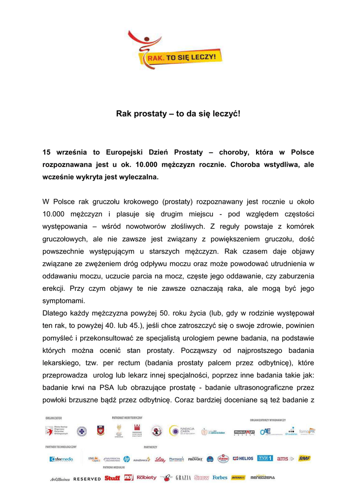 Rak prostaty – to da się leczyć! 15 września to Europejski Dzień Prostaty – choroby, która w Polsce rozpoznawana jest u ok. 10.000 mężczyzn rocznie. Choroba wstydliwa, ale wcześnie wykryta jest wyleczalna. W Polsce rak gruczołu krokowego (prostaty) rozpoznawany jest rocznie u około 10.000 mężczyzn i plasuje się drugim miejscu - pod względem częstości występowania – wśród nowotworów złośliwych. Z reguły powstaje z komórek gruczołowych, ale nie zawsze jest związany z powiększeniem gruczołu, dość powszechnie występującym u starszych mężczyzn. Rak czasem daje objawy związane ze zwężeniem dróg odpływu moczu oraz może powodować utrudnienia w oddawaniu moczu, uczucie parcia na mocz, częste jego oddawanie, czy zaburzenia erekcji. Przy czym objawy te nie zawsze oznaczają raka, ale mogą być jego symptomami. Dlatego każdy mężczyzna powyżej 50. roku życia (lub, gdy w rodzinie występował ten rak, to powyżej 40. lub 45.), jeśli chce zatroszczyć się o swoje zdrowie, powinien pomyśleć i przekonsultować ze specjalistą urologiem pewne badania, na podstawie których można ocenić stan prostaty. Począwszy od najprostszego badania lekarskiego, tzw. per rectum (badania prostaty palcem przez odbytnicę), które przeprowadza urolog lub lekarz innej specjalności, poprzez inne badania takie jak: badanie krwi na PSA lub obrazujące prostatę - badanie ultrasonograficzne przez powłoki brzuszne bądź przez odbytnicę. Coraz bardziej doceniane są też badanie z wykorzystaniem rezonansu magnetycznego. Wszystko po to, aby bardziej precyzyjnie podejmować decyzję o wykonaniu biopsji, bez której nie można rozpoznać nowotworu. Zagadnienie wczesnego wykrywania raka gruczołu krokowego jest obecnie szeroko dyskutowane w środowisku medycznym, często ścierają się ze sobą skrajnie przeciwne opinie dotyczące diagnostyki i ewentualnego leczenia. - Nie mamy dziś prostej odpowiedzi na pytanie, jak ustrzec się zaawansowanej choroby, która może zagrażać choremu. Jednak nie ma wątpliwości, że całkowicie wyleczyć możemy tylko tych chorych, którzy nie dali się zaskoczyć, i u których choroba nie zdążyła wydostać się z pierwotnego narządu - mówi dr Iwona Skoneczna, onkolog z Centrum Onkologii w Warszawie, ekspert kampanii społecznej „Rak. To się leczy!”. Efektywna walka z rakiem prostaty jest możliwa dzięki znacznemu postępowi w skuteczności i dostępności do nowoczesnego radykalnego leczenia, który nastąpił w ciągu ostatnich lat – dodaje dr Iwona Skoneczna. W przypadku choroby zaawansowanej odpowiednie leczenie może opóźnić jej rozwój i poprawić jakość życia. Przy czym wybór metody leczenia raka prostaty jest uzależniony od kilku czynników i zawsze zależy od wspólnej decyzji lekarza prowadzącego i pacjenta. Bierze się wtedy pod uwagę wiek pacjenta, stadium choroby oraz współistniejące schorzenia. Najważniejsze jednak, by wykryć chorobę jak najszybciej, bo wtedy szansa na wyleczenie jest największa. – Rak prostaty będzie jednym z „bohaterów” kampanii edukacyjnej „Rak. To się leczy!” w przyszłorocznej odsłonie. Podobnie jak dotychczas, akcji towarzyszyć będzie humor, z którym będziemy przekonywać mężczyzn, że badanie prostaty wcale nie „okalecza” ich męskości i jest naprawdę proste – zapowiada Alicja Zakrzewska, rzecznik kampanii „Rak. To się leczy!”. Z Raportu „Prostata na lata – epidemiologia, profilaktyka i leczenie nowotworu gruczołu krokowego w Polsce” wynika, że największy odsetek zgonów nowotworowych wśród mężczyzn odnotowano z powodu nowotworów złośliwych, wśród których rak gruczołu krokowego zajmuje 3 miejsce (rak płuca 31,3%, jelita grubego 11,5%, gruczołu krokowego 7,6%, pęcherza moczowego 4,8%). Zapraszamy na www.rak.tosieleczy.pl. http://www.youtube.com/watch?v=EA-JBmY4bTU Kontakt dla mediów: Monika Dubec e-mail: [email protected] Mob. 722 111 661