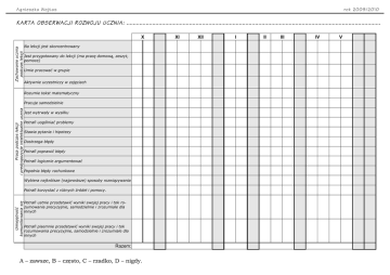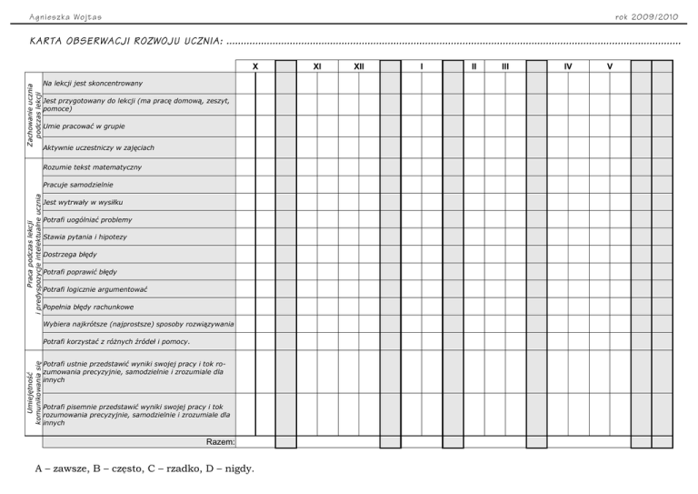 Ag nie szka Wo jta s ro k 2009 /2010 KARTA OBSERWACJI ROZWOJU UCZNIA: .............................................................................................................................................................. Zachowanie ucznia podczas lekcji X Na lekcji jest skoncentrowany Jest przygotowany do lekcji (ma pracę domową, zeszyt, pomoce) Umie pracować w grupie Aktywnie uczestniczy w zajęciach Rozumie tekst matematyczny Praca podczas lekcji i predyspozycje intelektualne ucznia Pracuje samodzielnie Jest wytrwały w wysiłku Potrafi uogólniać problemy Stawia pytania i hipotezy Dostrzega błędy Potrafi poprawić błędy Potrafi logicznie argumentować Popełnia błędy rachunkowe Wybiera najkrótsze (najprostsze) sposoby rozwiązywania Umiejętność komunikowania się Potrafi korzystać z różnych źródeł i pomocy. Potrafi ustnie przedstawić wyniki swojej pracy i tok rozumowania precyzyjnie, samodzielnie i zrozumiale dla innych Potrafi pisemnie przedstawić wyniki swojej pracy i tok rozumowania precyzyjnie, samodzielnie i zrozumiale dla innych Razem: A – zawsze, B – często, C – rzadko, D – nigdy. XI XII I II III IV V