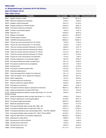 SPEC-NAR ul. Błogosławionego Czesława 58 44-100 Gliwice [email protected] http://spec-nar.pl/ Produkty 33811 - Adaptor do bitów na SDS Cena (brutto) Cena (netto) 124,86 zł 101,51 zł 44,32 zł 36,03 zł 38275 - Ściągacz izolacji przewodów 142,41 zł 115,78 zł 38859 - Ściągacz pobijak do końcówek drążka 109,24 zł 88,81 zł 38896 - Przyrząd do skręcania przewodów 245,91 zł 199,93 zł 35384 - Miseczka magnetyczna (niebieska) 39669 - Chwytak na przewodzie giętkim 19,45 zł 15,81 zł 40099 - Kątomierz 1/2" 105,20 zł 85,53 zł 40144 - Magnes na teleskopie 200,42 zł 162,94 zł 43986 - Pompka paliwa do diesla 140,21 zł 113,99 zł 48352 - 1200MM mistrzowska poziomica 608,65 zł 494,84 zł 50813 - Tłocznik do rurek hamulcowych 3/8" (do 37870) 12,85 zł 10,45 zł 50814 - Tłocznik do rurek hamulcowych 1/2" (do 37870) 15,06 zł 12,24 zł 51844 - Taśma do montażu pierścieni tłokowych 45-75mm 66,80 zł 54,31 zł 51845 - Taśma do montażu pierścieni tłokowych 60-100mm 95,21 zł 77,41 zł 51846 - Taśma do montażu pierścieni tłokowych 75-140mm 110,10 zł 89,51 zł 51847 - Taśma do montażu pierścieni tłokowych 70-150mm 119,91 zł 97,49 zł 51880 - Tłocznik do rurek hamulcowych 5/16"(do37870) 12,18 zł 9,90 zł 52305 - Chwytak magnetyczny na przewodzie giętkim 36,70 zł 29,84 zł 52306 - Przyrząd do blokowania wałka rozrządu Rover 25,71 zł 20,90 zł 52329 - Przyrząd do ustawiania tarczy sprzęgłowej 88,14 zł 71,66 zł 52339 - Szczelinomierz 63,42 zł 51,56 zł 52578 - Przyrząd do ustawiania wałka OPEL 113,32 zł 92,13 zł 54503 - Stetoskop diagnostyczny 93,18 zł 75,76 zł 55591 - Taśma do opasek 8mm, długość 3m+napinacze 53,11 zł 43,18 zł 55592 - Taśma do opasek 12mm, długość 3m+napinacz 69,00 zł 56,10 zł 56332 - Miska magnetyczna 73,74 zł 59,95 zł 57817 - Przewód sztywny do smarownicy 22,32 zł 18,15 zł 57841 - Wąż do smarownicy długość 300mm 50,23 zł 40,84 zł 57875 - Końcówka do smarownicy 29,94 zł 24,34 zł 569,01 zł 462,61 zł 61262 - Zestaw do blokowania rozrządu FORD Zetec 20,47 zł 16,64 zł 61276 - Kostka do blokowania wałków rozrządu Opel Ecotec 1,8 / 2,0 16V blokada rozrządu 35,35 zł 28,74 zł 61277 - Kostka do blokowania wałka rozrządu Opel Ecotec 1.4 / 1.6 16V 40,59 zł 33,00 zł 66198 - Chwytak magnetyczny na przewodzie giętkim 101,98 zł 82,91 zł 68703 - Przyrząd do regeneracji gwintów 226,97 zł 184,53 zł 86,26 zł 70,13 zł 69928 - Przyrząd do blokady wałka rorządu GM, OPEL, ISU 109,94 zł 89,38 zł 69929 - Przyrząd do blokady wałka rozrządu GM, OPEL, IS 145,21 zł 118,06 zł 69935 - Przyrząd do blokowania koła zamachowego OPEL - VECTRA, OMEGA 100,29 zł 81,54 zł 71204 - Przyrząd do blokady wałka rozrządu VW - GOLF, POLO, BORA 107,06 zł 87,04 zł 72805 - Pojemnik 360x160mm na narzędzia magnetyczne 59085 - Przyrząd do ściskania sprężyn zaworowych uniwersalny 69721 - Młotek do sprawdzania korozji 206,50 zł 167,89 zł 72845 - Magnetyczny uchwyt 50mm 58,86 zł 47,85 zł 73970 - Szczelinomierz 0.0015-0.025mm 15,56 zł 12,65 zł 73988 - Szczelinomierz 0.05-0.8mm 15,90 zł 12,93 zł 73996 - Szczelinomierz 0.05-1 mm 25,20 zł 20,49 zł 211,71 zł 172,12 zł 78665 - Uchwyt magnetyczny Cena promocyjna 89767 - Stojak pod głowicę silnika 208,72 zł 169,69 zł 10195 - Chwytak magnetyczny 18,77 zł 15,26 zł 10263 - Lusterko na przegubie 50,41 zł 40,98 zł 10409 - Przyrząd do docierania zaworów 10,89 zł 8,85 zł 10913 - Przecinak do nakrętek 9-12 mm 45,33 zł 36,85 zł 10915 - Przecinak do nakrętek 12-16 mm 68,29 zł 55,52 zł 10916 - Przecinak do nakrętek 16-22 mm 77,80 zł 63,25 zł 11176 - Wycinak otworów w skórze 60,21 zł 48,95 zł 11954 - Lusterko na przewodzie giętkim 49,38 zł 40,15 zł 12389 - Nożyce do cięcia plastiku miedzi, aluminium 41,44 zł 33,69 zł 13094 - Ostrza nożyków wymienne duże, łamane 12,18 zł 9,90 zł 13095 - Ostrza nożyków wymienne małe,łamane 11,33 zł 9,21 zł 13892 - Ściągacz do sprężyn zaworowych OHC 261,49 zł 212,59 zł 41,77 zł 33,96 zł 19862 - Ściągacz do kół zamachowych MINI,METRO,AUSTIN 174,54 zł 141,90 zł 26513 - Łyżka do opon 400mm 161,51 zł 131,31 zł 26521 - Łyżka do opon 500mm 212,38 zł 172,67 zł 26539 - Łyżka do opon 600mm 217,86 zł 177,12 zł 26670 - Ściągacz do pierścieni tłokowych 252,41 zł 205,21 zł 26967 - Ściągacz do sprężyn zaworowych OHV 407,60 zł 331,38 zł 27,91 zł 22,69 zł 8,62 zł 7,01 zł 33607 - Ściągacz do zaworów OPEL z hydrauliką 95,05 zł 77,28 zł 11534 - Szczypce do zaciskania przewodów hamulcowych 25,71 zł 20,90 zł 625,69 zł 508,69 zł 19613 - Szczelinomierz 0.03-1.0mm, 0.00 33080 - Magnes na teleskopie (wkrętak) 33554 - Pilnik do styków przerywaczy 12949 - Nożyce do cięcia drutu (7mm) 12950 - Nożyce do cięcia drutu (10mm) 899,87 zł 731,60 zł 12951 - Nożyce do cięcia drutu do śub (13mm) 1.156,21 zł 940,01 zł 12952 - Nożyce do cięcia drutu do śrub (16mm) 1.561,98 zł 1.269,90 zł 13157 - Szczoteczka druciana 15,01 zł 12,20 zł 13701 - Nitownica ręczna z rekojeścią 860-3 437,02 zł 355,30 zł 14001 - Nożyce do cięcia prętów stalowych 6 487,93 zł 396,69 zł 29907 - Klucz nastawny No 16 230mm 98,26 zł 79,89 zł 36923 - Skrobak do uszczelek 37,38 zł 30,39 zł 37439 - Narzędzie do wyciągania o-ringów, uszczelek 69,35 zł 56,38 zł 38274 - Ściągacz izolacji przewodów 147,48 zł 119,90 zł 40100 - Przyrząd do cięcia rur wydechowych 35 - 64mm 271,45 zł 220,69 zł 40154 - Trzpienie ustalające 104,35 zł 84,84 zł 43058 - Przyrząd do sprawdzania naciągu paska rozrządu 684,03 zł 556,12 zł 43256 - Urządzenie do czyszczenia ożebrowania chłodnicy 85,74 zł 69,71 zł 52334 - Przyrząd do wciskania tłoka zacisku 41,77 zł 33,96 zł 52335 - Narzędzie do serwisu hamulca 227,48 zł 184,94 zł 56383 - Skrzynka z konektorami 776,70 zł 631,46 zł 61094 - Zaciskarka do końcówek TV 196,19 zł 159,50 zł 38,73 zł 31,49 zł 69934 - Przyrząd 