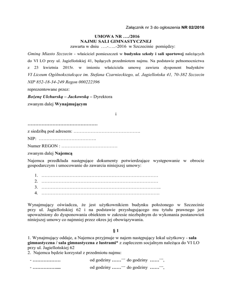 Załącznik nr 3 do ogłoszenia NR 02/2016 UMOWA NR …./2016 NAJMU SALI GIMNASTYCZNEJ zawarta w dniu ….-…..-2016 w Szczecinie pomiędzy: Gminą Miasto Szczecin - właściciel pomieszczeń w budynku szkoły i sali sportowej należących do VI LO przy ul. Jagiellońskiej 41, będących przedmiotem najmu. Na podstawie pełnomocnictwa z 23 kwietnia 2015r. w imieniu właściciela umowę zawiera dysponent budynków VI Liceum Ogólnokształcące im. Stefana Czarnieckiego, ul. Jagiellońska 41, 70-382 Szczecin NIP 852-18-34-249 Regon 000222396 reprezentowane przez: Bożenę Ulchurską – Jackowską – Dyrektora zwanym dalej Wynajmującym i ……………………………………… z siedzibą pod adresem: ……………………………………. NIP: ………………………………. Numer REGON : ……………………………… zwanym dalej Najemcą Najemca przedkłada następujące dokumenty potwierdzające występowanie w obrocie gospodarczym i umocowanie do zawarcia niniejszej umowy: 1. 2. 3. 4. ………………………………………………………………… ………………………………………………………………… ………………………………………………………………….. …………………………………………………………………. Wynajmujący oświadcza, że jest użytkownikiem budynku położonego w Szczecinie przy ul. Jagiellońskiej 62 i na podstawie przysługującego mu tytułu prawnego jest upoważniony do dysponowania obiektem w zakresie niezbędnym do wykonania postanowień niniejszej umowy co najmniej przez okres jej obowiązywania. §1 1. Wynajmujący oddaje, a Najemca przyjmuje w najem następujący lokal użytkowy - sala gimnastyczna / sala gimnastyczna z lustrami* z zapleczem socjalnym należąca do VI LO przy ul. Jagiellońskiej 62 2. Najemca będzie korzystał z przedmiotu najmu: - ……………… od godziny ………. do godziny ………., - …………….... od godziny ………. do godziny ………., 3. Najemca nie będzie korzystał z najmu w miesiącach: maj, ………………………. 4. Najemca przedmiot najmu będzie używał na cele: prowadzenie zajęć ……………..………. …………………………………………………………………………………...……………… …………………………………………………………………………………………………... §2 1. Najemca oświadcza, że przedmiot najmu jest w stanie przydatnym do umówionego użytku. 2. Najemca zobowiązuje się utrzymywać przedmiot najmu w należytym stanie technicznym i sanitarnym. 3. Sprzątanie przedmiotu najmu po zajęciach należy do obowiązków Najemcy. §3 Najemca zobowiązany jest do: 1. używania przedmiotu najmu w sposób zgodny z celem określonym w niniejszej umowie 2. przestrzegania przepisów bhp i ppoż. 3. niezwłocznego informowania o naprawach obciążających Wynajmującego, 4. naprawy lub pokrycia szkód wyrządzonych przez Najemcę lub osoby trzecie używające przedmiotu najmu w związku z działalnością Najemcy. 5. przestrzegania postanowień regulaminu korzystania z sali gimnastycznej §4 1. Za najem Najemca zobowiązany jest płacić Wynajmującemu czynsz według harmonogramu godzin korzystania z sali w danym miesiącu sporządzonym do 2 dnia danego miesiąca. Za korzystanie z pomieszczenia będącego przedmiotem najmu odpłatność wynosi ….zł netto za każdą godzinę (słownie: ……………… 00/100). 2. Harmonogram godzin, o którym mowa w ust.1 musi zakładać korzystanie z sali gimnastycznej przez minimum 75 % godzin możliwych do wykorzystania w miesiącu. W przypadku braku harmonogramu lub dostarczenia go po terminie określonym w ust.1 przyjmuje się, że najem obejmuje wszystkie godziny występujące w danym miesiącu. 3. W przypadku, gdy faktyczna ilość godzin korzystania z sali będzie mniejsza od wynikającej z harmonogramu, wówczas naliczony czynsz nie ulega zmianie. 4. Czynsz najmu płatny jest co miesiąc, w terminie do 10-go każdego miesiąca kalendarzowego za miesiąc bieżący, na rachunek bankowy Wynajmującego 12 1020 4795 0000 9102 0278 1805. 5. W przypadku opóźnienia w zapłacie należności, Wynajmujący ma prawo do naliczenia odsetek ustawowych za okres opóźnienia. 6. Za dzień dokonania płatności czynszu przyjmuje się datę wpływu środków na rachunek bankowy Wynajmującego. 7. Najemca upoważnia Wynajmującego do wystawiania faktur VAT, bez podpisu odbiorcy. 8. W przypadku wzrostu kosztów utrzymania przedmiotu najmu, Wynajmujący może podwyższyć czynsz najmu w drodze pisemnego zawiadomienia o wysokości nowej stawki. W takim przypadku Najemca, jeżeli nie wyrazi zgody na nową stawkę czynszu, może rozwiązać umowę za 1- miesięcznym wypowiedzeniem. Jeżeli nowa stawka czynszu zostanie przyjęta, to będzie ona obowiązywać od 1-go dnia miesiąca, po miesiącu w którym doręczono najemcy zawiadomienie o zmianie stawki czynszu. §5 1.Umowa zostaje zawarta na czas określony od ………..2016r. do ………..201….r. 2.Wynajmujący może rozwiązać umowę w następujących przypadkach: a) zwłoki z zapłatą czynszu za dwa pełne okresy płatności, b) używania przedmiotu najmu niezgodnie z celem określonym w umowie, c) zaniedbywania przedmiotu najmu do tego stopnia, że zostaje narażony na uszkodzenie lub utratę, d) gdy przedmiot najmu stanie się niezbędny Wynajmującemu na cele związane z prowadzoną działalnością statutową, których nie mógł przewidzieć w dacie podpisania niniejszej umowy. §6 Najemca nie może oddawać przedmiotu najmu w podnajem lub bezpłatne używanie. §7 1. Wszelkie zmiany lub ulepszenia przedmiotu najmu wymagają pisemnej zgody Wynajmującego. 2. Nakłady Najemcy lub ulepszenia przedmiotu najmu nie podlegają zwrotowi, ani też zaliczeniu na poczet czynszu. Najemca zrzeka się roszczenia o zwrot nakładów ulepszających. §8 Do