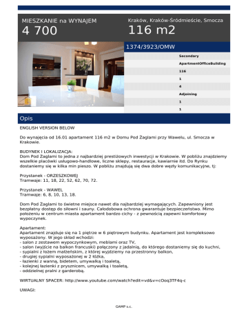 MIESZKANIE na WYNAJEM 4 700 Kraków, Kraków-Śródmieście, Smocza 116 m2 1374/3923/OMW Secondary ApartmentOfficeBuilding 116 1 4 Adjoining 1 1 Opis ENGLISH VERSION BELOW Do wynajęcia od 16.01 apartament 116 m2 w Domu Pod Żaglami przy Wawelu, ul. Smocza w Krakowie. BUDYNEK I LOKALIZACJA: Dom Pod Żaglami to jedna z najbardziej prestiżowych inwestycji w Krakowie. W pobliżu znajdziemy wszelkie placówki usługowo-handlowe, liczne sklepy, restauracje, kawiarnie itd. Do Rynku dostaniemy się w kilka min pieszo. W pobliżu znajdują się dwa dobre węzły komunikacyjne, tj: Przystanek - ORZESZKOWEJ Tramwaje: 11, 18, 22, 52, 62, 70, 72. Przystanek - WAWEL Tramwaje: 6, 8, 10, 13, 18. Dom Pod Żaglami to świetne miejsce nawet dla najbardziej wymagających. Zapewniony jest bezpłatny dostęp do siłowni i sauny. Całodobowa ochrona gwarantuje bezpieczeństwo. Mimo położeniu w centrum miasta apartament bardzo cichy - z pewnością zapewni komfortowy wypoczynek. Apartament: Apartament znajduje się na 1 piętrze w 6 piętrowym budynku. Apartament jest kompleksowo wyposażony. W jego skład wchodzi: - salon z zestawem wypoczynkowym, meblami oraz TV, - salon (wyjście na balkon francuski) połączony z jadalnią, do którego dostaniemy się do kuchni, - sypialni z łożem małżeńskim, z której wyjdziemy na przestronny balkon, - drugiej sypialni wyposażonej w 2 łóżka, - łazienki z wanną, bidetem, umywalką i toaletą, - kolejnej łazienki z prysznicem, umywalką i toaletą, - oddzielnej pralni z garderobą. WIRTUALNY SPACER: http://www.youtube.com/watch?edit=vd&v=cOoq3TF4q-c UWAGI: GAMP s.c. - wolne od 16.01, prestiżowe położenie, ogrzewanie i woda w cenie czynszu, siłownia i sauna, miejsce w garażu podziemnym w cenie, osobna pralnia z garderobą, dwie łazienki, dwie sypialnie, balkon, wyposażone w zmywarkę, TV i klimatyzację, luksusowa nieruchomość. FINANSE: - 4700 PLN + 1300 PLN czynsz administracyjny (w tym: zaliczki na ogrzewanie i wodę, śmieci, fundusz remontowy, utrzymanie części wspólnych, ochrona, monitoring, siłownia, sauna) + prąd wg. zużycia, - jednorazowa kaucja zwrotna, - prowizja dla biura. Serdecznie polecam! Bardzo proszę o kontakt – na pewno znajdziemy idealne mieszkanie spełniające Państwa preferencje. Zachęcamy również do odwiedzenia naszej strony internetowej: www.gamp-krakow.pl KONTAKT DO AGENTA: Karol Piwoński +48 533 87 87 80 Email: [email protected] ENGLISH I am offering a great four room flat to rent on Smocza Street a few meters from Wawel Castle in Krakow. LOCATION: The building – Dom Pod Zaglami is located in the centre part of Cracow, near Wawel Castle and Main Square. The neighborhood is calm and quiet, a bus stop is only few walking minutes away. You can feel the magic of the city. All the shops, restaurants and the other necessary service points are very close to the apartment. Wisla is nearby. APARTMENT: The apartment is located on the first floor. It has a surface of 116 sq meters. It consists of a 2 living rooms, two bedrooms, a walk-in wardrobe with a laundry and 2 bathrooms. The apartment is fully furnished and equipped (beddings, towels, TV etc.). Underground parking spot included. VIRTUAL WALK available on YouTube: http://www.youtube.com/watch?edit=vd&v=cOoq3TF4q-c COST: - 4700 PLN + 1300 PLN administrative rent (water and heating included, 24h security, gym, sauna) + electricity + real estate agency commission. - one month deposit necessary. I highly recommend! We have other flats. If you looking for flat please contact us, we will help you find accommodation! We encourage to visit our website: GAMP s.c. www.gamp-krakow.pl Contact: Karol Piwonski No.: +48 533 87 87 80 Email: [email protected] GAMP Nieruchomości. Nowa jakość. Karol Piwoński tel. +48 533 878 780 email: [email protected] GAMP s.c. Powered by TCPDF (www.tcpdf.org)