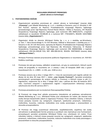 REGULAMIN SPRZEDAŻY PREMIOWEJ „Jakośd ubrana w technologię” 1. POSTANOWIENIA OGÓLNE 1.1. Organizatorem sprzedaży premiowej pt. „Jakośd ubrana w technologię” (zwanej dalej „Promocją”), jest Albedo Marketing sp. z o.o. z siedzibą w Poznaniu, przy ul. Góralska 3, 60623 Poznao, wpisana do Rejestru Przedsiębiorców Krajowego Rejestru Sądowego prowadzonego przez Sąd Rejonowy Poznao-Nowe Miasto i Wilda w Poznaniu, VIII Wydział Gospodarczy Krajowego Rejestru Sądowego, pod numerem KRS 0000125373, o kapitale zakładowym w wysokości 50.000,00 zł, o numerze NIP: 7792183071, REGON: 634370884 (zwana dalej „Organizatorem”). 1.2. Organizator działa na zlecenie Whirlpool Polska Sp. z o. o. z siedzibą we Wrocławiu, ul. Gen. T. Bora-Komorskiego 6, 51-210 Wrocław, Oddział w Warszawie z siedzibą przy ul. 1 Sierpnia nr 6A, 02-134 Warszawa, wpisanej do Rejestru Przedsiębiorców Krajowego Rejestru Sądowego, prowadzonego przez Sąd Rejonowy dla Wrocławia Fabrycznej, VI Wydział Gospodarczy Krajowego Rejestru Sądowego pod numerem KRS 0000025866, o kapitale zakładowym 294.341.430,00 PLN, NIP: 896-000-04-92, REGON: 930756620 (zwanej dalej „Whirlpool Polska”). 1.3. Niniejsza Promocja stanowi przyrzeczenie publiczne Organizatora w rozumieniu art. 919-921 Kodeksu cywilnego. 1.4. Promocja nie jest grą losową, zakładem wzajemnym, ani grą na automatach, których wynik zależy od przypadku w rozumieniu art. 2 ustawy z dnia 19 listopada 2009 roku o grach hazardowych (Dz. U. z 2009 r. nr 201, poz. 1540 ze zm.). 1.5. Promocja zaczyna się w dniu 1 lutego 2017 r. i trwa do wyczerpania puli nagród, jednak nie dłużej niż do dnia 30 maja 2017 r. (dalej: „czas trwania Promocji”). Sprzedaż produktów promocyjnych uprawniająca do wzięcia udziału w Promocji, o których mowa w pkt 2.1. regulaminu, rozpocznie się w dniu 1 lutego 2017 roku i potrwa do dnia 30 kwietnia 2017 roku. Czynności związane z wydawaniem nagród i rozpatrywaniem reklamacji zostaną zakooczone do dnia 30 czerwca 2017 r. 1.6. Promocja prowadzona jest na terytorium Rzeczypospolitej Polskiej. 1.7. W Promocji nie mogą brad udziału pracownicy (niezależnie od podstawy zatrudnienia): Albedo Marketing sp. z o.o., Whirlpool Polska oraz członkowie ich rodzin, jak również inne osoby biorące bezpośredni udział w organizacji Promocji. Przez członków rodziny, o których mowa powyżej rozumie się: wstępnych, zstępnych, opiekunów prawnych, rodzeostwo, małżonków, kuzynów, rodziców małżonków oraz osoby pozostające z pracownikiem w stosunku przysposobienia. 1.8. W Promocji nie mogą uczestniczyd właściciele, współwłaściciele, wspólnicy lub osoby zatrudnione w jakiejkolwiek formie prawnej w punktach sieci dystrybucji oraz hurtowniach, prowadzących sprzedaż produktów Whirlpool Polska oraz członkowie ich rodzin. Przez członków rodziny, o których mowa powyżej rozumie się: wstępnych, zstępnych, opiekunów prawnych, rodzeostwo, małżonków, kuzynów, rodziców małżonków oraz osoby pozostające z pracownikiem w stosunku przysposobienia. 1 1.9. Promocja przeznaczona jest wyłącznie dla zamieszkałych na terytorium Rzeczpospolitej Polskiej pełnoletnich osób fizycznych, posiadających pełną zdolnośd do czynności prawnych, które dla celów niezwiązanych z prowadzoną działalnością gospodarczą, w charakterze konsumentów zgodnie z art. 221 Kodeksu cywilnego, kupują od profesjonalnych podmiotów działających na rynku polskim produkty objęte Promocją, o których mowa w pkt 2.1. regulaminu (dalej: „Uczestnik”). 1.10. Strona internetowa Promocji dostępna jest pod adresem whirlpool-promocja.pl (dalej: „Strona Promocji”). 1.11. W przypadku wyczerpania się puli nagród w Promocji i zakooczenia Promocji, Organizator nie będzie przyjmował nowych zgłoszeo od Uczestników. 2. WARUNKI UCZESTNICTWA W PROMOCJI 2.1. Promocją objęte są wszystkie modele pralek ładowanych od góry „WHIRLPOOL”, o identyfikatorze „TDLR”, oraz wszystkie modele pralek „WHIRLPOOL” ładowanych od przodu o pojemności 6 kg i więcej dostępne w sieci dystrybucji Whirlpool Polska na terenie Polski w czasie trwania Promocji (zwane dalej „Produktami Promocyjnymi”). 2.2. Promocja polega na nagrodzeniu Uczestnika, który w czasie trwania Promocji zapewni spełnienie wszystkich następujących działao: a) zakupi jeden z Produktów Promocyjnych w okresie od 1 lutego 2017 r. do 30 kwietnia 2017 roku; b) zgłosi w ciągu 30 dni od zakupu, jednak nie później niż do dnia 30 maja 2017 roku, zakup Produktu Promocyjnego Organizatorowi poprzez przesłanie prawidłowo wypełnionego formularza zgłoszeniowego, zgodnie z zasadami określonymi w pkt 2.3.-2.5. regulaminu (dalej: „formularz zgłoszeniowy”). 2.3. Prawidłowo wypełniony formularz zgłoszeniowy powinien zawierad następujące dane Uczestnika: a) imię i nazwisko, b) adres do korespondencji, c) numer telefonu komórkowego, d) unikatowy adres e-mail, e) informacje o zakupionym Produkcie Promocyjnym w postaci: modelu Produktu Promocyjnego, numeru seryjnego Produktu Promocyjnego, daty zakupu Produktu Promocyjnego. 2.4. Uczestnik może zgłosid w Promocji zakup tylko jednego Produktu Promocyjnego. 2.5. Do formularza zgłoszeniowego powinna zostad dołączona kopia lub skan dowodu zakupu danego Produktu Promocyjnego (paragon fiskalny lub faktura VAT wystawiona osobie fizycznej niebędącej przedsiębiorcą). 2.6. Wypełniając formularz zgłoszeniowy dana osoba obowiązana jest złożyd oświadczenie o zapoznaniu się z regulaminem Promocji, wyrazid zgodę na przetwarzanie jej danych osobowych na potrzeby realizacji Promocji, zgodę na przesyłanie na podany przez Uczestnika 2 adres e-mail informacji handlowych dotyczących produktów Whirlpool Polska. Podanie danych osobowych oraz złożenie powyższych oświadczeo ma charakter dobrowolny, jednak dokonanie wszystkich tych czynności jest konieczne dla wzięcia udziału w Promoc