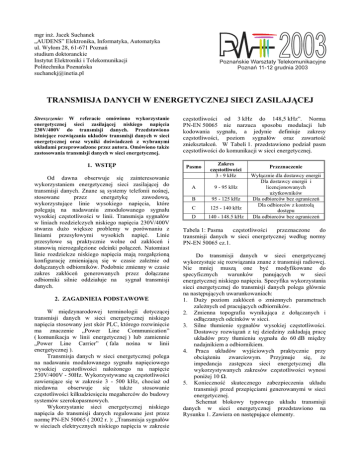2003 mgr inĪ. Jacek Suchanek „AUDENS” Elektronika, Informatyka, Automatyka ul. Wyáom 28, 61-671 PoznaĔ studium doktoranckie Instytut Elektroniki i Telekomunikacji Politechnika PoznaĔska [email protected] Poznañskie Warsztaty Telekomunikacyjne Poznañ 11-12 grudnia 2003 TRANSMISJA DANYCH W ENERGETYCZNEJ SIECI ZASILAJĄCEJ Streszczenie: W referacie omówiono wykorzystanie energetycznej sieci zasilającej niskiego napiĊcia 230V/400V do transmisji danych. Przedstawiono istniejące rozwiązania ukáadów transmisji danych w sieci energetycznej oraz wyniki doĞwiadczeĔ z wybranymi ukáadami przeprowadzone przez autora. Omówiono takĪe zastosowania transmisji danych w sieci energetycznej. 1. WSTĉP Od dawna obserwuje siĊ zainteresowanie wykorzystaniem energetycznej sieci zasilającej do transmisji danych. Znane są systemy telefonii noĞnej, stosowane przez energetykĊ zawodową, wykorzystujące linie wysokiego napiĊcia, które polegają na nadawaniu zmodulowanego sygnaáu wysokiej czĊstotliwoĞci w linii. Transmisja sygnaáów w liniach rozdzielczych niskiego napiĊcia 230V/400V stwarza duĪo wiĊksze problemy w porównaniu z liniami przesyáowymi wysokich napiĊü. Linie przesyáowe są praktycznie wolne od zakáóceĔ i stanowią nierozgaáĊzione odcinki poáączeĔ. Natomiast linie rozdzielcze niskiego napiĊcia mają rozgaáĊzioną konfiguracjĊ zmieniającą siĊ w czasie zaleĪnie od doáączanych odbiorników. Podobnie zmienny w czasie zakres zakáóceĔ generowanych przez doáączane odbiorniki silnie oddziaáuje na sygnaá transmisji danych. 2. ZAGADNIEIA PODSTAWOWE W miĊdzynarodowej terminologii dotyczącej transmisji danych w sieci energetycznej niskiego napiĊcia stosowany jest skór PLC, którego rozwiniĊcie ma znaczenie „Power Line Communication” ( komunikacja w linii energetycznej ) lub zamiennie „Power Line Carrier” ( fala noĞna w linii energetycznej ). Transmisja danych w sieci energetycznej polega na nadawaniu modulowanego sygnaáu napiĊciowego wysokiej czĊstotliwoĞci naáoĪonego na napiĊcie 230V/400V - 50Hz. Wykorzystywane są czĊstotliwoĞci zawierające siĊ w zakresie 3 - 500 kHz, chociaĪ od niedawna obserwuje siĊ takĪe stosowanie czĊstotliwoĞci kilkudziesiĊciu megaherców do budowy systemów szerokopasmowych. Wykorzystanie sieci energetycznej niskiego napiĊcia do transmisji danych regulowane jest przez normĊ PN-EN 50065 ( 2002 r. ): „Transmisja sygnaáów w sieciach elektrycznych niskiego napiĊcia w zakresie czĊstotliwoĞci od 3 kHz do 148,5 kHz”. Norma PN-EN 50065 nie narzuca sposobu modulacji lub kodowania sygnaáu, a jedynie definiuje zakresy czĊstotliwoĞci, poziom sygnaáów oraz zawartoĞü znieksztaáceĔ. W Tabeli 1. przedstawiono podziaá pasm czĊstotliwoĞci do komunikacji w sieci energetycznej. Pasmo Zakres czĊstotliwoĞci 3 - 9 kHz A 9 - 95 kHz B 95 - 125 kHz C 125 - 140 kHz D 140 - 148.5 kHz Przeznaczenie Wyáącznie dla dostawcy energii Dla dostawcy energii i licencjonowanych uĪytkowników Dla odbiorców bez ograniczeĔ Dla odbiorców z kontrolą dostĊpu Dla odbiorców bez ograniczeĔ Tabela 1: Pasma czĊstotliwoĞci przeznaczone do transmisji danych w sieci energetycznej wedáug normy PN-EN 50065 cz.1. Do transmisji danych w sieci energetycznej wykorzystuje siĊ rozwiązania znane z transmisji radiowej. Nie mniej muszą one byü modyfikowane do specyficznych warunków panujących w sieci energetycznej niskiego napiĊcia. Specyfika wykorzystania sieci energetycznej do transmisji danych polega gáównie na nastĊpujących uwarunkowaniach: 1. DuĪy poziom zakáóceĔ o zmiennych parametrach zaleĪnych od pracujących odbiorników. 2. Zmienna topografia wynikająca z doáączanych i odáączanych odcinków w sieci. 3. Silne táumienie sygnaáów wysokiej czĊstotliwoĞci. Dostawcy rozwiązaĔ z tej dziedziny zakáadają pracĊ ukáadów przy táumieniu sygnaáu do 60 dB miĊdzy nadajnikiem a odbiornikiem. 4. Praca ukáadów wyjĞciowych praktycznie przy obciąĪeniu zwarciowym. Przyjmuje siĊ, Īe impedancja zastĊpcza sieci energetycznej dla wykorzystywanych zakresów czĊstotliwoĞci wynosi poniĪej 10 . 5. KoniecznoĞü skutecznego zabezpieczenia ukáadu transmisji przed przepiĊciami generowanymi w sieci energetycznej. Schemat blokowy typowego ukáadu transmisji danych w sieci energetycznej przedstawiono na Rysunku 1. Zawiera on nastĊpujące elementy. 3. PRZYKàADY UKàADÓW TRANSMISJI DANYCH W SIECI ENERGETYCZNEJ Sygnaá w. cz. 1 Sygnaá TTL 2 Dane 3 4 Sygnaá w. cz. + napiĊcie sieci Interfejs 5 Sieü 230V / 400V 1 - ukáad separacji 2 - modulator / detektor 3 - mikroprocesor 4 - interfejs zewnĊtrzny 5 - ukáady wspomagające Rys 1. Schemat blokowy ukáadu PLC Ukáad separacji systemu od napiĊcia sieci i zabezpieczający przed przepiĊciami ( 1 ). Skáada siĊ zwykle z szeregowo poáączonego kondensatora na którym odkáada siĊ napiĊcie sieci, transformatora separującego w.cz. i typowych elementów zabezpieczeĔ przeciwprzepiĊciowych. Ukáad modulatora / detektora ( 2 ) realizujący modulacjĊ fali noĞnej uĪytecznym sygnaáem cyfrowym oraz detekcjĊ sygnaáu odebranego z sieci. System mikroprocesorowy zarządzający caáym ukáadem ( 3 ), kontrolujący poprawnoĞü transmisji poprzez generacjĊ sum kontrolnych, przygotowanie i kontrolĊ ramek. Interfejs sáuĪący do poáączenia z systemem uĪytkowym ( 4 ). Stosowane są tu typowe systemy transmisji szeregowej, jak RS-232, RS-485 lub sygnaáy TTL. Spotykane są takĪe poáączenia równolegáe. Elementy dodatkowe niezbĊdne do pracy caáego systemu ( 5 ) jak np. generatory czĊstotliwoĞci, pamiĊci póáprzewodnikowe, zasilacze. W niektórych rozwiązaniach te elementy są scalone z innymi elementami systemu, a w innych naleĪy je wykonaü osobno. W prostych systemach transmisji PLC wykorzystuje siĊ ukáad dwuprzewodowy: jeden przewód fazowy i przewód neutralny. W wielu wypadkach obserwuje siĊ przenikanie sygnaáu miĊdzy przewodami faz