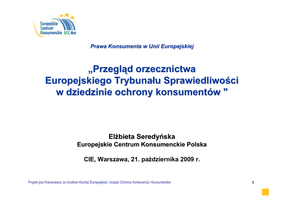 Prawa Konsumenta w Unii Europejskiej „Przegląd orzecznictwa Europejskiego Trybunału Sprawiedliwości w dziedzinie ochrony konsumentów " ElŜbieta Seredyńska Europejskie Centrum Konsumenckie Polska CIE, Warszawa, 21. października 2009 r. Projekt jest finansowany ze środków Komisji Europejskiej i Urzędu Ochrony Konkurencji i Konsumentów 1 Omawiane orzeczenia Orzeczenie C-180/06 Renate Ilsinger v Martin Dreschers Orzeczenie C-204/08 Peter Rehder v. Air Baltic Orzeczenie C-243/08 Pannon v. E. Sustikne Gyórfi Orzeczenie ETS C-489/07 – Pia Messner v. Stefan Krueger Orzeczenie ETS C-261/07 VTB-VAN NV v. Total Belgium oraz C299/07 Galatea BVBA v. Sanoma Magazines Belgium NV Orzeczenie C-549/07 Friederike Wallentin-Hermann v. Alitalia Projekt jest finansowany ze środków Komisji Europejskiej i Urzędu Ochrony Konkurencji i Konsumentów 2 Orzeczenie C-180/06 Renate Ilsinger v Martin Dreschers Pani R. Ilsinger otrzymała na swój prywatny adres przesyłkę na swoje nazwisko. Koperta była opatrzona słowami „waŜne dokumenty!”, „natychmiast otworzyć osobiście!”. W środku było zawiadomienie pozwalające jej sądzić, Ŝe wygrała nagrodę 20.000 EUR. Wysłała kupon na odebranie nagrody oraz próbne zamówienie. Nagrody nie otrzymała, złoŜyła więc pozew o wypłatę przeciwko Schlank & Schick w sądzie dla niej właściwym miejscowo (art. 16 ust. 1 Rozporządzenia 44/2001). Schlank & Schick podniosła zarzut braku właściwości sadu, utrzymując, Ŝe art. 15-16 Rozporządzenia 44/2001 nie znajdują zastosowania w sporze z uwagi na fakt, Ŝe zakładają istnienie umowy odpłatnej, której w tym wypadku brak. Projekt jest finansowany ze środków Komisji Europejskiej i Urzędu Ochrony Konkurencji i Konsumentów 3 Orzeczenie C-180/06 Renate Ilsinger v Martin Dreschers W podobnej sprawie C-96/00 Gabriel, gdzie ETS faktycznie wykazywał, Ŝe złoŜenie zamówienia oznaczało związek oferta-zamówienie, tak więc jurysdykcja była właściwa na podstawie art. 13 konwencji brukselskiej. Przeciwnie w orzeczeniu C-27/02 Engler ETS uznał, Ŝe w braku oferty i złoŜonego zamówienia, dochodzenie wypłacenia nagrody na podst. art. 13 konwencji brukselskiej jest niemoŜliwe. Projekt jest finansowany ze środków Komisji Europejskiej i Urzędu Ochrony Konkurencji i Konsumentów 4 Orzeczenie C-180/06 Renate Ilsinger v Martin Dreschers - powództwo wniesione przez konsumenta wchodzi w zakres art. 15 ust. 1 lit. c) Rozporządzenia 44/2001 pod warunkiem, Ŝe zawodowy sprzedawca zobowiązał się prawnie do zapłaty tej nagrody konsumentowi; - Jeśli taka przesłanka nie jest spełniona, to takie powództwo wchodzi w zakres tego przepisu Rozporządzenia 44/2001 tylko przy załoŜeniu, Ŝe konsument rzeczywiście złoŜył zamówienie u tego zawodowego sprzedawcy. Projekt jest finansowany ze środków Komisji Europejskiej i Urzędu Ochrony Konkurencji i Konsumentów 5 Orzeczenie C-204/08 Peter Rehder v. Air Baltic Pan Peter Rehder mieszkający w Monachium zarezerwował w Air Baltic lot z Monachium do Wilna. Ok. 30 minut przed lotem pasaŜerowie zostali poinformowani o odwołaniu lotu. W związku z tym p. Rehder poleciał do Wilna przez Kopenhagę, przybywając na miejsce przeznaczenia 6 godzin po czasie. Pozwem wniesionym do sądu, w okręgu którego znajduje się lotnisko Monachium, wniósł o odszkodowanie w wysokości 250 EUR, uznając, iŜ miejsce odlotu samolotu jest miejscem świadczenia usługi. Air Baltic złoŜyło apelację, podnosząc Ŝe miejscem świadczenia usługi jest Ryga – siedziba Air Baltic. Projekt jest finansowany ze środków Komisji Europejskiej i Urzędu Ochrony Konkurencji i Konsumentów 6 Orzeczenie C-204/08 Peter Rehder v. Air Baltic Miejsce odlotu jak i miejsce przylotu samolotu muszą być uznane za miejsca głównego świadczenia usług będących przedmiotem umowy przewozu lotniczego. KaŜde z miejsc ma wystarczająco bliski związek z okolicznościami sporu, a więc zapewnia ścisły związek. Osoba Ŝądająca odszkodowania na podstawie Rozporządzenia 261/2004 ma prawo skorzystać z moŜliwości wyboru i na podstawie art. 5 ust. 1 lit. b) tiret drugie Rozporządzenia 44/2001 wytoczyć pozwanemu sprawę przed sądem, w okręgu którego znajduje się jedno z tych miejsc. Projekt jest finansowany ze środków Komisji Europejskiej i Urzędu Ochrony Konkurencji i Konsumentów 7 Orzeczenie C-204/08 Peter Rehder v. Air Baltic Art. 5 pkt 1 lit. b) tiret drugie Rozporządzenia 44/2001 naleŜy interpretować w ten sposób, Ŝe w przypadku przewozu lotniczego osób pomiędzy państwami członkowskimi na podstawie umowy zawartej z jednym przewoźnikiem będącym rzeczywistym przewoźnikiem, sądem właściwym do rozpoznania powództwa o odszkodowanie, opartego na powyŜszej umowie i na Rozporządzeniu 261/2004 jest, według wyboru powoda, sąd, w okręgu którego znajduje się miejsce odlotu albo sąd, w okręgu którego znajduje się miejsce przylotu samolotu, uzgodnione w umowie. Projekt jest finansowany ze środków Komisji Europejskiej i Urzędu Ochrony Konkurencji i Konsumentów 8 Orzeczenie C-243/08 Pannon v. E. Sustikne Gyórfi W umowie abonenckiej zawartej pomiędzy Panią Gyorfi a spółką Pannon, która dotyczyła świadczenia usług w zakresie telefonii komórkowej, znajdowało się postanowienie umowne przenoszące właściwość na sąd miejsca siedziby spółki. Strony nie negocjowały tego zapisu, a umowa miała charakter formularza przedłoŜonego po podpisu Pani Gyorfi. Pannon wniósł o wydanie nakazu zapłaty do sądu, na którego obszarze właściwości znajduje się siedziba Pannon. Pani Gyorfi nie kwestionowała tej klauzuli w sądzie, podnosiła natomiast inne zarzuty. Wątpliwości co do właściwości sądu. JednakŜe sąd nie był pewien, czy bez wniosku pani Gyorfi w ogóle powinien sprawę rozpatrywać, a po drugie czy w przypadku badania swojej właściwości powinien orzekać w kwestii uznania klauzuli za abuzywną. Projekt jest 