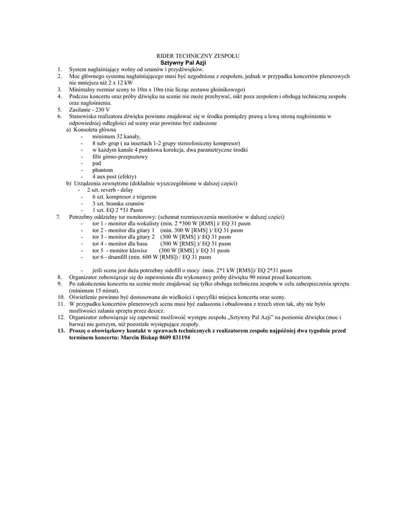 1. 2. 3. 4. 5. 6. 7. 8. 9. 10. 11. 12. 13. RIDER TECHNICZNY ZESPOŁU Sztywny Pal Azji System nagłaśniający wolny od szumów i przydźwięków. Moc głównego systemu nagłaśniającego musi być uzgodniona z zespołem, jednak w przypadku koncertów plenerowych nie mniejsza niż 2 x 12 kW Minimalny rozmiar sceny to 10m x 10m (nie licząc zestawu głośnikowego) Podczas koncertu oraz próby dźwięku na scenie nie może przebywać, nikt poza zespołem i obsługą techniczną zespołu oraz nagłośnienia. Zasilanie - 230 V Stanowisko realizatora dźwięku powinno znajdować się w środku pomiędzy prawą a lewą stroną nagłośnienia w odpowiedniej odległości od sceny oraz powinno być zadaszone a) Konsoleta główna minimum 32 kanały, 8 sub- grup ( na insertach 1-2 grupy stereofoniczny kompresor) w każdym kanale 4 punktowa korekcja, dwa parametryczne środki filtr górno-przepustowy pad phantom 4 aux post (efekty) b) Urządzenia zewnętrzne (dokładnie wyszczególnione w dalszej części) - 2 szt. reverb - delay 6 szt. kompresor z trigerem 3 szt. bramka szumów 1 szt. EQ 2 *31 Pasm Potrzebny oddzielny tor monitorowy: (schemat rozmieszczenia monitorów w dalszej części) tor 1 - monitor dla wokalisty (min. 2 *300 W [RMS] )/ EQ 31 pasm tor 2 - monitor dla gitary 1 (min. 300 W [RMS] )/ EQ 31 pasm tor 3 - monitor dla gitary 2 (300 W [RMS] )/ EQ 31 pasm tor 4 - monitor dla basu (300 W [RMS] )/ EQ 31 pasm tor 5 - monitor klawisz (300 W [RMS] )/ EQ 31 pasm tor 6 - drumfill (min. 600 W [RMS]) / EQ 31 pasm jeśli scena jest duża potrzebny sidefill o mocy (min. 2*1 kW [RMS])/ EQ 2*31 pasm Organizator zobowiązuje się do zapewnienia dla wykonawcy próby dźwięku 90 minut przed koncertem. Po zakończeniu koncertu na scenie może znajdować się tylko obsługa techniczna zespołu w celu zabezpieczenia sprzętu (minimum 15 minut). Oświetlenie powinno być dostosowane do wielkości i specyfiki miejsca koncertu oraz sceny. W przypadku koncertów plenerowych scena musi być zadaszona i obudowana z trzech stron tak, aby nie było możliwości zalania sprzętu przez deszcz. Organizator zobowiązuje się zapewnić możliwość występu zespołu „Sztywny Pal Azji” na poziomie dźwięku (moc i barwa) nie gorszym, niż pozostałe występujące zespoły. Proszę o obowiązkowy kontakt w sprawach technicznych z realizatorem zespołu najpóźniej dwa tygodnie przed terminem koncertu: Marcin Biskup 0609 831194