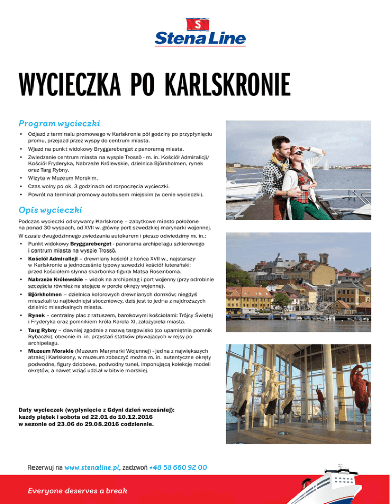 WYCIECZKA PO KARLSKRONIE Program wycieczki • O djazd z terminalu promowego w Karlskronie pół godziny po przypłynięciu promu, przejazd przez wyspy do centrum miasta. • Wjazd na punkt widokowy Bryggareberget z panoramą miasta. • Zwiedzanie centrum miasta na wyspie Trossö - m. in. Kościół Admiralicji/ Kościół Fryderyka, Nabrzeże Królewskie, dzielnica Björkholmen, rynek oraz Targ Rybny. • Wizyta w Muzeum Morskim. • Czas wolny po ok. 3 godzinach od rozpoczęcia wycieczki. • Powrót na terminal promowy autobusem miejskim (w cenie wycieczki). Opis wycieczki Podczas wycieczki odkrywamy Karlskronę – zabytkowe miasto położone na ponad 30 wyspach, od XVII w. główny port szwedzkiej marynarki wojennej. W czasie dwugodzinnego zwiedzania autokarem i pieszo odwiedzimy m. in.: • Punkt widokowy Bryggareberget - panorama archipelagu szkierowego i centrum miasta na wyspie Trossö. • Kościół Admiralicji – drewniany kościół z końca XVII w., najstarszy w Karlskronie a jednocześnie typowy szwedzki kościół luterański; przed kościołem słynna skarbonka-figura Matsa Rosenboma. • Nabrzeże Królewskie – widok na archipelag i port wojenny (przy odrobinie szczęścia również na stojące w porcie okręty wojenne). • Björkholmen – dzielnica kolorowych drewnianych domków; niegdyś mieszkali tu najbiedniejsi stoczniowcy, dziś jest to jedna z najdroższych dzielnic mieszkalnych miasta. • Rynek – centralny plac z ratuszem, barokowymi kościołami: Trójcy Świętej i Fryderyka oraz pomnikiem króla Karola XI, założyciela miasta. • Targ Rybny – dawniej zgodnie z nazwą targowisko (co upamiętnia pomnik Rybaczki); obecnie m. in. przystań statków pływających w rejsy po archipelagu. • Muzeum Morskie (Muzeum Marynarki Wojennej) - jedna z największych atrakcji Karlskrony, w muzeum zobaczyć można m. in. autentyczne okręty podwodne, figury dziobowe, podwodny tunel, imponującą kolekcję modeli okrętów, a nawet wziąć udział w bitwie morskiej. Daty wycieczek (wypłynięcie z Gdyni dzień wcześniej): każdy piątek i sobota od 22.01 do 10.12.2016 w sezonie od 23.06 do 29.08.2016 codziennie. Rezerwuj na www.stenaline.pl, zadzwoń +48 58 660 92 00 Everyone deserves a break 20
