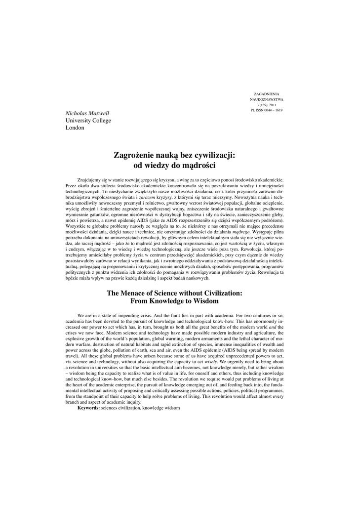 269 ZAGADNIENIA NAUKOZNAWSTWA 3 (189), 2011 PL ISSN 0044 – 1619 Nicholas Maxwell University College London Zagrożenie nauką bez cywilizacji: od wiedzy do mądrości Znajdujemy się w stanie rozwijającego się kryzysu, a winę za to częściowo ponosi środowisko akademickie. Przez około dwa stulecia środowisko akademickie koncentrowało się na poszukiwaniu wiedzy i umiejętności technologicznych. To niesłychanie zwiększyło nasze możliwości działania, co z kolei przyniosło zarówno dobrodziejstwa współczesnego świata i zarazem kryzysy, z którymi się teraz mierzymy. Nowożytna nauka i technika umożliwiły nowoczesny przemysł i rolnictwo, gwałtowny wzrost światowej populacji, globalne ocieplenie, wyścig zbrojeń i śmiertelne zagrożenie współczesnej wojny, zniszczenie środowiska naturalnego i gwałtowne wymieranie gatunków, ogromne nierówności w dystrybucji bogactwa i siły na świecie, zanieczyszczenie gleby, mórz i powietrza, a nawet epidemię AIDS (jako że AIDS rozprzestrzeniło się dzięki współczesnym podróżom). Wszystkie te globalne problemy narosły ze względu na to, że niektórzy z nas otrzymali nie mające precedensu możliwości działania, dzięki nauce i technice, nie otrzymując zdolności do działania mądrego. Występuje pilna potrzeba dokonania na uniwersytetach rewolucji, by głównym celem intelektualnym stała się nie wyłącznie wiedza, ale raczej mądrość – jako że to mądrość jest zdolnością rozpoznawania, co jest wartością w życiu, własnym i cudzym, włączając w to wiedzę i wiedzę technologiczną, ale jeszcze wiele poza tym. Rewolucja, której potrzebujemy umieściłaby problemy życia w centrum przedsięwzięć akademickich, przy czym dążenie do wiedzy pozostawałoby zarówno w relacji wynikania, jak i zwrotnego oddziaływania z podstawową działalnością intelektualną, polegającą na proponowaniu i krytycznej ocenie możliwych działań, sposobów postępowania, programów politycznych z punktu widzenia ich zdolności do pomagania w rozwiązywaniu problemów życia. Rewolucja ta będzie miała wpływ na prawie każdą dziedzinę i aspekt badań naukowych. The Menace of Science without Civilization: From Knowledge to Wisdom We are in a state of impending crisis. And the fault lies in part with academia. For two centuries or so, academia has been devoted to the pursuit of knowledge and technological know-how. This has enormously increased our power to act which has, in turn, brought us both all the great benefits of the modern world and the crises we now face. Modern science and technology have made possible modern industry and agriculture, the explosive growth of the world’s population, global warming, modern armaments and the lethal character of modern warfare, destruction of natural habitats and rapid extinction of species, immense inequalities of wealth and power across the globe, pollution of earth, sea and air, even the AIDS epidemic (AIDS being spread by modern travel). All these global problems have arisen because some of us have acquired unprecedented powers to act, via science and technology, without also acquiring the capacity to act wisely. We urgently need to bring about a revolution in universities so that the basic intellectual aim becomes, not knowledge merely, but rather wisdom – wisdom being the capacity to realize what is of value in life, for oneself and others, thus including knowledge and technological know-how, but much else besides. The revolution we require would put problems of living at the heart of the academic enterprise, the pursuit of knowledge emerging out of, and feeding back into, the fundamental intellectual activity of proposing and critically assessing possible actions, policies, political programmes, from the standpoint of their capacity to help solve problems of living. This revolution would affect almost every branch and aspect of academic inquiry. Keywords: sciences civilization, knowledge widsom 270 NICHOLAS MAXWELL Wprowadzenie Ludzkość znajduje się w głębokich tarapatach. Stoją przed nami groźne problemy globalne. Oto dziesięć z nich: 1. Globalne ocieplenie. 2. Zagrażający ogółowi ludzkości charakter prowadzonych obecnie działań wojennych. 3. Zagrożenie związane ze zbrojeniami, zarówno w zakresie broni konwencjonalnej, jak i nuklearnej. 4. Zanik bioróżnorodności. 5. Stopniowe wyczerpywanie się naturalnych zasobów, takich jak ropa naftowa. 6. Gwałtowny wzrost liczby ludności. 7. Zanieczyszczenie ziemi, mórz i powietrza. 8. Głębokie nierówności w dostępie do bogactw i władzy w całym świecie. 9. Epidemia AIDS. 10. Zanik języków etnicznych i tradycyjnych form życia. Wszystkie te globalne problemy spowodowała nauka. Współczesna nauka i technologia niewątpliwie przyniosły ludzkości ogromne korzyści. To właśnie one umożliwiły powstanie współczesnego świata. Jednak zarazem spowodowały pojawienie się wszystkich tych głębokich problemów globalnych. Dzieje się tak, gdyż nauka i technologia umożliwiają rozwój współczesnego przemysłu i rolnictwa, nowoczesnej medycyny i rozwiązań w zakresie higieny, które z kolei wywołują globalne ocieplenie, zanieczyszczanie środowiska i stopniowe wyczerpywanie się zasobów naturalnych, przeludnienie, unicestwianie środowisk naturalnych i ginięcie gatunków, zagrażające ludzkości zbrojenia, nierówności w dostępnie do ochrony zdrowia i władzy, a nawet epidemię AIDS (AIDS rozprzestrzenia się poprzez upowszechnienie podróżowania). Ogromny intelektualny sukces nauki i badań technologicznych doprowadził do bezprecedensowego rozwoju możliwości działania całej ludzkości, a przynajmniej jej części. Działania te mają często pozytywne skutki, jednak przy braku mądrości – przejawiającym się nieumiejętnością zapobieżenia niezamierzonym skutkom naszych działań lub świadomym podejmowaniem działań zagrażających ludzkości, jak wojna czy 