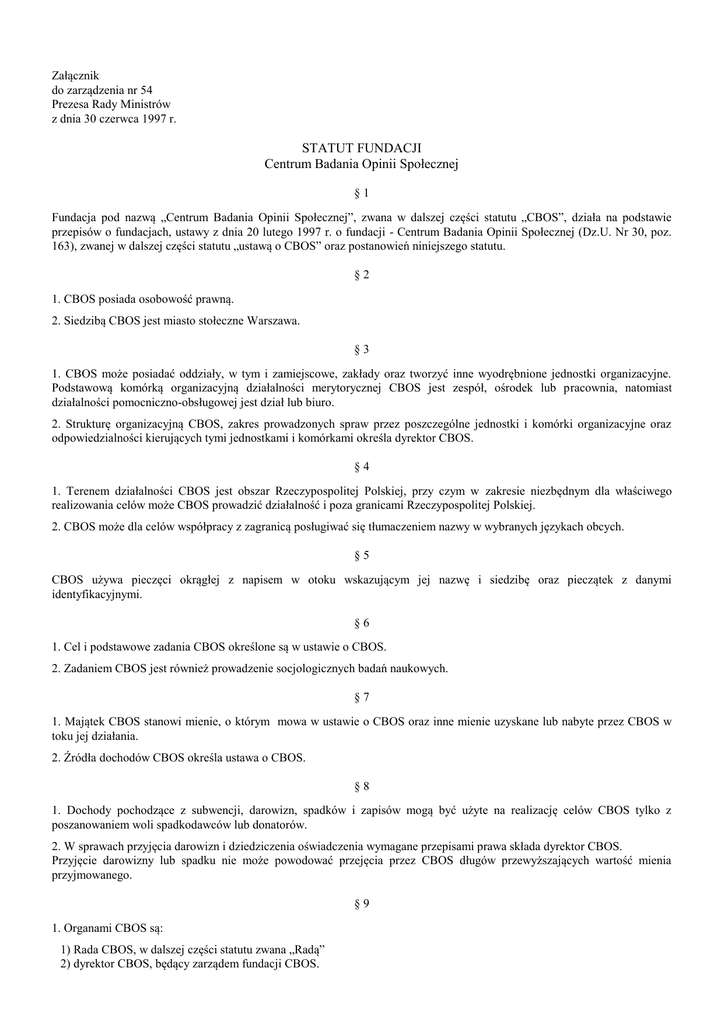 Załącznik do zarządzenia nr 54 Prezesa Rady Ministrów z dnia 30 czerwca 1997 r. STATUT FUNDACJI Centrum Badania Opinii Społecznej §1 Fundacja pod nazwą „Centrum Badania Opinii Społecznej”, zwana w dalszej części statutu „CBOS”, działa na podstawie przepisów o fundacjach, ustawy z dnia 20 lutego 1997 r. o fundacji - Centrum Badania Opinii Społecznej (Dz.U. Nr 30, poz. 163), zwanej w dalszej części statutu „ustawą o CBOS” oraz postanowień niniejszego statutu. §2 1. CBOS posiada osobowość prawną. 2. Siedzibą CBOS jest miasto stołeczne Warszawa. §3 1. CBOS może posiadać oddziały, w tym i zamiejscowe, zakłady oraz tworzyć inne wyodrębnione jednostki organizacyjne. Podstawową komórką organizacyjną działalności merytorycznej CBOS jest zespół, ośrodek lub pracownia, natomiast działalności pomocniczno-obsługowej jest dział lub biuro. 2. Strukturę organizacyjną CBOS, zakres prowadzonych spraw przez poszczególne jednostki i komórki organizacyjne oraz odpowiedzialności kierujących tymi jednostkami i komórkami określa dyrektor CBOS. §4 1. Terenem działalności CBOS jest obszar Rzeczypospolitej Polskiej, przy czym w zakresie niezbędnym dla właściwego realizowania celów może CBOS prowadzić działalność i poza granicami Rzeczypospolitej Polskiej. 2. CBOS może dla celów współpracy z zagranicą posługiwać się tłumaczeniem nazwy w wybranych językach obcych. §5 CBOS używa pieczęci okrągłej z napisem w otoku wskazującym jej nazwę i siedzibę oraz pieczątek z danymi identyfikacyjnymi. §6 1. Cel i podstawowe zadania CBOS określone są w ustawie o CBOS. 2. Zadaniem CBOS jest również prowadzenie socjologicznych badań naukowych. §7 1. Majątek CBOS stanowi mienie, o którym mowa w ustawie o CBOS oraz inne mienie uzyskane lub nabyte przez CBOS w toku jej działania. 2. Źródła dochodów CBOS określa ustawa o CBOS. §8 1. Dochody pochodzące z subwencji, darowizn, spadków i zapisów mogą być użyte na realizację celów CBOS tylko z poszanowaniem woli spadkodawców lub donatorów. 2. W sprawach przyjęcia darowizn i dziedziczenia oświadczenia wymagane przepisami prawa składa dyrektor CBOS. Przyjęcie darowizny lub spadku nie może powodować przejęcia przez CBOS długów przewyższających wartość mienia przyjmowanego. §9 1. Organami CBOS są: 1) Rada CBOS, w dalszej części statutu zwana „Radą” 2) dyrektor CBOS, będący zarządem fundacji CBOS. 2. Podstawowe zasady powoływania organów, o których mowa w ust. 1, określa ustawa o CBOS, z tym że powołanie dyrektora poprzedzone jest konkursem, którego warunki określa Rada. 3. Nie można łączyć członkostwa w Radzie z pełnieniem funkcji dyrektora CBOS. § 10 1. Rada składa się z jedenastu członków, a jej kadencja trwa 2 lata. 2. Członkowie Rady powoływani są w trybie określonym w ustawie o CBOS. 3. W posiedzeniach Rady uczestniczy dyrektor CBOS. § 11 1. Członkostwo w Radzie ustaje zawsze z upływem kadencji Rady. 2. Przed upływem kadencji Rady członkostwo w Radzie ustaje w przypadku: 1) śmierci członka Rady, 2) przyjęcia rezygnacji z członkostwa przez organ, który powołał członka. W przypadkach, o których mowa w ust. 2, organ uprawniony do powołania członka, którego członkostwo w Radzie ustało powołuje nowego członka Rady, na okres do końca kadencji Rady. § 12 1. Do obowiązków i kompetencji Rady należy: 1) sprawy określone w ustawie o CBOS, 2) sprawowanie nadzoru nad wykonaniem przez CBOS zadań określonych w § 6, 3) określenie zasad finansowania wydawnictw niekomercyjnych, 4) zatwierdzanie zasad wynagradzania pracowników CBOS, 5) ustalanie wynagrodzenia dyrektorowi CBOS, 6) opiniowanie projektu zmian statutu CBOS oraz przedkładanie Prezesowi Rady Ministrów wniosków w sprawie zmian w tym statucie, 7) opiniowanie struktury organizacyjnej CBOS i innych spraw przedstawionych przez dyrektora CBOS. 2. Każdy z członków Rady otrzymuje raz w miesiącu wyniki badań, o których mowa w § 19 ust. 2. 3. Rada może żądać od dyrektora CBOS wyjaśnień w każdej sprawie dotyczącej CBOS. § 13 1. Rada pracuje kolegialnie, może jednakże upoważnić członka do zbadania w jej imieniu określonej sprawy. 2. Pracę Rady organizuje przewodniczący Rady, wybrany przez Radę spośród jej członków. 3. Posiedzenia Rady zwołuje jej przewodniczący lub upoważniony przez niego inny członek Rady, z własnej inicjatywy, na pisemny wniosek co najmniej trzech członków Rady lub na pisemny wniosek dyrektora CBOS. 4. W przypadku złożenia wniosku, o którym mowa w ust. 3, przewodniczący zobowiązany jest zwołać posiedzenie Rady w terminie 14 dni od daty złożenia wniosku. Jeżeli w terminie tym posiedzenie Rady nie zostało zwołane - uprawnienie do zwołania przysługuje wnioskodawcy. § 14 1. Posiedzeniom Rady przewodniczy jej przewodniczący lub z jego upoważnienia jeden z jej członków. W przypadku nieobecności przewodniczącego Rady lub nieudzielenia przez niego upoważnienia do przewodniczenia posiedzeniu, przewodniczącego posiedzenia powołują obecni na posiedzeniu członkowie Rady. 2. Obsługę prac Rady zapewnia dyrektor CBOS. § 15 1. Uchwały Rady zapadają zwykłą większością głosów obecnych na posiedzeniu jej członków, przy obecności co najmniej pięciu członków Rady, przy czym wszyscy członkowie muszą być powiadomieni o posiedzeniu. 2. Głosowania są jawne, z wyjątkiem głosowań w sprawach wyborów przewodniczącego Rady, powołania dyrektora CBOS oraz przypadków, w których Rada zdecyduje, że głosowania są tajne. 3. Uchwały Rady podpisuje przewodniczący posiedzenia. § 16 Oświadczenia woli Rady, na podstawie jej uchwał, składa przewodniczący Rady lub upoważniony przez niego członek Rady, a w przypadku określonym w § 14 ust. 1, upoważnionym do złożenia oświadczenia w zakresie podjętych uchwał na posiedzeniu jest przewodniczący tego posiedzenia. § 17 Członkowi