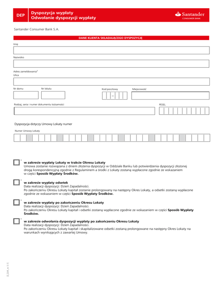 DEP Dyspozycja wypłaty Odwołanie dyspozycji wypłaty Santander Consumer Bank S.A. DANE KLIENTA SKŁADAJĄCEGO DYSPOZYCJĘ Imię Nazwisko Adres zameldowania1 Ulica Nr domu Nr lokalu Rodzaj, seria i numer dokumentu tożsamości Kod pocztowy Miejscowość PESEL Dyspozycja dotyczy Umowy Lokaty numer Numer Umowy Lokaty * * * [Z_ZL/K_w. 5.1] * w zakresie wypłaty Lokaty w trakcie Okresu Lokaty Umowa zostanie rozwiązana z dniem złożenia dyspozycji w Oddziale Banku lub potwierdzenia dyspozycji złożonej drogą korespondencyjną zgodnie z Regulaminem a środki z Lokaty zostaną wypłacone zgodnie ze wskazaniem w części Sposób Wypłaty Środków. w zakresie wypłaty odsetek Data realizacji dyspozycji: Dzień Zapadalności. Po zakończeniu Okresu Lokaty kapitał zostanie prolongowany na następny Okres Lokaty, a odsetki zostaną wypłacone zgodnie ze wskazaniem w części Sposób Wypłaty Środków. w zakresie wypłaty po zakończeniu Okresu Lokaty Data realizacji dyspozycji: Dzień Zapadalności. Po zakończeniu Okresu Lokaty kapitał i odsetki zostaną wypłacone zgodnie ze wskazaniem w części Sposób Wypłaty Środków. w zakresie odwołania dyspozycji wypłaty po zakończeniu Okresu Lokaty Data realizacji dyspozycji: Dzień Zapadalności. Po zakończeniu Okresu Lokaty kapitał i skapitalizowane odsetki zostaną prolongowane na następny Okres Lokaty na warunkach wynikających z zawartej Umowy. SPOSÓB WYPŁATY ŚRODKÓW * PLN, kwota** zgodnie z odpowiednimi postanowieniami Umowy zostanie wypłacona w kasie Oddziału2 Nazwa Oddziału * PLN, kwota** zgodnie z odpowiednimi postanowieniami Umowy zostanie przekazana na rachunek numer Numer Rachunku Nazwa Banku prowadzony w Imię Nazwisko którego posiadaczem jest * PLN, kwota** zgodnie z odpowiednimi postanowieniami Umowy zostanie przekazana na rachunek numer Numer Rachunku Nazwa Banku prowadzony w Imię Nazwisko którego posiadaczem jest Złożona dyspozycja jest wiążąca dla Banku pod warunkiem jej potwierdzenia przez Bank zgodnie z postanowieniami obowiązującego Regulaminu dotyczącymi formy i składania dyspozycji do rachunku lokaty obowiązującego do lokaty, do której składana jest dyspozycja. 1 Ulica numer domu, numer lokalu, kod pocztowy, miasto 2 Nazwa oddziału, miasto. Opcja nie dotyczy lokat z grupy Online. * Wstawić X przy wybranej opcji ** Kwota odsetek została naliczona według stanu prawnego obowiązującego w dniu składania dyspozycji i może ulec zmianie w przypadku zmiany przepisów prawa obowiązujących w dniu poboru podatku. ADNOTACJE BANKU [Z_ZL/K_w. 5.1] Wypełnia Bank Adnotacje Banku Pieczęć i podpis pracownika Banku Podpis Klienta składającego dyspozycję