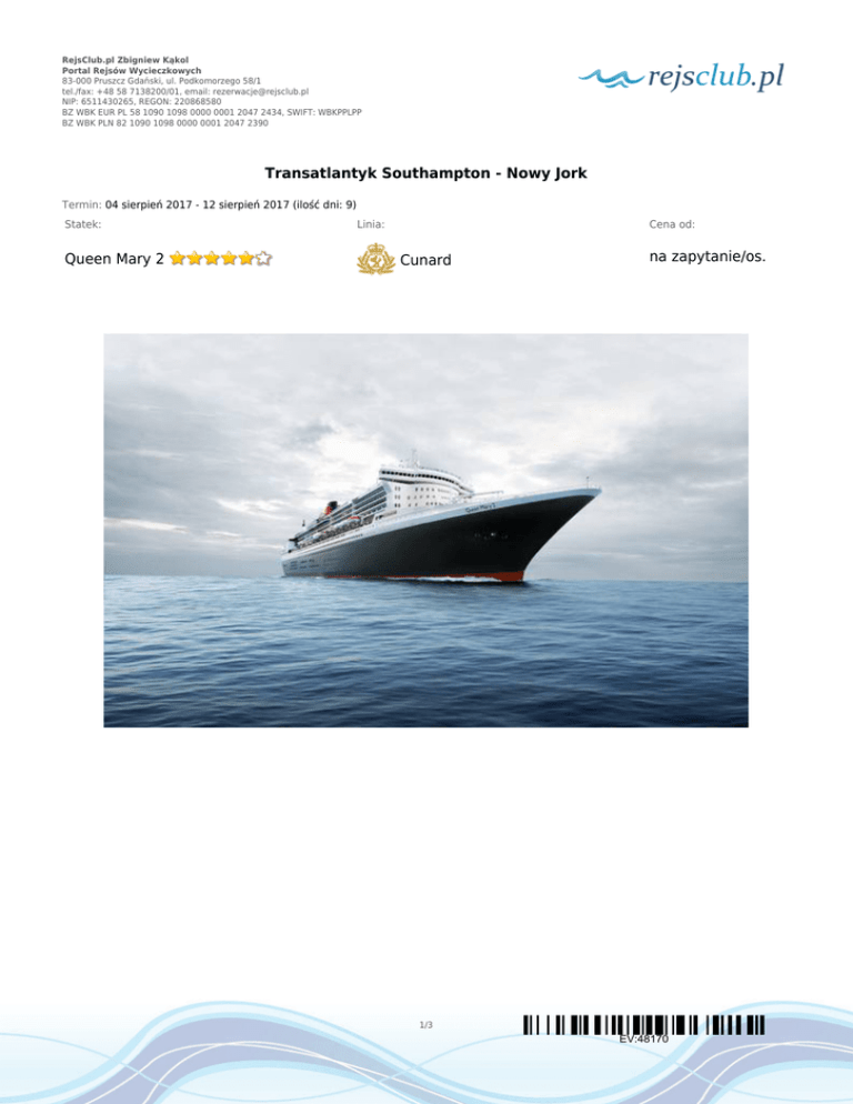RejsClub.pl Zbigniew Kąkol Portal Rejsów Wycieczkowych 83-000 Pruszcz Gdański, ul. Podkomorzego 58/1 tel./fax: +48 58 7138200/01, email: [email protected] NIP: 6511430265, REGON: 220868580 BZ WBK EUR PL 58 1090 1098 0000 0001 2047 2434, SWIFT: WBKPPLPP BZ WBK PLN 82 1090 1098 0000 0001 2047 2390 Transatlantyk Southampton - Nowy Jork Termin: 04 sierpień 2017 - 12 sierpień 2017 (ilość dni: 9) Statek: Queen Mary 2 Linia: Cena od: Cunard na zapytanie/os. 1/3 EV:48170 RejsClub.pl Zbigniew Kąkol Portal Rejsów Wycieczkowych 83-000 Pruszcz Gdański, ul. Podkomorzego 58/1 tel./fax: +48 58 7138200/01, email: [email protected] NIP: 6511430265, REGON: 220868580 BZ WBK EUR PL 58 1090 1098 0000 0001 2047 2434, SWIFT: WBKPPLPP BZ WBK PLN 82 1090 1098 0000 0001 2047 2390 TRASA REJSU dzień 1 Data Port Wpłynięcie Wypłynięcie piątek 04.08.2017 Southampton --:-- --:-- Legenda Wielka Brytania dzień 2 sobota 05.08.2017 Dzień na morzu --:-- --:-- dzień 3 niedziela 06.08.2017 Dzień na morzu --:-- --:-- dzień 4 poniedziałek 07.08.2017 Dzień na morzu --:-- --:-- dzień 5 wtorek 08.08.2017 Dzień na morzu --:-- --:-- dzień 6 środa 09.08.2017 Dzień na morzu --:-- --:-- dzień 7 czwartek 10.08.2017 Halifax, Nowa Szkocja --:-- --:-- dzień 8 piątek 11.08.2017 Dzień na morzu --:-- --:-- dzień 9 sobota 12.08.2017 Nowy Jork --:-- --:-- Kanada Stany Zjednoczone CENNIK Cena katalogowa Kabina wewnętrzna na zapytanie Kabina zewnętrzna z oknem na zapytanie Kabina zewnętrzna z balkonem na zapytanie Suite (apartament) na zapytanie Kabina jednoosobowa na zapytanie 3 i 4 osoba dorosła w kabinie na zapytanie dziecko do 12 lat jako 3 osoba w kabinie na zapytanie Opłaty portowe Cena promocyjna w cenie 2/3 EV:48170 RejsClub.pl Zbigniew Kąkol Portal Rejsów Wycieczkowych 83-000 Pruszcz Gdański, ul. Podkomorzego 58/1 tel./fax: +48 58 7138200/01, email: [email protected] NIP: 6511430265, REGON: 220868580 BZ WBK EUR PL 58 1090 1098 0000 0001 2047 2434, SWIFT: WBKPPLPP BZ WBK PLN 82 1090 1098 0000 0001 2047 2390 Uwaga! Ceny za osobę w kabinie dwuosobowej. Cena zawiera: zakwaterowanie w kabinie wybranej kategorii; wyżywienie - 3 główne posiłki, przekąski między posiłkami, bufet lub przekąski o północy; napoje serwowane do śniadania i w bufetach samoobsługowych; serwis bagażowy podczas wejścia i zejścia ze statku; serwis kabinowy; korzystanie ze wszystkich urządzeń sportowo - rekreacyjnych znajdujących się na pokładzie statku (basen, jacuzzi, sala fitness, itp.); udział we wszystkich imprezach organizowanych na statku (przedstawienia w teatrze, koncerty, programy animacyjne itp.). Cena nie zawiera: kosztów dojazdu do portu; ewentualnych noclegów w hotelu przed/po rejsie i transferów; wycieczek fakultatywnych w trakcie rejsu; korzystania z barów, mini baru w kabinie oraz napojów zamawianych w restauracji; korzystania z punktów usługowych (fryzjer, pralnia, fotograf, salon piękności i odnowy biologicznej, internet) i wydatków osobistych; napiwków dla obsługi na statku (kwota uzależniona od długości rejsu); ubezpieczenia KL, NNW i bagaż, kosztów wiz (tam gdzie wymagane). 3/3 EV:48170
