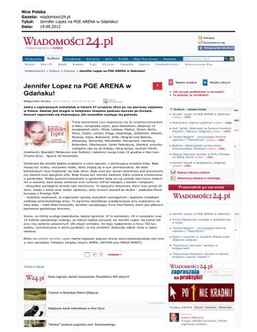 Nice Polska Gazeta: wiadomosci24.pl Tytu³: Jennifer Lopez na PGE ARENA w Gdañsku! Data: 19.09.2012 Zaloguj Zarejestruj się Zaloguj przez Facebook Wydarzenia Muzyka Kultura Kino i TV Cywilizacja Książki Styl życia Sport Teatr Wystawy Komiksy Portfel Fotografia Moje Trzy Grosze Imprezy Rankingi Wpisz szukany tekst Przestrzeń k u l t u r y Muzyczna scena W24 Wiadomości24 > Kultura > Imprezy > Jennifer Lopez na PGE ARENA w Gdańsku! Jennifer Lopez na PGE ARENA w Gdańsku! Napisz artykuł miejsce Odsłon: 1217 Komentarzy: Jedna z największych wokalistek w historii 27 września 2012 po raz pierwszy zaśpiewa 0 w Polsce. Gdańsk jest drugim w kolejności miastem podczas tournée po Europie. Ocena: Koncert zapowiada się imponująco, jak wszystkie występy tej gwiazdy. 0 pkt Małgorzata Soroka Data dodania: 2012-09-19 05:04 Wyślij zdjęcie 1 Jak zacząć publikować w serwisie? Ty piszesz, ty zarabiasz! i Trasa koncertowa J.Lo rozpoczyna się 22 września koncertem w Baku, europejska część, poza Gdańskiem, obejmuje 15 europejskich stolic: Mińsk, Lizbonę, Madryt, Zürich, Berlin, Paryż, Dublin, Londyn, Pragę, Kopenhagę, Sztokholm, Helsinki, Moskwę, Kijów, Bukareszt, Sofię i Belgrad oraz Bolonię, Antwerpię, Amnéville, Manchester, Monachium, Hamburg, Rotterdam, Oberhausen, Sankt Petersburg, Istanbuł, artystka następnie uda się do Dubaju, Hong Kongu, Australii (Perth, Hindmarsh, Boondall, Melbourne oraz Sydney) i zakończy swoją trasę 22 grudnia w San Juan (Puerto Rico) - łącznie 40 koncertów. Garderoba dla artystki będzie urządzona w stylu spa/zen, z dominującą wszędzie bielą. Białe muszą być ściany i wszystkie meble, które znajdą się w tym pomieszczeniu. Na stole bankietowym musi znajdować się biały obrus. Biały musi być dywan łazienkowy pod prysznicem, czy zlewem oraz specjalna sofa. Białe muszą być również świeczki, które zostaną umieszczone w garderobie. Wedle życzenia piosenkarki w garderobie będą na nią czekały dwa tuziny białych róż w wazonie, dwie lampy weneckie oraz ruchomy stół do makijażu z lustrem i lampkami. - Wszystkie wymagania określa rider techniczny. To specjalny dokument, który liczy ponad 20 stron. Każdy z detali musi zostać spełniony, żeby koncert doszedł do skutku - podkreśla Marek Kurzawa z Prestige MJM. - Jesteśmy przekonani, że organizator sprosta wszystkim wymaganiom i będziemy świadkami wielkiego amerykańskiego show. To ogromna satysfakcja współpracować przy wydarzeniu na taką skalę - mówi Adam Krużyński, dyrektor zarządzający firmy Nice Polska, która jest głównym partnerem gdańskiego koncertu. Scena, na której wystąpi piosenkarka, będzie ogromna: 57 m szerokości, 19 m wysokości oraz 15 metrów specjalnego wybiegu, po którym będzie poruszać się Jennifer Lopez. Na scenie lub przy niej zostanie ustawionych 100 stopni schodów. Do tego nagłośnienie o mocy 750 tys. watów, rozmieszczone w ośmiu punktach, co ma umożliwić doskonały odbiór show w całym obiekcie. Bilety na koncert Jennifer Lopez można kupować poprzez stronę www.imprezyprestige.com oraz w sieci sprzedaży Ticketpro (między innymi: EMPIK, SATURN oraz MEDIA MARKT). Najpopularniejsze Kultura - ostatni dzień 24h Jennifer Lopez na PGE ARENA w Gdańsku! (odsłon: +918) 7 dni Wybieramy zdjęcie tygodnia! (odsłon: +828) Kult, Jamal i Bednarek na Święcie Kwiatów, cały serwis Owoców i Warzyw [Zdjęcia] (odsłon: +576) "Jesteś Bogiem" - poruszająca historia raperów z "Paktofoniki" (odsłon: +385) Rędziny. Ogólnopolski turniej tańca kultura towarzyskiego [Zdjęcia] (odsłon: +383) Zdjęcia Damiana Leciaka w Parku Miniatur na Złotej Górze (odsłon: +263) Koncert Kayah w Bydgoszczy [Zdjęcia] (odsłon: +250) Napisz własny artykuł Obserwuj artykuł w rankingu Najnowsze kultura Jennifer Lopez na PGE ARENA w Gdańsku! cały serwis Tercet Egzotyczny wystąpi w październiku w Łodzi "Jesteś Bogiem" - poruszająca historia kultura raperów z "Paktofoniki" Dzień z rowerem w Urzędzie Miasta Łodzi [Zdjęcia] (zdjęcia) "Tajemnica internetu" wkrótce w księgarniach 1 2 3 "Deszczowa Piosenka" wkrótce w Romie. Powtórzy sukces "Kotów"? następna > Zobacz także: Dwie nagrody, dwóch zwycięzców. Rozdaliśmy 400 złotych! Tydzień w Beskidzie Niskim [Zdjęcia] SPONSOROWANE Najlepsze konto internetowe w Alior Sync Trujący alkohol Akcje Pudzian Wywiady Zdrowie Łukasz Gałkowski "Hańba!" podczas pogrzebu prof. Szaniawskiego Trujący alkohol metylowy. Polska zaprzecza czeskim... Nice Polska Gazeta: wiadomosci24.pl Tytu³: Jennifer Lopez na PGE ARENA w Gdañsku! Data: 19.09.2012 Wydarzenia Tomasz Kowalski Alkohol metylowy zabija w Polsce. Są ofiary, trwa alarm w... koncert Gdańsk wrzesień PGE Arena Jennifer Lopez skomentuj J. Lo 0 Zdrowie Tomasz Kowalski Tagi: Autor: Artykuły OFFline profil autora Małgorzata Soroka (24) Galerie (0) Zakaz sprzedaży alkoholu z Czech. Pierwsze ofiary w Kielcach 1 Średnia ocen Świat miejsce (4.68) Michał Wrótniak Trujący alkohol w Polsce? Zobacz, jak go rozpoznać. A w... Miejscowość: Gdynia | Kraj: Polska Ostatnie artykuły autora: REKLAMA • Piosenka bałkańska w Centrum Kultury w Gdyni • Rycerka-bohaterka na Scenie SAM • XV Międzynarodowy Festiwal Muzyki Sakralnej w Gdyni Komentarze: 0 Twoje imię i nazwisko Wpisz kod z obrazka odśwież Twój komentarz 5 6 Maksymalnie 4000 znaków. (możesz jeszcze wpisać: 4000) Wyślij REKLAMA Serwisy branżowe Serwisy partnerskie Dzienniki regionalne Serwisy sportowe Serwisy tematyczne Ogłoszenia Nasze Miasto Wiadomości Trójmiasto Ekstraklasa Edukacja Motoryzacja Najnowsze Informacje Wiadomości Śląsk Sandecja Koncerty Nieruchomości Program TV Wiadomości Łódź Sport na luzie Recenzje gier Praca Samochody Wiadomości Lublin Ogłoszenia drobne Puls Polski TV Wiadomości Wrocław Turystyka Wiadomości Poznań Wiadomości Kraków Express Ilustrowany Fakty Copyright 2012 Wiadomosci24.pl Mapa serwisu O redak