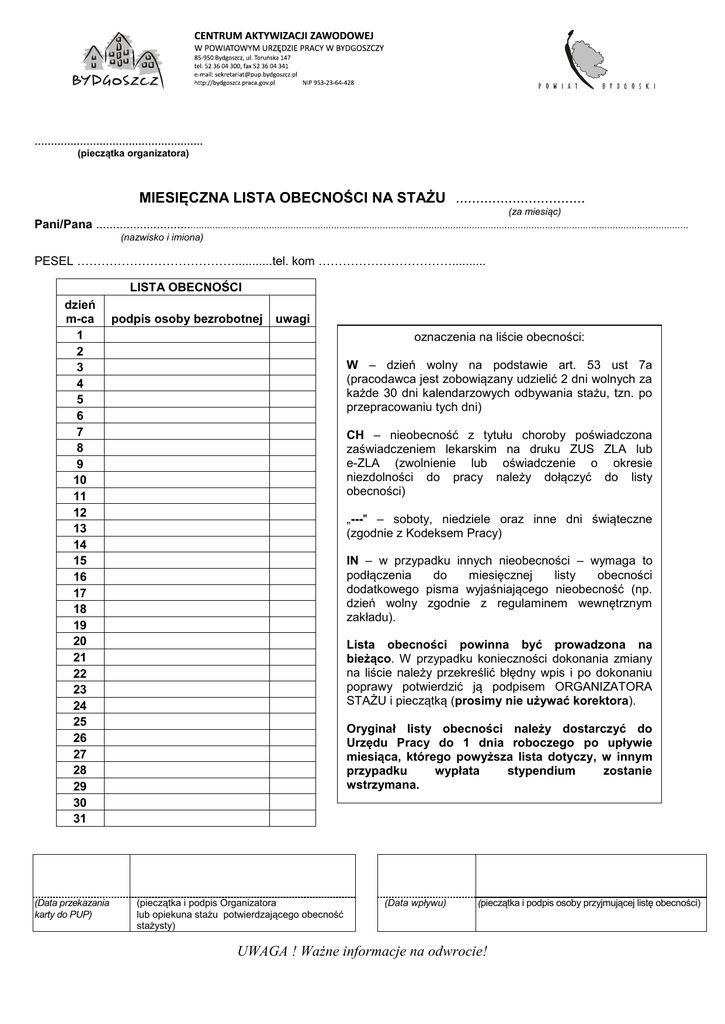 ……………………………………………. (pieczątka organizatora) MIESIĘCZNA LISTA OBECNOŚCI NA STAŻU ................................ (za miesiąc) Pani/Pana .................................................................................................................................................................................................................... (nazwisko i imiona) PESEL …………………………………...........tel. kom …………………………….......... LISTA OBECNOŚCI dzień m-ca 1 2 3 4 5 6 7 8 9 10 11 12 13 14 15 16 17 18 19 20 21 22 23 24 25 26 27 28 29 30 31 (Data przekazania karty do PUP) podpis osoby bezrobotnej uwagi oznaczenia na liście obecności: W – dzień wolny na podstawie art. 53 ust 7a (pracodawca jest zobowiązany udzielić 2 dni wolnych za każde 30 dni kalendarzowych odbywania stażu, tzn. po przepracowaniu tych dni) CH – nieobecność z tytułu choroby poświadczona zaświadczeniem lekarskim na druku ZUS ZLA lub e-ZLA (zwolnienie lub oświadczenie o okresie niezdolności do pracy należy dołączyć do listy obecności) „---" – soboty, niedziele oraz inne dni świąteczne (zgodnie z Kodeksem Pracy) IN – w przypadku innych nieobecności – wymaga to podłączenia do miesięcznej listy obecności dodatkowego pisma wyjaśniającego nieobecność (np. dzień wolny zgodnie z regulaminem wewnętrznym zakładu). Lista obecności powinna być prowadzona na bieżąco. W przypadku konieczności dokonania zmiany na liście należy przekreślić błędny wpis i po dokonaniu poprawy potwierdzić ją podpisem ORGANIZATORA STAŻU i pieczątką (prosimy nie używać korektora). Oryginał listy obecności należy dostarczyć do Urzędu Pracy do 1 dnia roboczego po upływie miesiąca, którego powyższa lista dotyczy, w innym przypadku wypłata stypendium zostanie wstrzymana. (pieczątka i podpis Organizatora lub opiekuna stażu potwierdzającego obecność stażysty) (Data wpływu) (pieczątka i podpis osoby przyjmującej listę obecności) UWAGA ! Ważne informacje na odwrocie! Uwagi i informacje dodatkowe: Celem terminowej wypłaty stypendium osobie odbywającej staż wymienionej na liście obecności, prosimy o stosowanie niżej wymienionych zasad: 1. Organizator: zobowiązuje się dostarczyć listę obecności wraz ze zwolnieniami lekarskimi na druku ZUS ZLA (w przypadku zwolnienia lekarskiego e-ZLA – oświadczenie o okresie niezdolności do pracy) oraz wnioskami o udzielenie dni wolnych, wszystkich osób odbywających w jego firmie staż do Powiatowego Urzędu Pracy, do 1 dnia roboczego po upływie miesiąca, za który przysługuje stypendium. Niezachowanie terminu oznaczać będzie wstrzymanie wypłaty stypendium, dla osoby odbywającej staż. Ww. dokumenty w pierwszym dniu miesiąca, należy składać w pokoju 306, III piętro, tel. (52) 3604361; w przypadku wystąpienia nieobecności innej niż dni wolne, czasowa niezdolność do pracy lub usprawiedliwiona nieobecność spowodowana obowiązkiem stawiennictwa przed sądem lub organem administracji publicznej, organizator zobowiązuje się dołączyć do miesięcznej listy obecności dodatkowe pismo wyjaśniające nieobecność. 2. Osoba bezrobotna odbywająca staż zobowiązuje się: zawiadomić organizatora i Powiatowy Urząd Pracy o niezdolności do pracy w terminie 2 dni od dnia wystawienia zaświadczenia lekarskiego oraz: ∙ w przypadku uzyskania zaświadczenia lekarskiego na druku ZUS ZLA w formie papierowej zaświadczenie lekarskie dostarczyć organizatorowi, który wraz z listą obecności przekaże je do Powiatowego Urzędu Pracy w Bydgoszczy; ∙ w przypadku uzyskania elektronicznego zwolnienia lekarskiego e-ZLA osoba bezrobotna zobowiązuje się do złożenia oświadczenia o okresie niezdolności do pracy. Oświadczenie należy dostarczyć organizatorowi, który wraz z listą obecności przekaże je do Powiatowego Urzędu Pracy w Bydgoszczy; dostarczyć do Powiatowego Urzędu Pracy ankietę monitorującą, celem prawidłowego sprawowania przez Urząd nadzoru nad odbywanym stażem. Ankieta jest przeznaczona wyłącznie do użytku służbowego; złożyć lub przesłać do Powiatowego Urzędu Pracy pisemne oświadczenie o przychodach uzyskanych z innego tytułu niż zatrudnienie, inna praca zarobkowa, działalność gospodarcza, zasiłek lub inne świadczenie wypłacane z Funduszu Pracy, podlegających opodatkowaniu na podstawie przepisów o podatku dochodowym od osób fizycznych, pod rygorem odpowiedzialności karnej. Stosowne oświadczenie winno być złożone lub przesłane w terminie 7 dni od dnia uzyskania przychodów. POWIATOWY URZĄD PRACY PROSI O WSPÓŁPRACĘ I STOSOWANIE POWYŻSZYCH STANDARDÓW.