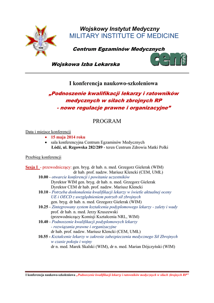 Wojskowy Instytut Medyczny MILITARY INSTITUTE OF MEDICINE Centrum Egzaminów Medycznych Wojskowa Izba Lekarska I konferencja naukowo-szkoleniowa „Podnoszenie kwalifikacji lekarzy i ratowników medycznych w siłach zbrojnych RP - nowe regulacje prawne i organizacyjne” PROGRAM Data i miejsce konferencji 15 maja 2014 roku sala konferencyjna Centrum Egzaminów Medycznych Łódź, ul. Rzgowska 282/289 - teren Centrum Zdrowia Matki Polki Przebieg konferencji Sesja I - przewodniczący: gen. bryg. dr hab. n. med. Grzegorz Gielerak (WIM) dr hab. prof. nadzw. Mariusz Klencki (CEM, UMŁ) 10.00 - otwarcie konferencji i powitanie uczestników Dyrektor WIM gen. bryg. dr hab. n. med. Grzegorz Gielerak Dyrektor CEM dr hab. prof. nadzw. Mariusz Klencki 10.10 - Potrzeba doskonalenia kwalifikacji lekarzy w świetle aktualnej oceny UE i OECD z uwzględnieniem potrzeb sił zbrojnych gen. bryg. dr hab. n. med. Grzegorz Gielerak (WIM) 10.25 - Zintegrowany system kształcenia podyplomowego lekarzy - zalety i wady prof. dr hab. n. med. Jerzy Kruszewski (przewodniczący Komisji Kształcenia NRL, WIM) 10.40 - Podnoszenie kwalifikacji podyplomowych lekarzy - rozwiązania prawne i organizacyjne dr hab. prof. nadzw. Mariusz Klencki (CEM, UMŁ) 10.55 - Kształcenie lekarzy w zakresie zabezpieczenia medycznego Sił Zbrojnych w czasie pokoju i wojny dr n. med. Marek Skalski (WIM), dr n. med. Marian Dójczyński (WIM) I konferencja naukowo-szkoleniowa „Podnoszenie kwalifikacji lekarzy i ratowników medycznych w siłach zbrojnych RP” 11.10 - Rola Wojskowej Izby Lekarskiej w przygotowaniu koncepcji podnoszenia kwalifikacji lekarzy pełniących służbę wojskową dr n. med. Jan Sapieżko (prezes WIL) 11.25 - dyskusja „okrągłego stołu” nad wygłoszonymi referatami moderator: płk dr hab. n. med. Andrzej Chciałowski (WIM) 11.45 - przerwa na kawę Sesja II - przewodniczący: dr n. med. Jan Sapieżko (WIL) dr hab. n. praw. Rafał Kubiak (CEM, UŁ) 12.15 - Działalność organizacyjna i nowe rozwiązania prawne na rzecz doskonalenia zawodowego żołnierzy zawodowych korpusu medycznego płk mgr Jarosław Trochimuk (IWSZ) 12.30 - Pomiar efektywności kształcenia lekarzy pełniących służbę wojskową na podstawie wyników LEP/LEK dr n. wojsk. Józef Bukowski (WIM), płk dr hab. n. med. Andrzej Chciałowski (WIM) 12.45 - Wojskowy Szpital Kliniczny w systemie podnoszenia kwalifikacji lekarzy sił zbrojnych na przykładzie WSK w Lublinie płk dr n. med. Zbigniew Kędzierski (konsultant w zakresie zdrowia publicz.) 13.00 - Aktualne problemy kształcenia ratowników medycznych - obiektywizacja kontroli umiejętności zawodowych dr hab. n. praw. Rafał Kubiak (CEM, UŁ) E. Kramek (dyrektor Departamentu Nauki i Szkolnictwa Wyższego MZ) 13.15 - Nowa koncepcja CKP WIM - budowanie umiejętności ratowników medycznych płk dr n. med. Stefan Antosiewicz 13.30 - Specyfika i rola Wojskowego Instytutu Medycyny Lotniczej w procesie kształcenia lekarzy Sił Powietrznych płk dr n. hum. Olaf Truszczyński 13.45 - dyskusja ekspertów nad wygłoszonymi referatami - Przygotowanie lekarzy do realizacji zadań wojskowej służby zdrowia w toku doskonalenia zawodowego moderatorzy: płk dr hab. n. med. Andrzej Chciałowski (WIM) dr n. wojsk. Józef Bukowski (WIM) uczestnicy: gen. bryg. dr hab. n. med. Grzegorz Gielerak (dyrektor WIM) Barbara Bańczak-Mysiak (dyrektor Departamentu Spraw Obronnych MZ) dr n. med. Arkadiusz Kosowski (dyrektor Departamentu NFZ) dr hab. prof. nadzw. Mariusz Klencki (dyrektor CEM, UMŁ) prof. dr hab. n. med. Jerzy Kruszewski (NRL, WIM) płk lek. Dariusz Chłopek (Dowództwo Generalne Rodzajów Sił Zbrojnych) płk dr n. med. Stefan Antosiewicz (WIM) dr n. med. Jan Sapieżko (prezes WIL) dr n. med. Marek Skalski (WIM) 14.45 - zakończenie - podsumowanie obrad 15.00 - obiad I konferencja naukowo-szkoleniowa „Podnoszenie kwalifikacji lekarzy i ratowników medycznych w siłach zbrojnych RP”