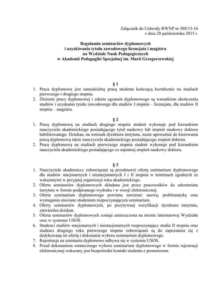 Załącznik do Uchwały RWNP nr 588/15-16 z dnia 28 października 2015 r. Regulamin seminariów dyplomowych i uzyskiwania tytułu zawodowego licencjata i magistra na Wydziale Nauk Pedagogicznych w Akademii Pedagogiki Specjalnej im. Marii Grzegorzewskiej §1 1. Praca dyplomowa jest samodzielną pracą studenta kończącą kształcenie na studiach pierwszego i drugiego stopnia. 2. Złożenie pracy dyplomowej i zdanie egzamin dyplomowego są warunkiem ukończenia studiów i uzyskania tytułu zawodowego dla studiów I stopnia – licencjata, dla studiów II stopnia – magistra. §2 1. Pracę dyplomową na studiach drugiego stopnia student wykonuje pod kierunkiem nauczyciela akademickiego posiadającego tytuł naukowy lub stopień naukowy doktora habilitowanego. Dziekan, na wniosek dyrektora instytutu, może upoważnić do kierowania pracą dyplomową także nauczyciela akademickiego posiadającego stopień doktora. 2. Pracę dyplomową na studiach pierwszego stopnia student wykonuje pod kierunkiem nauczyciela akademickiego posiadającego co najmniej stopień naukowy doktora. 1. 2. 3. 4. 5. 6. 7. 8. §3 Nauczyciele akademiccy zobowiązani są przedstawić ofertę seminarium dyplomowego dla studiów stacjonarnych i niestacjonarnych I i II stopnia w terminach zgodnych ze wskazanymi w przyjętej organizacji roku akademickiego. Oferta seminariów dyplomowych składana jest przez pracowników do sekretariatu instytutu w formie podpisanego wydruku i w wersji elektronicznej. Oferta seminarium dyplomowego powinna zawierać: nazwę, problematykę oraz wymagania stawiane studentom rozpoczynającym seminarium. Oferty seminariów dyplomowych, po pozytywnej weryfikacji dyrektora instytutu, zatwierdza dziekan. Oferta seminariów dyplomowych zostaje umieszczona na stronie internetowej Wydziału oraz w systemie USOS. Studenci studiów stacjonarnych i niestacjonarnych rozpoczynający studia II stopnia oraz studenci drugiego roku pierwszego stopnia zobowiązani są do zapoznania się z dedykowaną im ofertą i dokonania wyboru seminarium dyplomowego. Rejestracja na seminaria dyplomowe odbywa się w systemie USOS. Przed dokonaniem ostatecznego wyboru seminarium dyplomowego w formie rejestracji elektronicznej wskazany jest bezpośredni kontakt studenta z promotorem. §4 1. Seminaria dyplomowe umieszczane są w planie studiów na dany rok akademicki przez Biuro ds. Organizacji i Planowania Kształcenia. 2. W trakcie seminarium dyplomowego studenci w sposób szczególny potwierdzają swą zdolność stosowania wiedzy, umiejętności zdobytych w trakcie studiów oraz wykazują osiągnięte kompetencje personalne i społeczne, stąd seminarium powinno być traktowane jako forma weryfikacji zakładanych kierunkowych efektów kształcenia. 3. Efekty przewidziane do weryfikacji w trakcie seminarium i przygotowywania pracy dyplomowej na pierwszym i drugim stopniu dla kierunków powinny być przez prowadzących uwzględnione w sylabusach seminarium 4. Zakładane efekty realizowane są z wykorzystaniem treści oraz metod autorsko wybranych przez promotora. §5 1. Listy grup seminaryjnych zatwierdza dziekan. 2. Seminaria dyplomowe prowadzone są w grupach liczących od 12 do 20 osób. W przypadku mniejszych liczebności o powołaniu grupy seminaryjnej decyduje dziekan. 3. W przypadku, gdy zarejestrowana liczba dyplomantów nie pozwala na utworzenie grupy, a promotor wyraża wolę indywidualnego prowadzenia dyplomanta, dopuszcza się za zgodą Dziekana możliwość organizowania indywidualnych konsultacji seminaryjnych. 4. Godziny indywidualnych konsultacji są rozliczane po zdaniu przez studenta egzaminu dyplomowego. 5. Przekroczenie zakładanej liczebności grupy seminaryjnej może mieć miejsce w szczególnych przypadkach i wymaga zgody dziekana oraz wyrażenia woli promotora przyjęcia dyplomantów ponad ustalony limit. 6. Promotor prowadzi, dla danego roku studiów, po jednym seminarium dyplomowym na studiach stacjonarnych lub niestacjonarnych. 7. W wyjątkowych przypadkach, na wniosek studenta i za zgodą promotorów, dziekan może udzielić zgody na przeniesienie studenta do innej grupy seminaryjnej. 8. Jeżeli zaistniały przyczyny leżące po stronie kierującego pracą dyplomową, które mogłyby wpłynąć na opóźnienie jej złożenia, dziekan, na wniosek studenta, wyznacza nauczyciela akademickiego, który przejmie zadanie kierowania tą pracą. Zmiana kierującego pracą dyplomową w okresie ostatnich sześciu miesięcy przed terminem ukończenia studiów może stanowić podstawę do przedłużenia terminu jej złożenia na zasadach określonych w § 9 ust. 6. 9. Warunkiem zaliczenia seminarium dyplomowego na ostatnim roku studiów jest złożenie pracy dyplomowej. §6 1. Promotorzy zobowiązani są do przedłożenia wykazu seminarzystów kończących w danym roku akademickim seminarium dyplomowe wraz z tematami ich prac celem ich zatwierdzenia do sekretariatów swoich instytutów, najpóźniej do końca marca. 2. Procedurę zatwierdzania tematów prac określa dyrektor instytutu. 3. Zatwierdzone listy tematów prac dyplomowych, podpisane przez dyrektora instytutu przekazywane są do kierownika dziekanatu wydziału najpóźniej do końca kwietnia. 1. 2. 3. 4. 5. §7 Praca dyplomowa musi prezentować poziom merytoryczny wskazujący na wiedzę, umiejętności i kompetencje społeczne dyplomanta na danym kierunku studiów, adekwatne do zdobywanego tytułu zawodowego. Praca magisterska powinna wykazać umiejętności studenta w formułowaniu problemu badawczego i rozwiązania go metodami naukowymi. W pracy magisterskiej musi się znaleźć znaczący wkład własny studenta, obejmujący przeprowadzenie badań. Tematyka pracy dyplomowej magisterskiej powinna być związana z kierunkiem studiów. Praca magisterska nie może być prostą kontynuacją i powtórzeniem treści pracy licencjackiej. Praca licencjacka może mieć charakter analityczny lub projektowy. W pracy licencjackiej piszący powinien umiejętnie pow