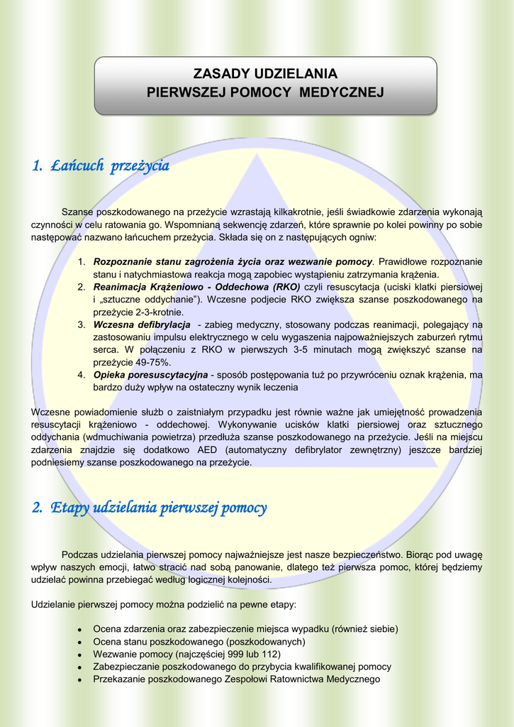 ZASADY UDZIELANIA PIERWSZEJ POMOCY MEDYCZNEJ 1. Łańcuch przeżycia Szanse poszkodowanego na przeżycie wzrastają kilkakrotnie, jeśli świadkowie zdarzenia wykonają czynności w celu ratowania go. Wspomnianą sekwencję zdarzeń, które sprawnie po kolei powinny po sobie następować nazwano łańcuchem przeżycia. Składa się on z następujących ogniw: 1. Rozpoznanie stanu zagrożenia życia oraz wezwanie pomocy. Prawidłowe rozpoznanie stanu i natychmiastowa reakcja mogą zapobiec wystąpieniu zatrzymania krążenia. 2. Reanimacja Krążeniowo - Oddechowa (RKO) czyli resuscytacja (uciski klatki piersiowej i „sztuczne oddychanie”). Wczesne podjecie RKO zwiększa szanse poszkodowanego na przeżycie 2-3-krotnie. 3. Wczesna defibrylacja - zabieg medyczny, stosowany podczas reanimacji, polegający na zastosowaniu impulsu elektrycznego w celu wygaszenia najpoważniejszych zaburzeń rytmu serca. W połączeniu z RKO w pierwszych 3-5 minutach mogą zwiększyć szanse na przeżycie 49-75%. 4. Opieka poresuscytacyjna - sposób postępowania tuż po przywróceniu oznak krążenia, ma bardzo duży wpływ na ostateczny wynik leczenia Wczesne powiadomienie służb o zaistniałym przypadku jest równie ważne jak umiejętność prowadzenia resuscytacji krążeniowo - oddechowej. Wykonywanie ucisków klatki piersiowej oraz sztucznego oddychania (wdmuchiwania powietrza) przedłuża szanse poszkodowanego na przeżycie. Jeśli na miejscu zdarzenia znajdzie się dodatkowo AED (automatyczny defibrylator zewnętrzny) jeszcze bardziej podniesiemy szanse poszkodowanego na przeżycie. 2. Etapy udzielania pierwszej pomocy Podczas udzielania pierwszej pomocy najważniejsze jest nasze bezpieczeństwo. Biorąc pod uwagę wpływ naszych emocji, łatwo stracić nad sobą panowanie, dlatego też pierwsza pomoc, której będziemy udzielać powinna przebiegać według logicznej kolejności. Udzielanie pierwszej pomocy można podzielić na pewne etapy: Ocena zdarzenia oraz zabezpieczenie miejsca wypadku (również siebie) Ocena stanu poszkodowanego (poszkodowanych) Wezwanie pomocy (najczęściej 999 lub 112) Zabezpieczanie poszkodowanego do przybycia kwalifikowanej pomocy Przekazanie poszkodowanego Zespołowi Ratownictwa Medycznego Poradnik udzielania pierwszej pomocy: LINKI: http://www.ratownicy.szczecin.pl http://www.pierwszapomoc.net.pl http://www.wrotamalopolski.pl http://www.ratownictwo.win.pl http://www.izik.nd.e-wro.pl http://ratownik-med.pl http://www.hartmann.pl