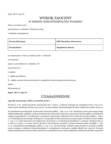 Sygn. akt I C 331/16 WYROK ZAOCZNY W IMIENIU RZECZYPOSPOLITEJ POLSKIEJ Dnia 5 września 2016 r. Sąd Rejonowy w Brzesku I Wydział Cywilny w składzie następującym: Przewodniczący: SSR Stanisław Kostrzewa Protokolant: Magdalena Baran po rozpoznaniu w dniu 5 września 2016 r. w Brzesku na rozprawie sprawy z powództwa R. z siedzibą w W. przeciwko M. Ć. o zapłatę I. oddala powództwo; II. oddala wniosek strony powodowej o zasądzenie od pozwanego kosztów procesu. Sędzia SR Stanisław K. Sygn. akt I C 331/16 UZASADNIENIE wyroku zaocznego z dnia 5 września 2016 r. Powód R. w W. wniósł przeciwko pozwanemu M. Ć. pozew, w którym domagał się zasądzenia kwoty 174,73 zł z ustawowymi odsetkami od dnia 23.10.2012 r. do dnia zapłaty. Nadto domagał się także zasądzenia kosztów procesu. W uzasadnieniu powód podał, że pierwotny wierzyciel spółka (...) Sp. z o.o. w W. świadczył na rzecz pozwanego usługi telekomunikacyjne. Zgodnie z postanowieniami zawartej umowy pozwany zobowiązany był do zapłaty za świadczone usługi wynagrodzenia w wysokościach i terminach wskazanych w fakturach Vat wystawionych przez spółkę (...) Sp. z o.o. i obciążających pozwanego. Wskazał, że w przypadku nie dotrzymania przez pozwanego warunków umowy spółka (...) sp. z o.o. była uprawniona do żądania kar umownych w wysokościach określonych w umowie. Podał powód, że w dniu 12.12.2013 r. na mocy umowy przelewu wierzytelności zawartej w formie pisemnej nabył od spółki (...) Sp. z o.o. wierzytelności przysługujące spółce (...) sp. z o.o. od pozwanego, wskutek czego przeszły na powoda wszelkie prawa związane z nabytymi wierzytelnościami, w szczególności roszczenia o zaległe odsetki (art. 509 kc). Pozwany został zawiadomiony przez powoda o przelewie wierzytelności oraz o stanie zadłużenia. Wskazał, że do dnia wniesienia powództwa pozwany nie uregulował zobowiązań objętych pozwem. Podał, że na wartość przedmiotu sporu składa się Faktura (...) na kwotę 174,73 zł z dnia 08.10.2012 r. z terminem płatności 22.10.2012 r. Pozwany M. Ć. nie zajął stanowiska w sprawie. Sąd ustalił następujący stan faktyczny: W dniu 08.10.2012 r. została wystawiona przez (...) sp. z o.o. w W. wobec nabywcy M. Ć. nota debetowa nr (...) na kwotę 174,73 zł z terminem płatności na dzień 22.10.2012 r. tytułem opłaty specjalnej za przedterminowe rozwiązanie umowy (dotyczącej numeru (...) ). (dowód: nota debetowa nr (...) z dnia 08.10.2012 r. k. 22 ) Zgodnie z umową sprzedaży wierzytelności z dnia 19.12.2013 r. zawartą pomiędzy zbywcą (...) S.A. w W. a nabywcą powodem R. w W. powód na podstawie art. 509 kc nabył bezsporne i wymagalne wierzytelności pieniężne przysługujące zbywcy od abonentów (dłużników), wynikające z niezapłaconych należności głównych (opłaty abonamentowe z tytułu świadczonych usług na rzecz abonenta tj. zapewnienie dostępu do programów telewizyjnych i/lub radiowych oraz naliczone kary umowne z tytułu niedotrzymania warunków umowy), odsetek od tych należności. W umowie tej jako załącznik nr 1 wskazano wykaz wierzytelności do umowy z dnia 19.12.2013 r. (dowód: umowa sprzedaży wierzytelności z dnia 19.12.2013 r. k. 23-26) Z wyciągu z załącznika do umowy sprzedaży wierzytelności z dnia 12.12.2015 r. wynika zadłużenie pozwanego M. Ć. na podstawie dokumentu nr (...) wystawionego w dniu 08.10.2012 r., na kwotę 174,73 zł z datą wymagalności na dzień 22.10.2012 r. Odsetki na dzień 13.11.2013 r. zapisano na kwotę 24,15 zł. (dowód: wyciąg z załącznika do umowy sprzedaży wierzytelności z dnia 12.12.2015 r. k. 27) Pismami z dnia 03.01.2014 r. pozwany M. Ć. został poinformowany przez (...) sp. z o.o. w W. oraz przez (...)w W. o dokonanym na podstawie art. 509 kc umową z dnia 12.12.2013 r. przelewie wierzytelności z tytułu świadczonych usług telekomunikacyjnych (w tym na podstawie dokumentu dłużnego nr (...) ) na kwotę 601,14 zł wynikającą z należności głównych oraz odsetek ustawowych wyliczonych na dzień 3.01.2014 r. Pozwany został w tym piśmie wezwany przez powoda do zapłaty kwoty 601,14 zł w terminie do dnia 24.01.2014 r. ( dowód: zawiadomienia z dnia 03.01.2014 r. k. 21 ) Powód wpisany jest w rejestrze funduszy inwestycyjnych prowadzonym przez Sąd Okręgowy w W. pod nr (...). (dowód: wyciąg z rejestru funduszy inwestycyjnych z dnia 21.01.2015 r. k. 13-14, informacja odpowiadająca odpisowi aktualnemu z Rejestru Przedsiębiorców nr KRS: (...) z dnia 12.06.2015 r. k. 15-18) Powyższy stan faktyczny Sąd ustalił na podstawie dokumentów przedłożonych przez powoda. Dokumenty w postaci wyciągu z rejestru funduszy inwestycyjnych czy też odpis z KRS nie budziły zastrzeżeń Sądu co do ich wiarygodności. Sąd natomiast odmówił wiary dokumentom w postaci noty debetowej, zawiadomienia pozwanego o sprzedaży wierzytelności bowiem brak jest obiektywnych dokumentów pozwalających zweryfikować te dokumenty. Powód reprezentowany przez fachowego pełnomocnika nie przedłożył umowy o świadczenie usług telekomunikacyjnych zawartej przez pozwanego z poprzednikiem prawnym powoda (...) sp. z o.o., a w szczególności powód nie przedłożył umowy przelewu wierzytelności z dnia 12.12.2013 r. zawartej z (...) sp. z o.o., na którą się powoływał w pozwie i która miałaby świadczyć o legitymacji czynnej powoda ( art. 509 kc ) w niniejszej sprawie. Powód przedłożył bowiem umowę przelewu wierzytelności z dnia 19.12.2013 r. zawartą pomiędzy (...) S.A. a powodem. Bardziej szczegółowo do tej kwestii Sąd odniesie się poniżej w rozważaniach prawnych. Sąd zważył, co następuje: Powód (...)w W. domagał się zasądzenia od pozwanego M. Ć. kwoty 174,73 zł wraz z ustawowymi odsetkami od dnia 23.10.2012 r. do dnia zapłaty. Powód domagał się zasądzenia tej kwoty z tytułu niespłaconych należności wynikających z umowy o świadczenie usług telekomu