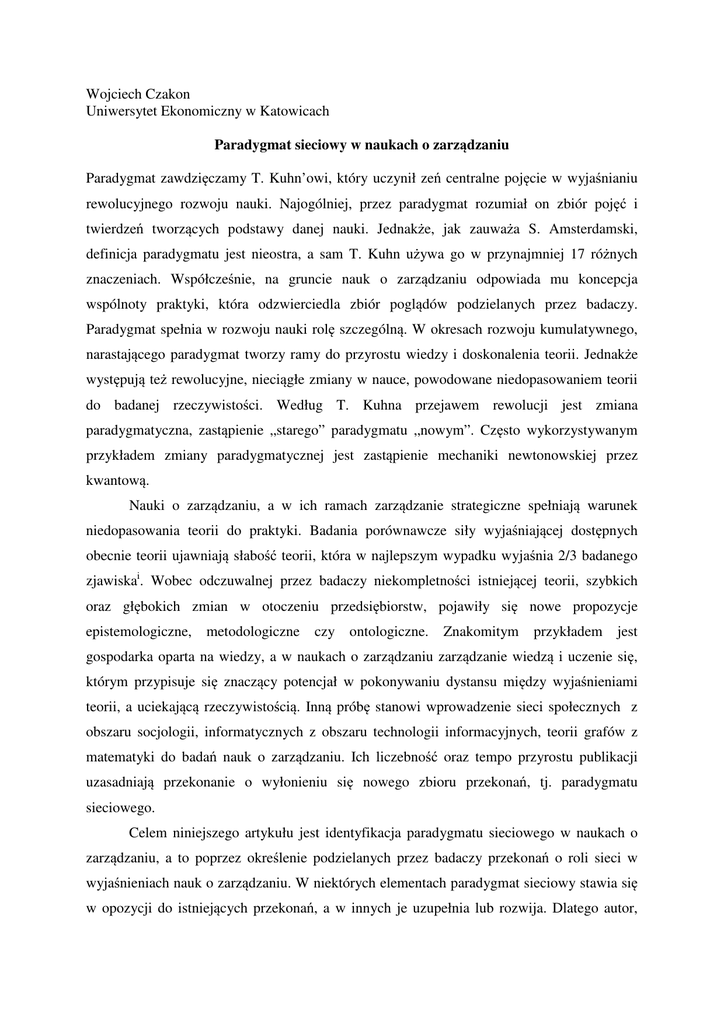 Wojciech Czakon Uniwersytet Ekonomiczny w Katowicach Paradygmat sieciowy w naukach o zarządzaniu Paradygmat zawdzięczamy T. Kuhn’owi, który uczynił zeń centralne pojęcie w wyjaśnianiu rewolucyjnego rozwoju nauki. Najogólniej, przez paradygmat rozumiał on zbiór pojęć i twierdzeń tworzących podstawy danej nauki. Jednakże, jak zauważa S. Amsterdamski, definicja paradygmatu jest nieostra, a sam T. Kuhn używa go w przynajmniej 17 różnych znaczeniach. Współcześnie, na gruncie nauk o zarządzaniu odpowiada mu koncepcja wspólnoty praktyki, która odzwierciedla zbiór poglądów podzielanych przez badaczy. Paradygmat spełnia w rozwoju nauki rolę szczególną. W okresach rozwoju kumulatywnego, narastającego paradygmat tworzy ramy do przyrostu wiedzy i doskonalenia teorii. Jednakże występują też rewolucyjne, nieciągłe zmiany w nauce, powodowane niedopasowaniem teorii do badanej rzeczywistości. Według T. Kuhna przejawem rewolucji jest zmiana paradygmatyczna, zastąpienie „starego” paradygmatu „nowym”. Często wykorzystywanym przykładem zmiany paradygmatycznej jest zastąpienie mechaniki newtonowskiej przez kwantową. Nauki o zarządzaniu, a w ich ramach zarządzanie strategiczne spełniają warunek niedopasowania teorii do praktyki. Badania porównawcze siły wyjaśniającej dostępnych obecnie teorii ujawniają słabość teorii, która w najlepszym wypadku wyjaśnia 2/3 badanego zjawiskai. Wobec odczuwalnej przez badaczy niekompletności istniejącej teorii, szybkich oraz głębokich zmian w otoczeniu przedsiębiorstw, pojawiły się nowe propozycje epistemologiczne, metodologiczne czy ontologiczne. Znakomitym przykładem jest gospodarka oparta na wiedzy, a w naukach o zarządzaniu zarządzanie wiedzą i uczenie się, którym przypisuje się znaczący potencjał w pokonywaniu dystansu między wyjaśnieniami teorii, a uciekającą rzeczywistością. Inną próbę stanowi wprowadzenie sieci społecznych z obszaru socjologii, informatycznych z obszaru technologii informacyjnych, teorii grafów z matematyki do badań nauk o zarządzaniu. Ich liczebność oraz tempo przyrostu publikacji uzasadniają przekonanie o wyłonieniu się nowego zbioru przekonań, tj. paradygmatu sieciowego. Celem niniejszego artykułu jest identyfikacja paradygmatu sieciowego w naukach o zarządzaniu, a to poprzez określenie podzielanych przez badaczy przekonań o roli sieci w wyjaśnieniach nauk o zarządzaniu. W niektórych elementach paradygmat sieciowy stawia się w opozycji do istniejących przekonań, a w innych je uzupełnia lub rozwija. Dlatego autor, inaczej niż inni badaczeii nie ma ambicji zapowiedzi napięcia paradygmatycznego skutkującej rewolucją w nauce. Badania nad sieciami w zarządzaniu strategicznym umieścić trzeba w ramach strukturalizmu, tj. nurtu myślowego, gdzie każde działanie uwarunkowane jest strukturami, w których przychodzi je realizować. Strukturalizm wywarł znaczne piętno na językoznawstwie za sprawą F. De Saussure'a, czy antropologii dzięki fundamentalnym dziełom C. LevyStrauss'a. Strukturalizm wyraża przekonanie, że nie można rozpatrywać zjawisk w oderwaniu od ich kontekstu, bowiem pozostają w ciągłej i wielokierunkowej interakcji z otoczeniem. Strukturalizm jest obecny w zarządzaniu strategicznym od samych jego początków, bowiem chandlerowski paradygmat SCP (Strategy – Conduct – Performance) wyraża zależność rezultatów działania od celowo kształtowanych struktur. Podobnie porterowska analiza otoczenia zakłada dominujący wręcz wpływ porządku otoczenia konkurencyjnego na wyniki przedsiębiorstw. Jednakże skupienie na więziach pomiędzy podmiotami badanej zbiorowości stanowi cechę wyróżniającą dopiero w paradygmacie sieciowym. Paradygmat sieciowy upowszechnił się w wielu dziedzinach, dyscyplinach i obszarach nauk ekonomicznych i pokrewnych. Uznano jego znaczenie w marketingu dla badania organizacji przyszłego wieku oraz uwarunkowań jej działaniaiii. Odzwierciedla to z jednej strony rosnąca liczba publikacji czy tempo przyrostu liczby badań usytuowanych w tym nurcie. Z drugiej strony okazało się, że dotychczasowe zawężenie zakresu badawczego marketingu do bezpośrednich, dwustronnych relacji zubaża je w zbyt znacznym stopniu. Analogiczne wnioski sformułowano na gruncie teorii organizacji. Istnienie paradygmatu sieciowego jako wspólnego zbioru założeń w teorii organizacji nie ulega wątpliwości, a co więcej pozwala na analizę kierunków dociekań oraz porządkowanie ustaleń także w obszarze nauk o organizacjiiv. Autorzy proponują wyłonienie czterech głównych obszarów dociekań: strukturalny kapitał społeczny, społeczny dostęp do zasobów, zarażanie oraz kształtowanie otoczenia. Dorobek badawczy w zarządzaniu strategicznym skłania do podjęcia analogicznego wysiłku porządkującego. Warunkuje to poprawną identyfikację składników paradygmatu sieciowego. Wyłonić można trzy główne teorie referencyjne, stosowane przez badaczy: socjologiczną teorię sieci społecznych, zasobową teorię firmy oraz teorię kosztów transakcyjnych. Struktura niniejszego artykułu odpowiada tym trzem teoriom referencyjnym. Sieci społeczne – od kontekstu do metody Do nauk ekonomicznych myślenie sieciowe przenikało bardzo powoli, być może ze względu na ugruntowane w klasycznej teorii założenie o atomizacji. Wyraża ono przekonanie o niezależnym, nieskoordynowanym i samodzielnym działaniu podmiotów rynkowych. Pierwsza znacząca publikacja kwestionująca założenie atomizacji dotyczy rynku pracy. Autor udowodnił, że skuteczność poszukiwania nowego zatrudnienia uzależniona jest od typu więzi społecznych, które poszukujący wykorzystuje by uzyskać informację o dostępnych możliwościach zatrudnieniav. Szczególne istotne okazują się być więzi słabe, tj. takie w których kontakty pomiędzy aktorami są rzadkie, nacechowane niskim poziomem emocji, krótkotrwałe.