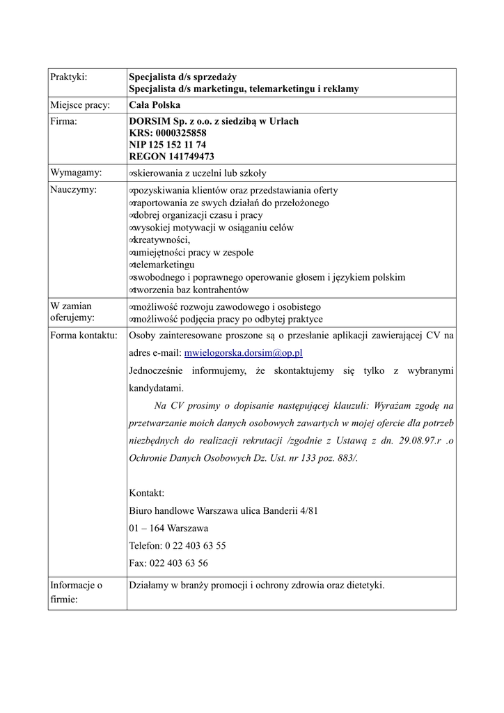 Praktyki: Specjalista d/s sprzedaży Specjalista d/s marketingu, telemarketingu i reklamy Miejsce pracy: Cała Polska Firma: DORSIM Sp. z o.o. z siedzibą w Urlach KRS: 0000325858 NIP 125 152 11 74 REGON 141749473 Wymagamy: •skierowania z uczelni lub szkoły Nauczymy: •pozyskiwania klientów oraz przedstawiania oferty •raportowania ze swych działań do przełożonego •dobrej organizacji czasu i pracy •wysokiej motywacji w osiąganiu celów •kreatywności, •umiejętności pracy w zespole •telemarketingu •swobodnego i poprawnego operowanie głosem i językiem polskim •tworzenia baz kontrahentów W zamian oferujemy: •możliwość rozwoju zawodowego i osobistego •możliwość podjęcia pracy po odbytej praktyce Forma kontaktu: Osoby zainteresowane proszone są o przesłanie aplikacji zawierającej CV na adres e-mail: [email protected] Jednocześnie informujemy, że skontaktujemy się tylko z wybranymi kandydatami. Na CV prosimy o dopisanie następującej klauzuli: Wyrażam zgodę na przetwarzanie moich danych osobowych zawartych w mojej ofercie dla potrzeb niezbędnych do realizacji rekrutacji /zgodnie z Ustawą z dn. 29.08.97.r .o Ochronie Danych Osobowych Dz. Ust. nr 133 poz. 883/. Kontakt: Biuro handlowe Warszawa ulica Banderii 4/81 01 – 164 Warszawa Telefon: 0 22 403 63 55 Fax: 022 403 63 56 Informacje o firmie: Działamy w branży promocji i ochrony zdrowia oraz dietetyki.