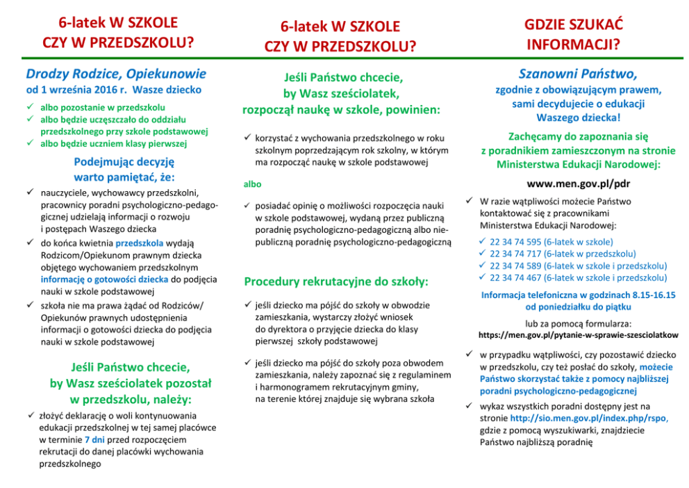 6-latek W SZKOLE CZY W PRZEDSZKOLU? 6-latek W SZKOLE CZY W PRZEDSZKOLU? Drodzy Rodzice, Opiekunowie Jeśli Państwo chcecie, by Wasz sześciolatek, rozpoczął naukę w szkole, powinien: od 1 września 2016 r. Wasze dziecko albo pozostanie w przedszkolu albo będzie uczęszczało do oddziału przedszkolnego przy szkole podstawowej albo będzie uczniem klasy pierwszej Podejmując decyzję warto pamiętać, że: nauczyciele, wychowawcy przedszkolni, pracownicy poradni psychologiczno-pedagogicznej udzielają informacji o rozwoju i postępach Waszego dziecka do końca kwietnia przedszkola wydają Rodzicom/Opiekunom prawnym dziecka objętego wychowaniem przedszkolnym informację o gotowości dziecka do podjęcia nauki w szkole podstawowej szkoła nie ma prawa żądać od Rodziców/ Opiekunów prawnych udostępnienia informacji o gotowości dziecka do podjęcia nauki w szkole podstawowej Jeśli Państwo chcecie, by Wasz sześciolatek pozostał w przedszkolu, należy: złożyć deklarację o woli kontynuowania edukacji przedszkolnej w tej samej placówce w terminie 7 dni przed rozpoczęciem rekrutacji do danej placówki wychowania przedszkolnego korzystać z wychowania przedszkolnego w roku szkolnym poprzedzającym rok szkolny, w którym ma rozpocząć naukę w szkole podstawowej GDZIE SZUKAĆ INFORMACJI? Szanowni Państwo, zgodnie z obowiązującym prawem, sami decydujecie o edukacji Waszego dziecka! Zachęcamy do zapoznania się z poradnikiem zamieszczonym na stronie Ministerstwa Edukacji Narodowej: www.men.gov.pl/pdr albo posiadać opinię o możliwości rozpoczęcia nauki w szkole podstawowej, wydaną przez publiczną poradnię psychologiczno-pedagogiczną albo niepubliczną poradnię psychologiczno-pedagogiczną Procedury rekrutacyjne do szkoły: jeśli dziecko ma pójść do szkoły w obwodzie zamieszkania, wystarczy złożyć wniosek do dyrektora o przyjęcie dziecka do klasy pierwszej szkoły podstawowej jeśli dziecko ma pójść do szkoły poza obwodem zamieszkania, należy zapoznać się z regulaminem i harmonogramem rekrutacyjnym gminy, na terenie której znajduje się wybrana szkoła W razie wątpliwości możecie Państwo kontaktować się z pracownikami Ministerstwa Edukacji Narodowej: 22 34 74 595 (6-latek w szkole) 22 34 74 717 (6-latek w przedszkolu) 22 34 74 589 (6-latek w szkole i przedszkolu) 22 34 74 467 (6-latek w szkole i przedszkolu) Informacja telefoniczna w godzinach 8.15-16.15 od poniedziałku do piątku lub za pomocą formularza: https://men.gov.pl/pytanie-w-sprawie-szesciolatkow w przypadku wątpliwości, czy pozostawić dziecko w przedszkolu, czy też posłać do szkoły, możecie Państwo skorzystać także z pomocy najbliższej poradni psychologiczno-pedagogicznej wykaz wszystkich poradni dostępny jest na stronie http://sio.men.gov.pl/index.php/rspo, gdzie z pomocą wyszukiwarki, znajdziecie Państwo najbliższą poradnię CO POMOŻE PAŃSTWU W PODJĘCIU DECYZJI? CO POMOŻE PAŃSTWU W PODJĘCIU DECYZJI? Jeśli Wasz sześciolatek: Jeśli Wasz sześciolatek: ma obniżone możliwości poznawania świata większość czasu poświęca zabawie posiada niewystarczającą wiedzę o otaczającym środowisku społeczno-przyrodniczym wymaga pomocy specjalistycznej, w tym logopedycznej ma słabo rozwinięte sprawności grafomotoryczne jest nieśmiały, wycofany, trudno mu się rozstać z bliską osobą dorosłą jest konfliktowy w relacjach z rówieśnikami nie potrafi współpracować słabo koncentruje się na wykonywanych czynnościach nie jest samodzielny słabo radzi sobie z emocjami (płaczliwość, wybuchy złości) TO BYĆ MOŻE NIE JEST GOTOWY DO PODJĘCIA NAUKI W KLASIE PIERWSZEJ uczestniczy w zabawach i grach zespołowych przestrzega reguł obowiązujących w grupie słucha ze zrozumieniem treści bajek lub wierszy rozumie polecenia nauczyciela w przedszkolu potrafi się przedstawić i powiedzieć kilka słów o sobie klasyfikuje i szereguje przedmioty orientuje się w schemacie ciała i przestrzeni wykonuje czynności samoobsługowe (ubieranie się, korzystanie z toalety, jedzenie posiłków) dba o bezpieczeństwo własne i otoczenia jest sprawny ruchowo i manualnie radzi sobie z trudnościami w obcowaniu z rówieśnikami interesuje się czytaniem i pisaniem jest ciekawy świata, otwarty na nowe doświadczenia 6-latek W SZKOLE CZY W PRZEDSZKOLU? TO PRAWDOPODOBNIE JEST GOTOWY DO PODJĘCIA NAUKI W KLASIE PIERWSZEJ ULOTKA INFORMACYJNA DLA RODZICÓW I OPIEKUNÓW PRAWNYCH W przypadku wątpliwości, czy pozostawić dziecko w przedszkolu, czy też posłać do szkoły, możecie Państwo skorzystać z pomocy najbliższej poradni psychologiczno-pedagogicznej W przypadku wątpliwości, czy pozostawić dziecko w przedszkolu, czy też posłać do szkoły, możecie Państwo skorzystać z pomocy najbliższej poradni psychologiczno-pedagogicznej