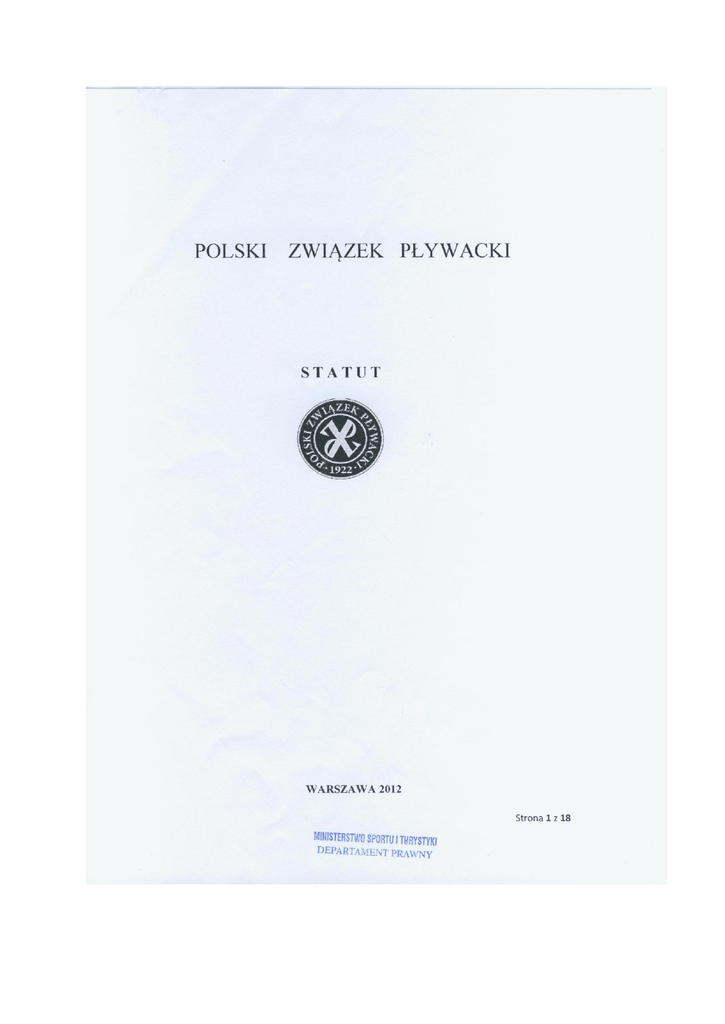 Strona 1 z 18 ROZDZIAŁ I NAZWA, TEREN DZIAŁANIA, SIEDZIBA, CHARAKTER PRAWNY §1 1. Polski Związek Pływacki, w skrócie PZP, zwany dalej Związkiem jest dobrowolnym, samorządnym polskim związkiem sportowym. 2. W kontaktach międzynarodowych Związek obok nazwy polskiej może używać nazwy w języku angielskim: Polish Swimming Federation. §2 1. Terenem działania Związku jest obszar Rzeczypospolitej Polskiej. 2. Dla realizacji swych celów statutowych Związek może, z zastrzeżeniem obowiązujących w tym zakresie przepisów oraz umów międzynarodowych, prowadzić działalność poza granicami Rzeczypospolitej Polskiej. 3. Siedzibą Związku jest miasto stołeczne Warszawa. §3 1. Związek działa na podstawie powszechnie obowiązującego prawa i niniejszego statutu. 2. Związek podlega rejestracji w Krajowym Rejestrze Sądowym i posiada osobowość prawną w rozumieniu obowiązujących przepisów. 3. Związek samodzielnie określa swoje cele, programy działania i struktury organizacyjne. 4. Organem nadzorującym działalność Związku jest minister właściwy do spraw kultury fizycznej. §4 1. Związek opiera swą działalność na pracy społecznej członków, zrzeszonych w nim organizacji oraz działaczy. 2. Do prowadzenia swoich spraw Związek może zatrudniać osoby w charakterze pracowników lub zleceniobiorców. §5 1. Związek posiada własne znaki i odznaki organizacyjne oraz używa pieczęci, zgodnie z obowiązującymi w tym zakresie przepisami. 2. Znakiem Związku jest krzyżowy układ stylizowanych liter PZP na okrągłej tarczy z napisem w otoku: Polski Związek Pływacki 1922. Tło tarczy w kolorze niebieskim. Litery i napisy koloru złotego. §6 Strona 2 z 18 1. Związek jest członkiem Polskiego Komitetu Olimpijskiego, w skrócie PKOl. 2. Związek jest członkiem Międzynarodowej Federacji Pływania, w skrócie FINA oraz Europejskiej Ligi Pływania, w skrócie LEN. 3. Związek, w celu realizacji swych celów statutowych, może współpracować lub przystępować do organizacji międzynarodowych i krajowych w granicach prawem dozwolonych. §7 1. Związek może prowadzić działalność gospodarczą według ogólnych zasad, określonych w odrębnych przepisach. 2. Dochód z działalności gospodarczej Związku służy realizacji celów statutowych i nie może być przeznaczony do podziału pomiędzy członków Związku. §8 Związek działa w dziedzinie sportu pływackiego i jest polskim związkiem sportowym w rozumieniu właściwych przepisów. Związek jest jedynym reprezentantem polskiego sportu pływackiego w kraju i za granicą. §9 Czas trwania Związku jest nieograniczony. ROZDZIAŁ II CELE I ŚRODKI DZIAŁANIA § 10 Podstawowymi celami Związku są: 1. Realizacja zadań publicznych w zakresie upowszechniania kultury fizycznej i sportu, w szczególności sportu pływackiego, w tym sportu zawodników niepełnosprawnych i niesłyszących. 2. Wszechstronny rozwój i upowszechnianie wszystkich dyscyplin sportu zaliczonych do sportu pływackiego: pływania, pływania na wodach otwartych, pływania synchronicznego, skoków do wody, piłki wodnej oraz pływania Masters, z możliwością wykorzystania opieki medycznej oraz leków i odżywek. 3. Reprezentowanie, ochrona praw i interesów oraz koordynacja działań wszystkich członków Związku. § 11 Do podstawowych zadań Związku należą: Strona 3 z 18 1. Organizowanie i prowadzenie współzawodnictwa sportowego o tytuł Mistrza Polski oraz o Puchar Polski w sporcie pływackim. 2. Powoływanie kadry narodowej oraz przygotowanie jej do igrzysk olimpijskich, igrzysk paraolimpijskich, igrzysk głuchych, mistrzostw świata lub mistrzostw Europy. 3. Powoływanie reprezentacji do innych imprez międzynarodowych. 4. Reprezentowanie polskiego sportu pływackiego w międzynarodowych organizacjach oraz organizowanie udziału wszystkich dyscyplin sportu pływackiego w międzynarodowym współzawodnictwie sportowym. 5. Ustanawianie i realizacja reguł sportowych, organizacyjnych i dyscyplinarnych we współzawodnictwie sportowym organizowanym przez Związek. 6. Współpraca z instytutami, placówkami naukowymi oraz uczelniami w zakresie badań służących wdrażaniu rozwiązań podnoszących poziom wyszkolenia, specjalistycznej opieki medycznej, psychologii itp. na użytek sportu pływackiego. 7. Działalność wychowawcza i popularyzatorska w zakresie wszystkich dyscyplin zaliczonych do sportu pływackiego. 8. Szkolenie, doskonalenie i nadawanie uprawnień trenersko-instruktorskich oraz sędziowskich we wszystkich dyscyplinach zaliczonych do sportu pływackiego. 9. Wspieranie, w tym materialne, działalności statutowej członków zwyczajnych Związku, o których mowa w § 13 ust.1 pkt 1. 10. Działania zapewniające bezpieczne warunki uprawiania wszystkich dyscyplin sportu pływackiego. 11. Organizowanie współpracy, wzajemnej pomocy oraz przedsięwzięć integrujących członków Związku. 12. Opiniowanie projektów przepisów wykonawczych, bądź innych przepisów dotyczących wszystkich dyscyplin sportu pływackiego. 13. Współdziałanie z Komisją do Zwalczania Dopingu w Sporcie oraz działania własne zwalczające zjawiska dopingu w pływaniu sportowym. 14. Podejmowanie inicjatyw w zakresie budownictwa obiektów oraz modernizacji istniejącej bazy dla sportu pływackiego. 15. Działalność wydawnicza i propagandowa upowszechniająca techniczne, szkoleniowe i medyczne podstawy sportu pływackiego. 16. Współpraca z placówkami medycyny sportowej w zakresie przewidzianym stosownymi przepisami. 17. Współpraca z organami administracji rządowej i samorządu terytorialnego oraz ze wszystkimi organizacjami i instytucjami zainteresowanymi rozwojem sportu pływackiego. 18. Prowadzenie wszechstronnej działalności dla uzyskania w sposób prawem dozwolony środków materialnych na cele statutowe. 19. Nadzorowanie przestrzegania przez członków Związku statutu, regulaminów i uchwał władz Związku. 20. Rozstrzygani